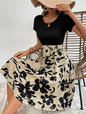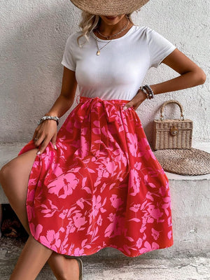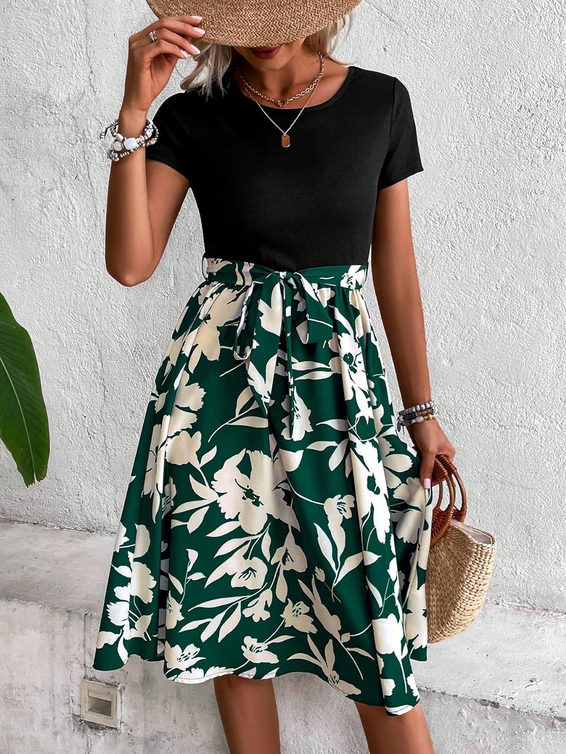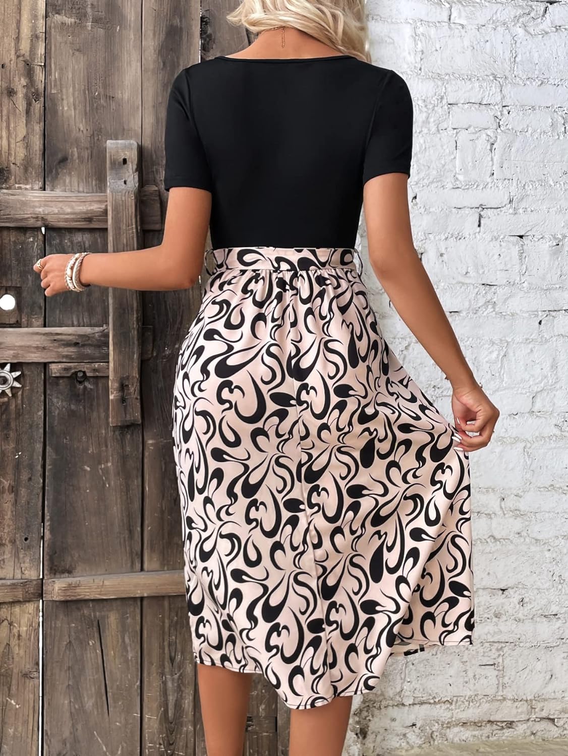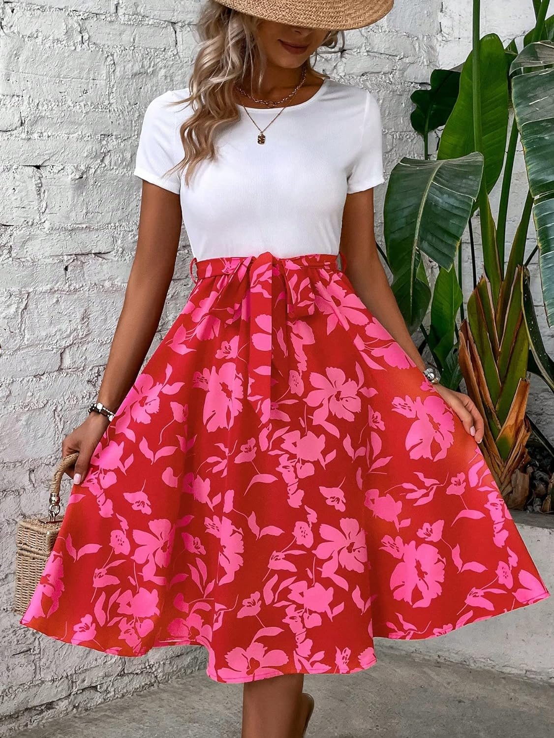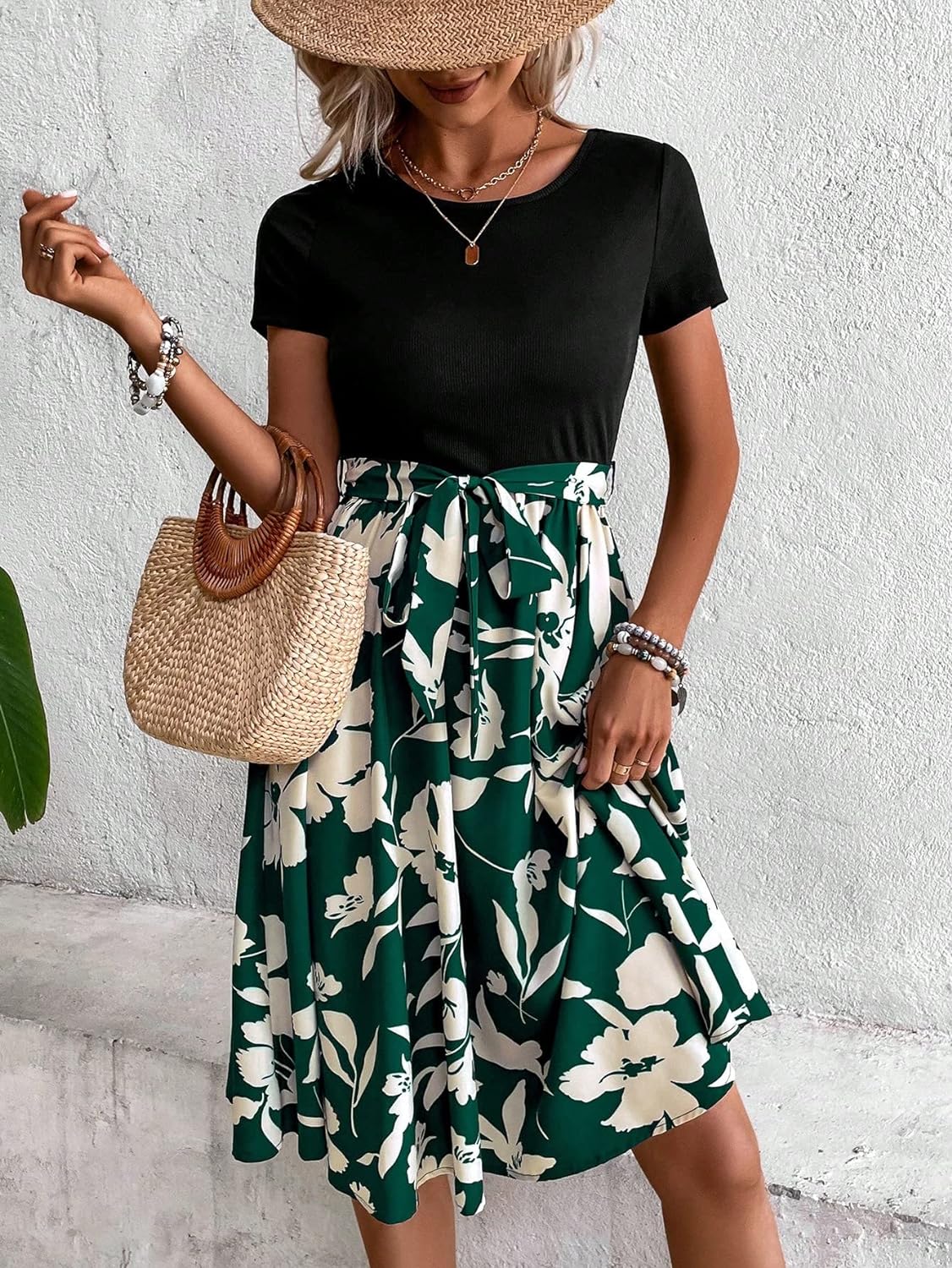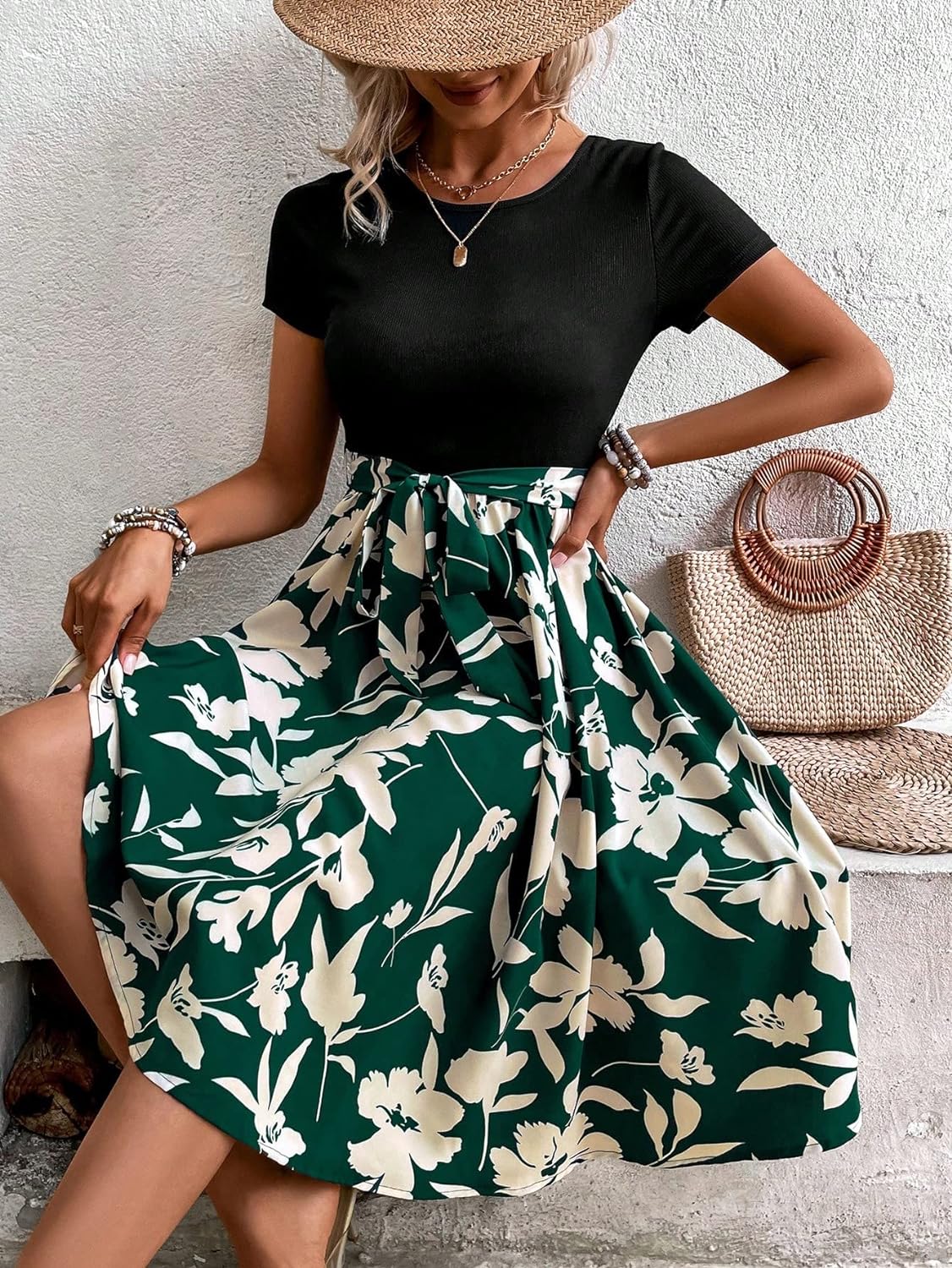 SweatyRocks Women's Graphic Short Sleeve Belted Mini Dress A Line Flared Skater Dresses/ Pattern Type: Colorblock, Graphic/ Details: Belted/ Season: Summer/ Type: A Line/ Neckline: Round Neck/ Sleeve Length: Short Sleeve/ Sleeve Type: Regular Sleeve/ Waist Line: High Waist/ Hem Shaped: Flared/ Length: Short/ Fit Type: Regular Fit/ Fabric: Medium Stretch/ Sheer: No/
