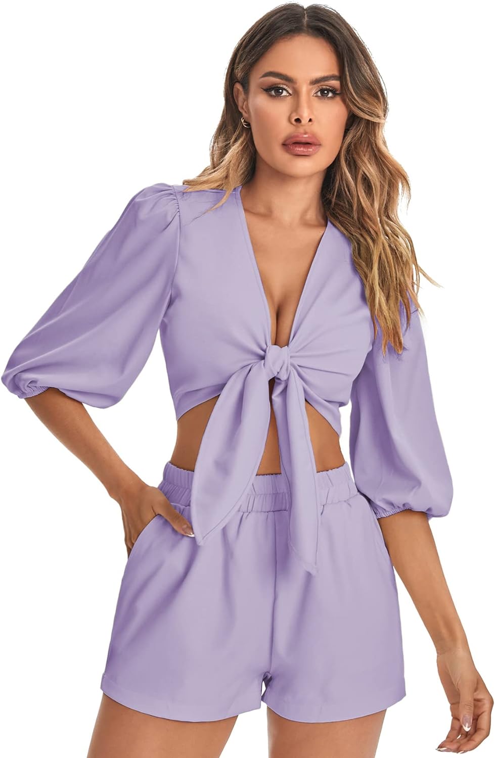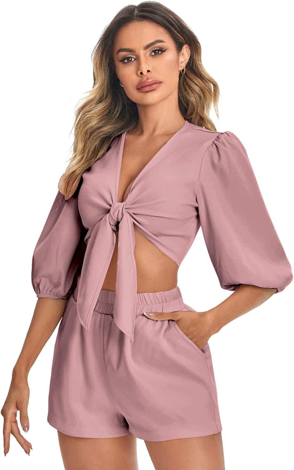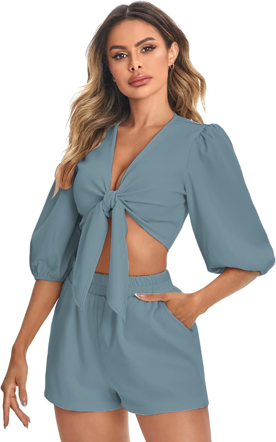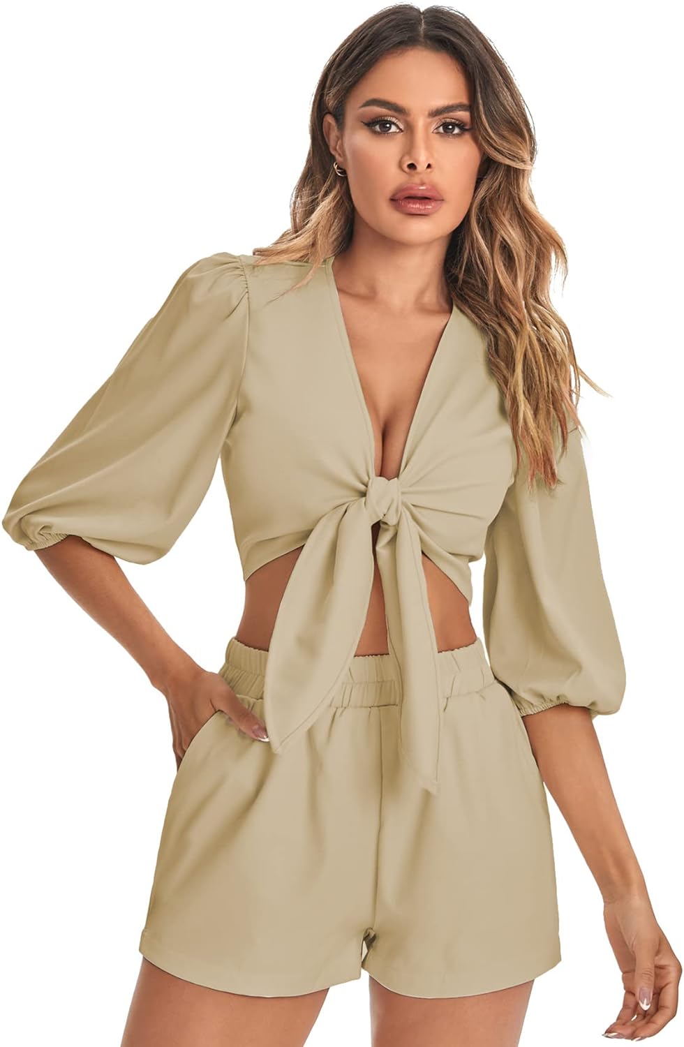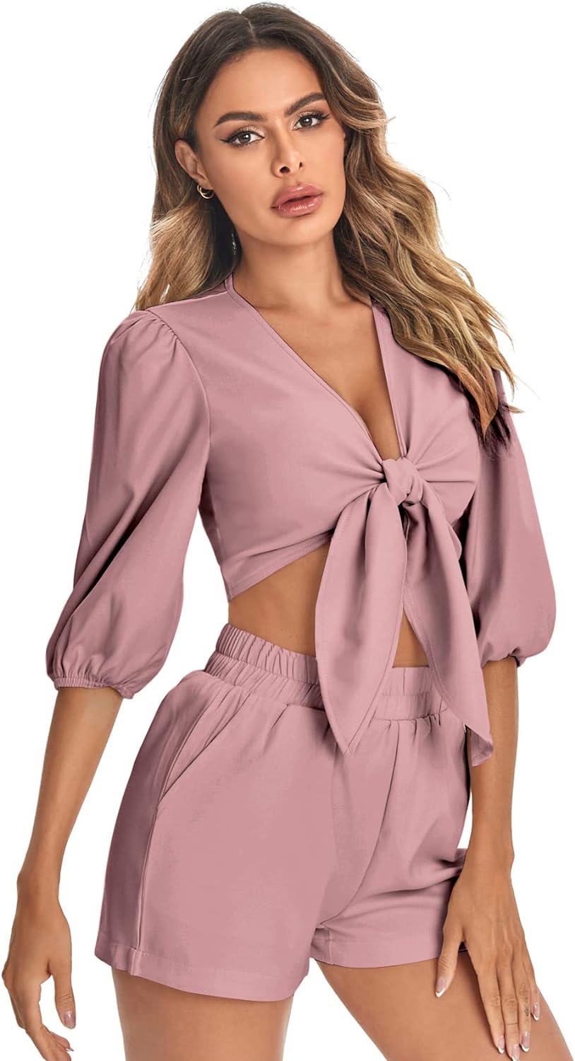 SweatyRocks Women's Summer 2 Piece Outfits Lantern Sleeve V Neck Tie Front Crop Top and Shorts Set/ Pattern Type: Plain/ Details: Tie Front/ Season: Summer/ Top Type: Women Tops/ Bottom Type: Shorts/ Neckline: Deep V Neck/ Sleeve Length: Half Sleeve/ Sleeve Type: Bishop Sleeve/ Fit Type: Regular Fit/ Fabric: Non-Stretch/ Sheer: No/