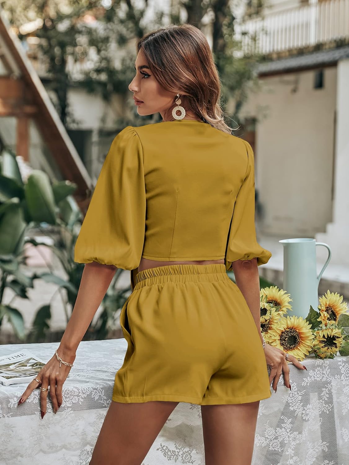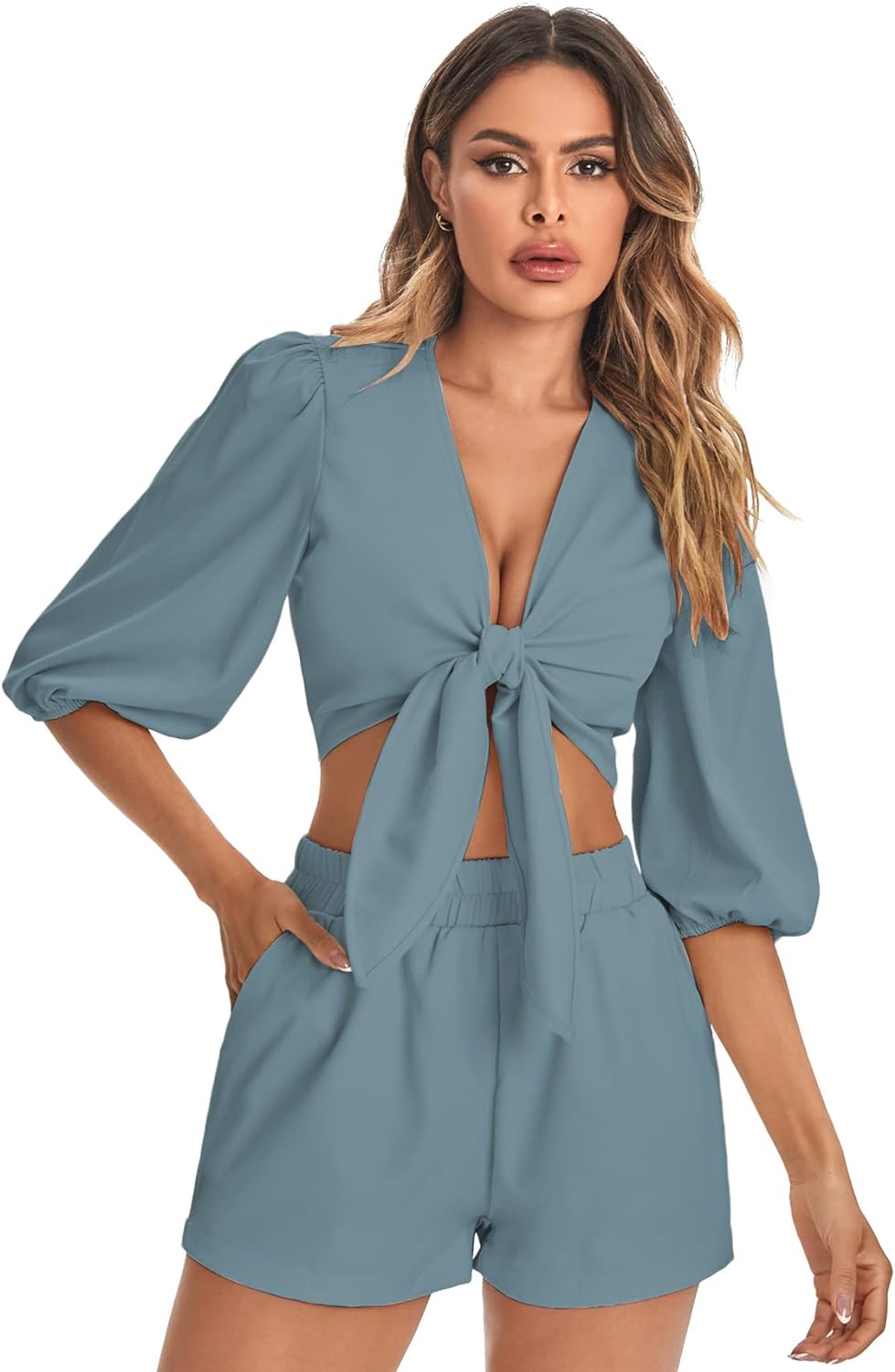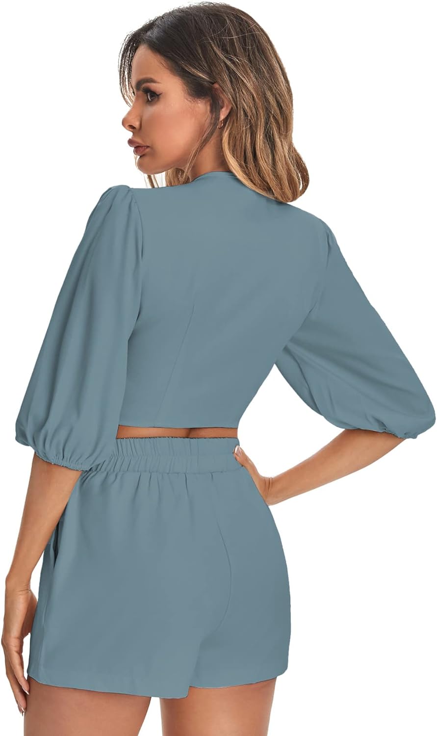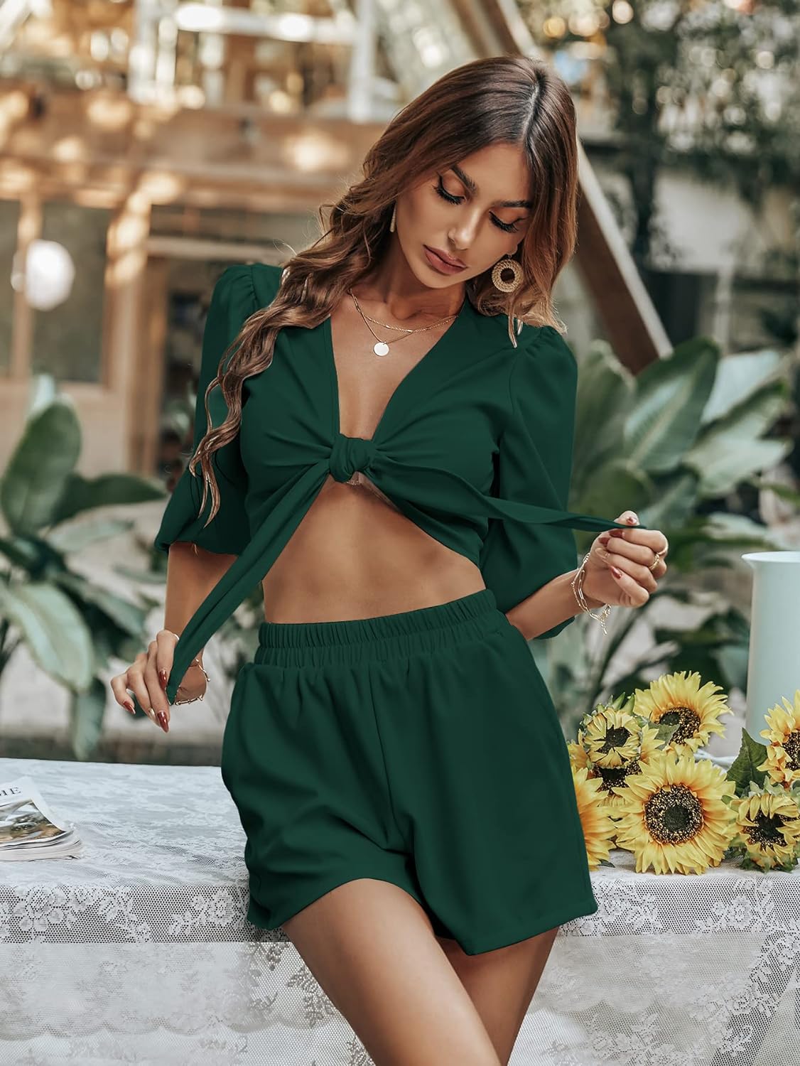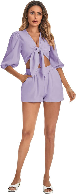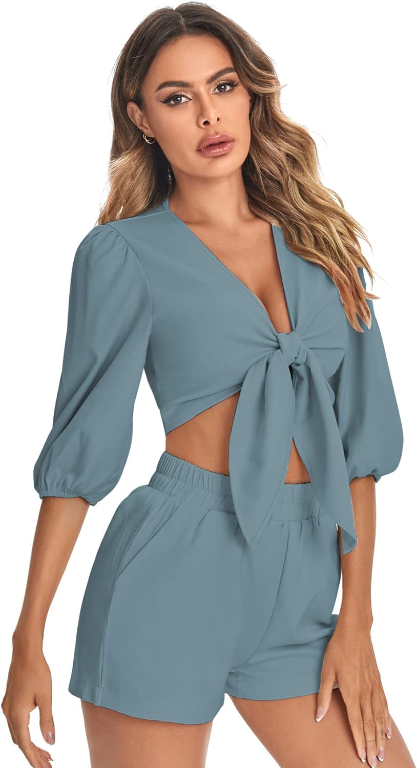 SweatyRocks Women's Summer 2 Piece Outfits Lantern Sleeve V Neck Tie Front Crop Top and Shorts Set/ Pattern Type: Plain/ Details: Tie Front/ Season: Summer/ Top Type: Women Tops/ Bottom Type: Shorts/ Neckline: Deep V Neck/ Sleeve Length: Half Sleeve/ Sleeve Type: Bishop Sleeve/ Fit Type: Regular Fit/ Fabric: Non-Stretch/ Sheer: No/