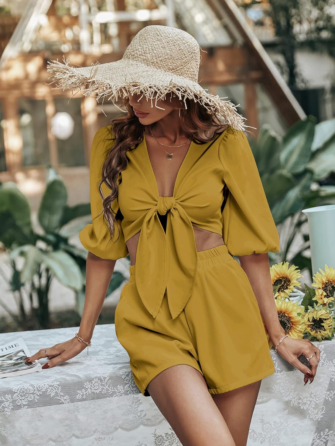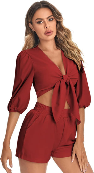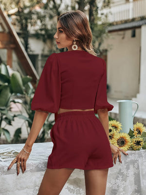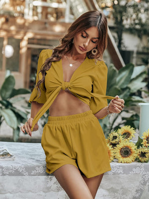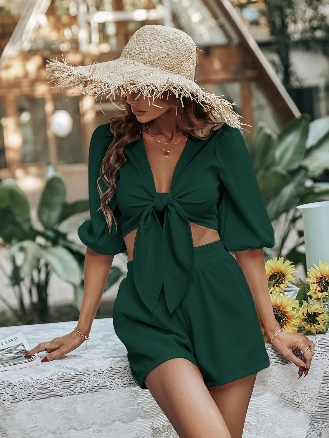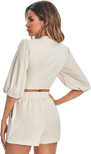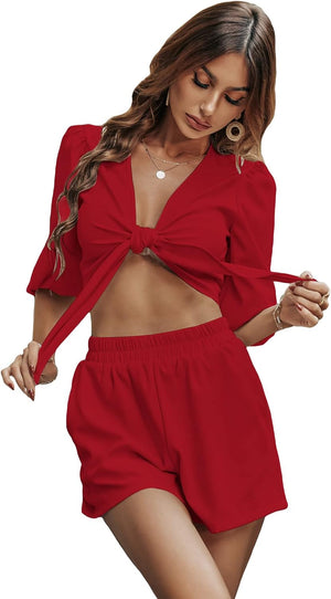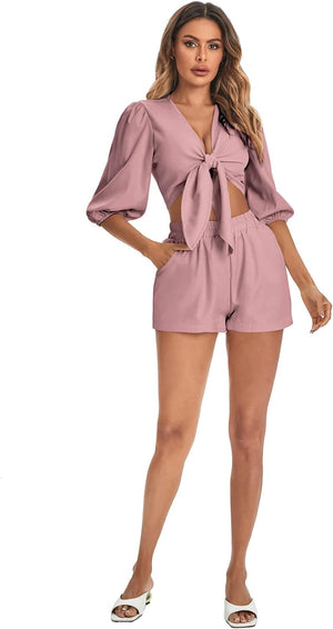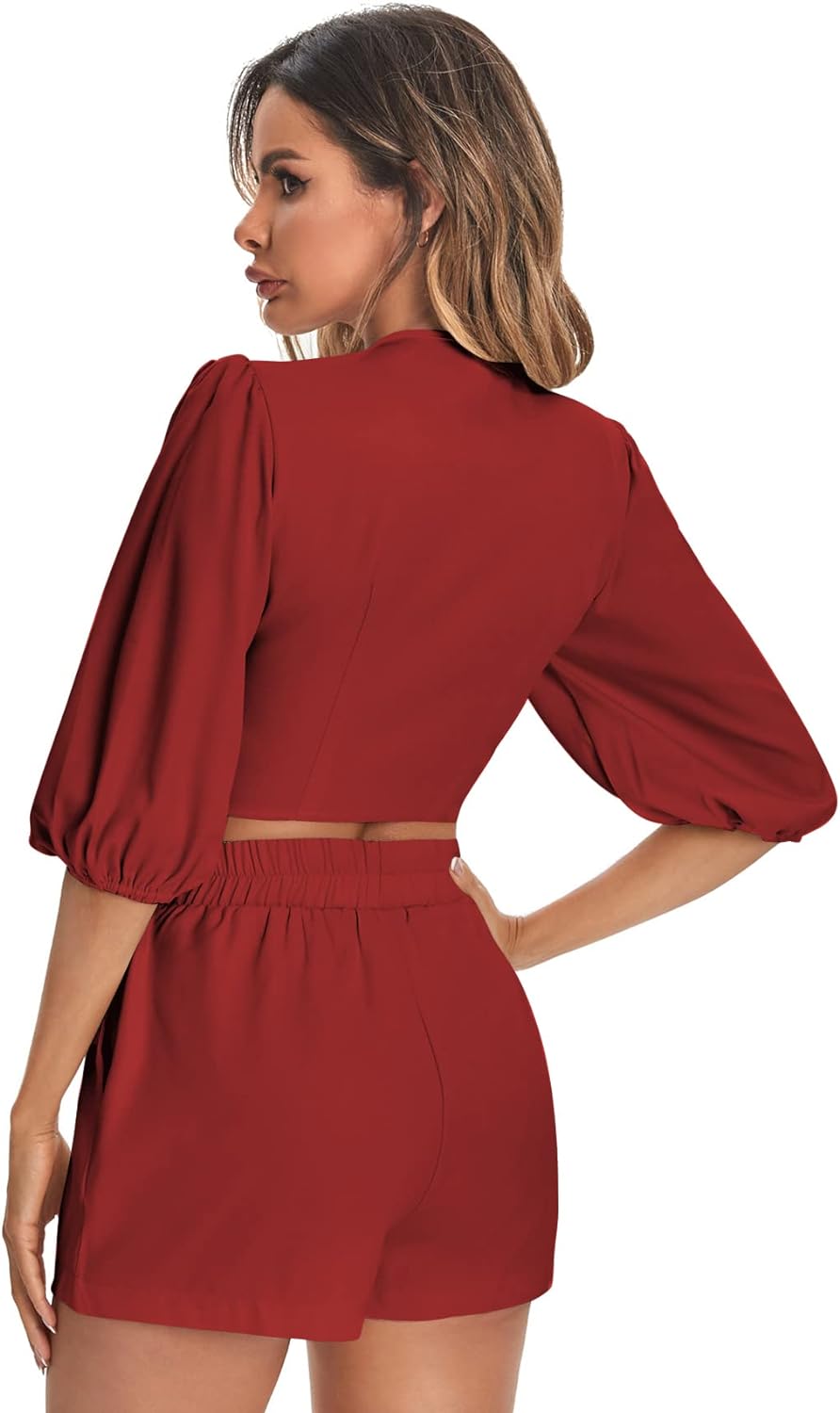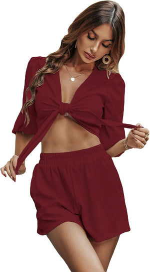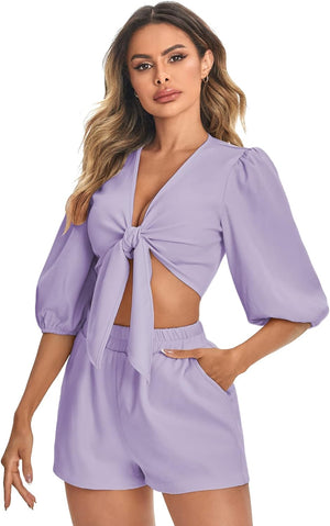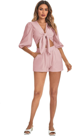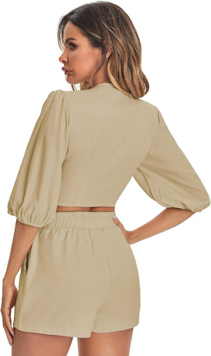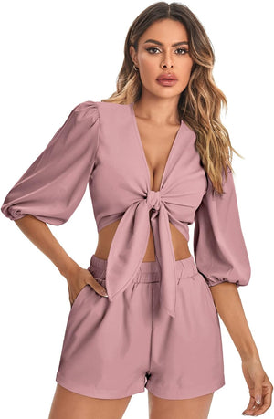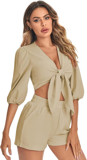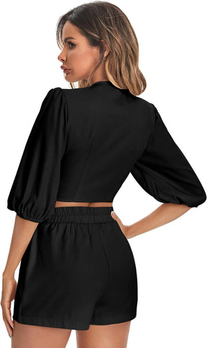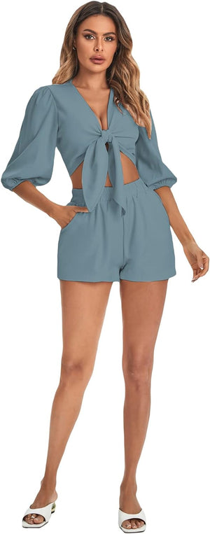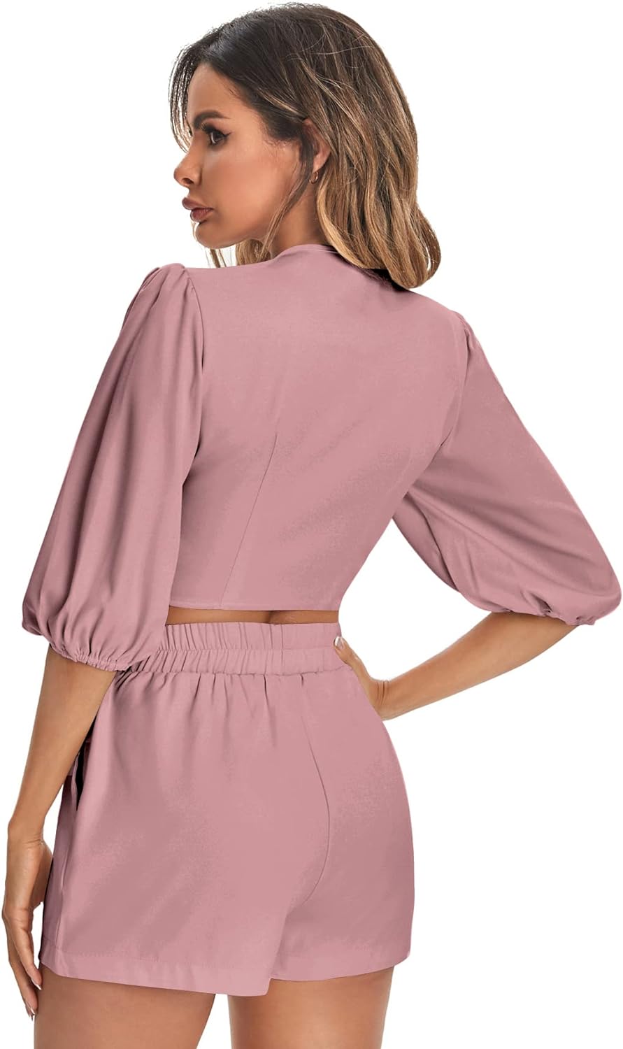 SweatyRocks Women's Summer 2 Piece Outfits Lantern Sleeve V Neck Tie Front Crop Top and Shorts Set/ Pattern Type: Plain/ Details: Tie Front/ Season: Summer/ Top Type: Women Tops/ Bottom Type: Shorts/ Neckline: Deep V Neck/ Sleeve Length: Half Sleeve/ Sleeve Type: Bishop Sleeve/ Fit Type: Regular Fit/ Fabric: Non-Stretch/ Sheer: No/
