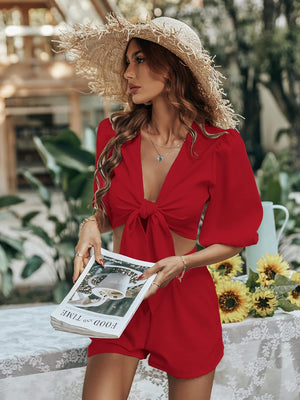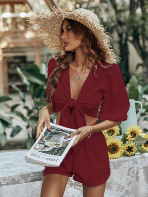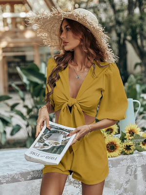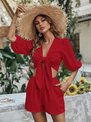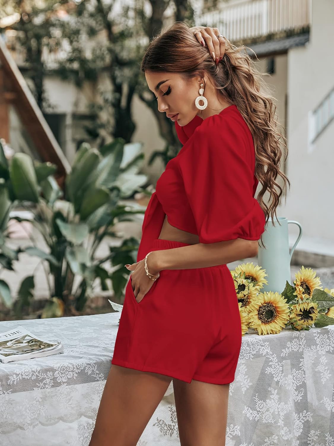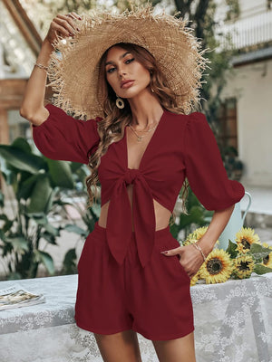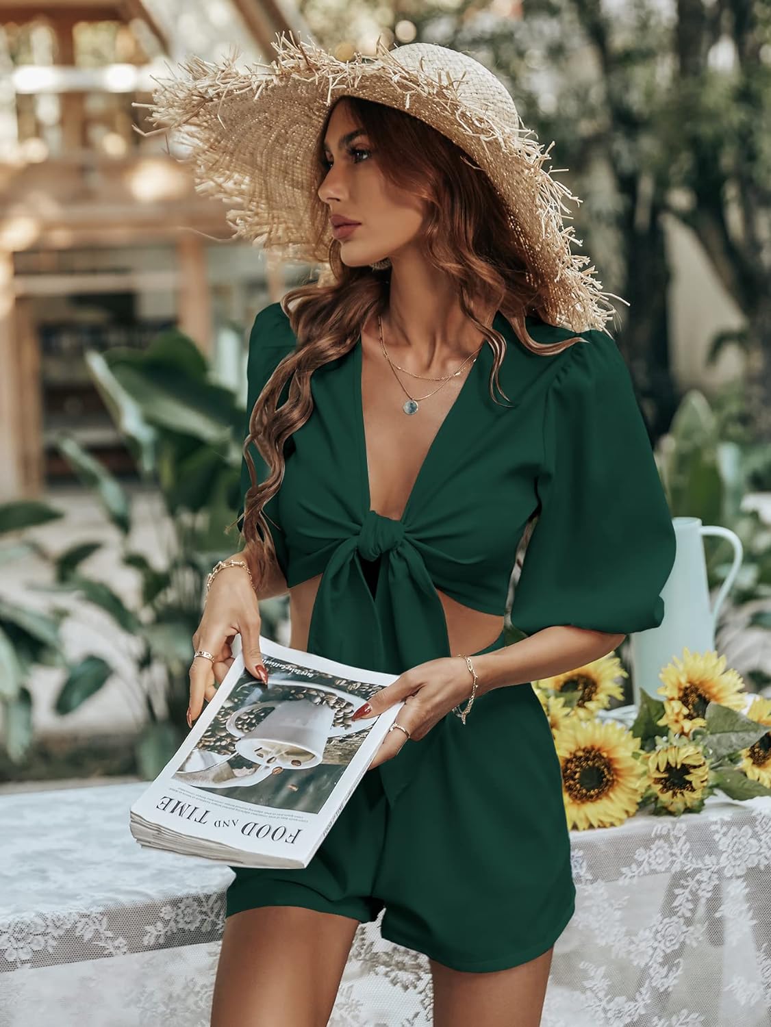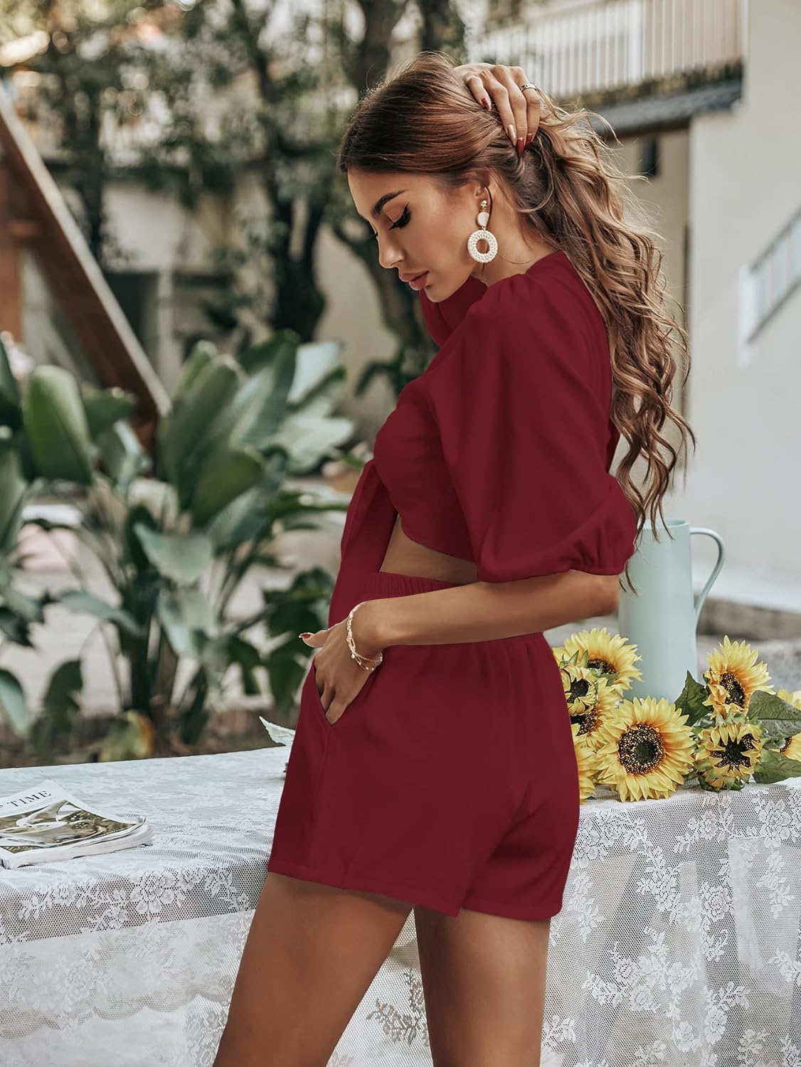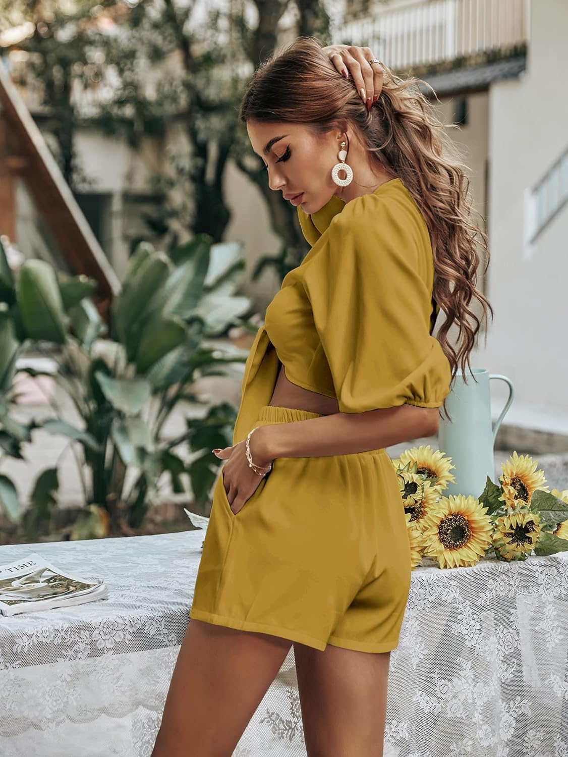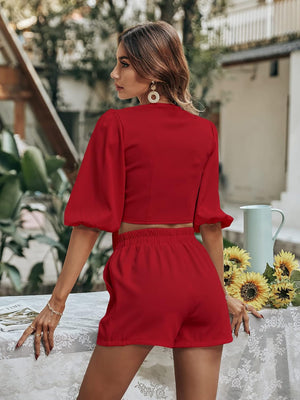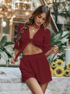SweatyRocks Women's Summer 2 Piece Outfits Lantern Sleeve V Neck Tie Front Crop Top and Shorts Set/ Pattern Type: Plain/ Details: Tie Front/ Season: Summer/ Top Type: Women Tops/ Bottom Type: Shorts/ Neckline: Deep V Neck/ Sleeve Length: Half Sleeve/ Sleeve Type: Bishop Sleeve/ Fit Type: Regular Fit/ Fabric: Non-Stretch/ Sheer: No/