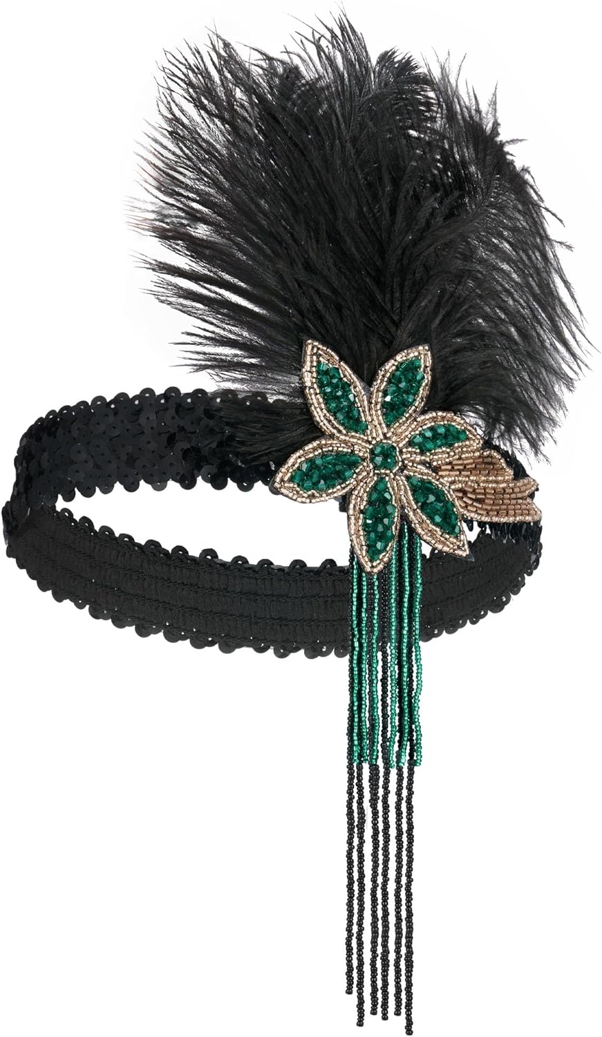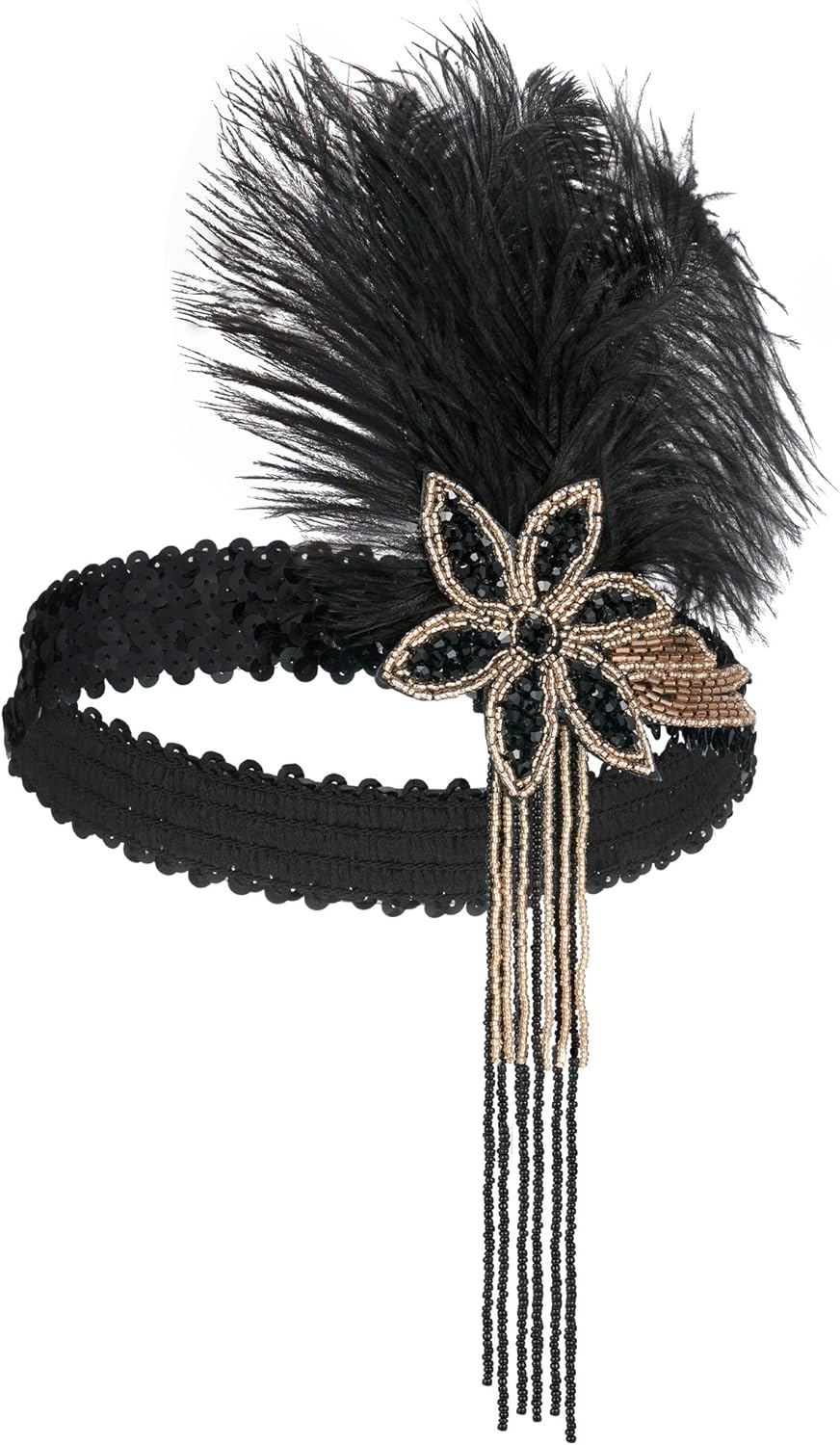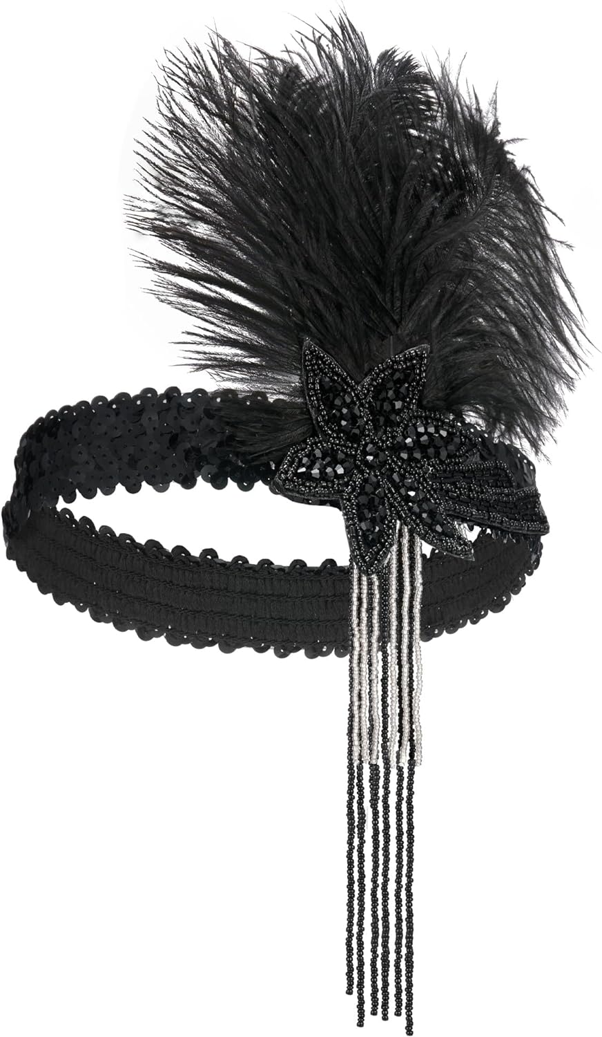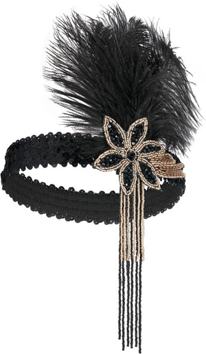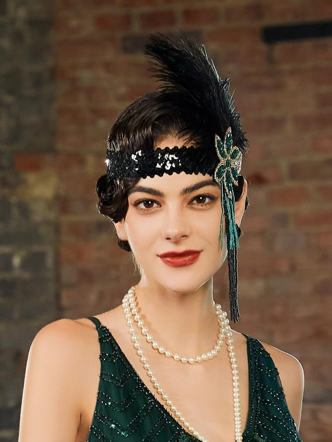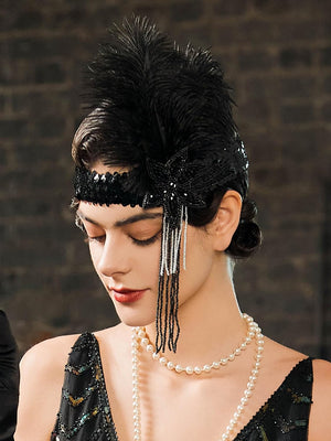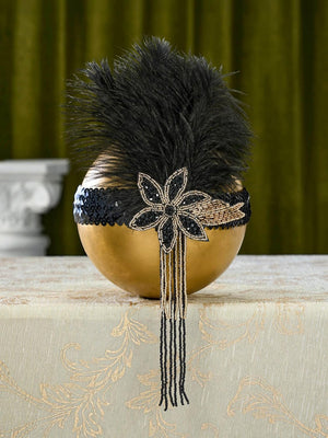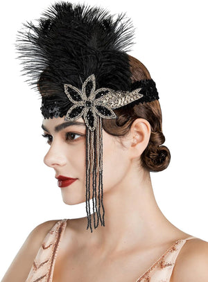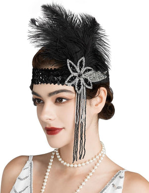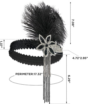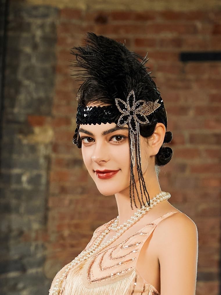 SWEETV 1920s Flapper Feather Headband Sequined Roaring 20s Gatsby Showgirl Headpiece Hair Accessories