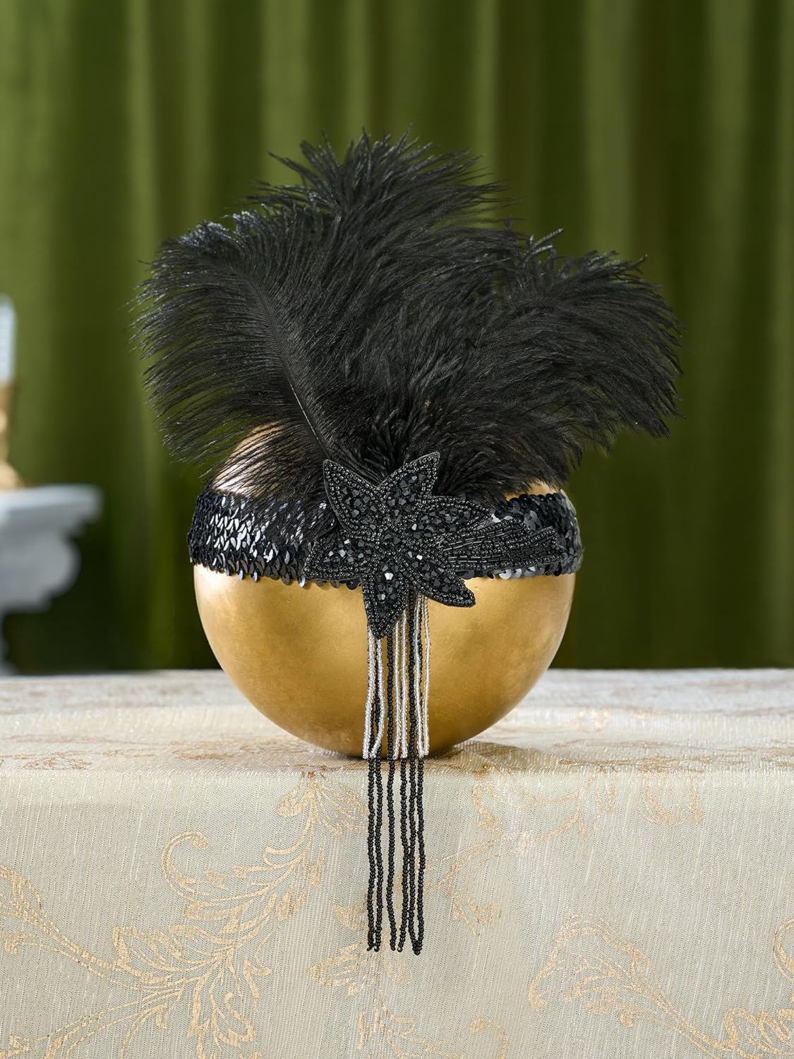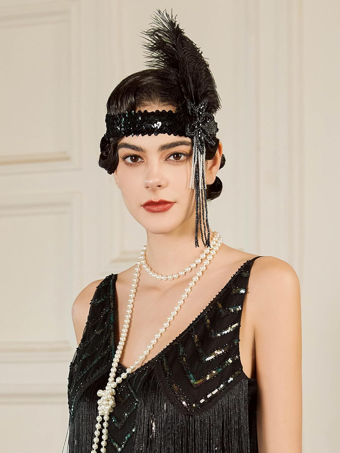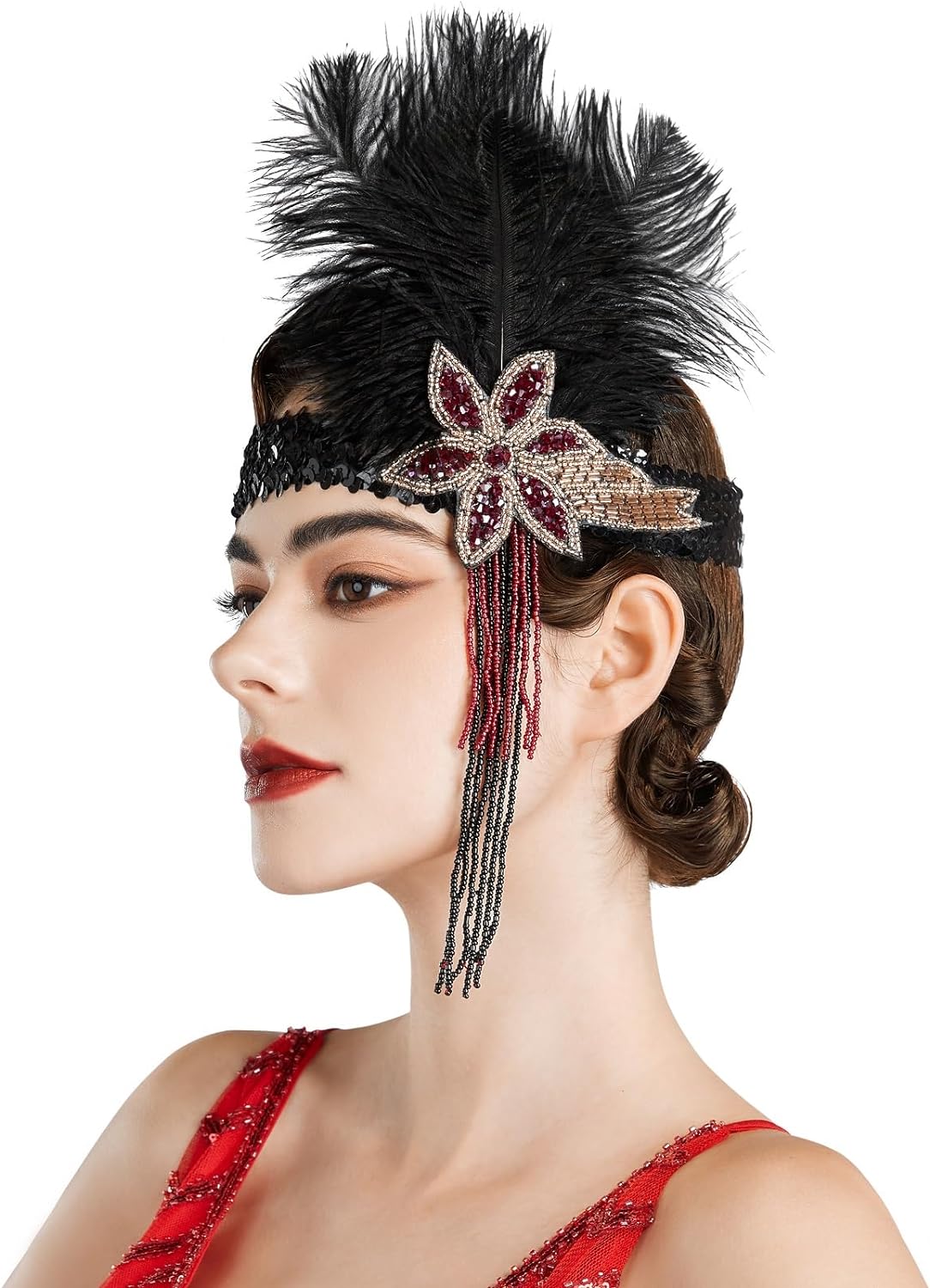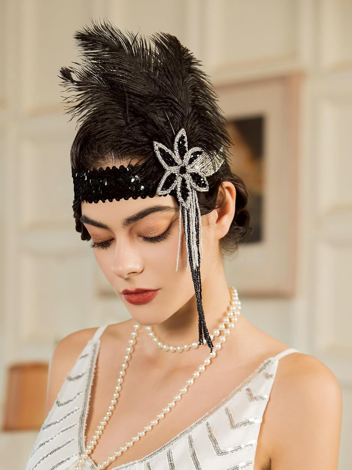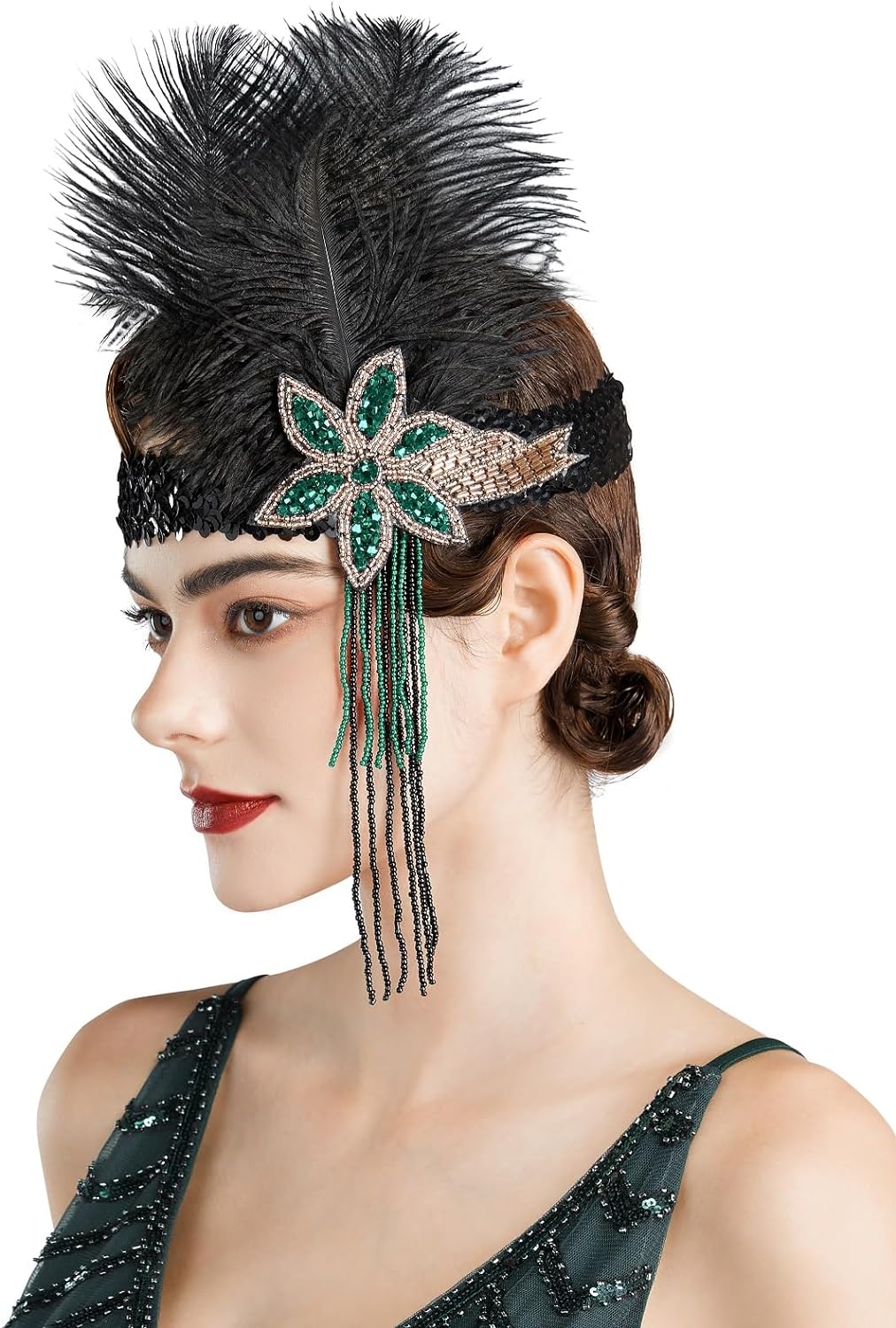 SWEETV 1920s Flapper Feather Headband Sequined Roaring 20s Gatsby Showgirl Headpiece Hair Accessories