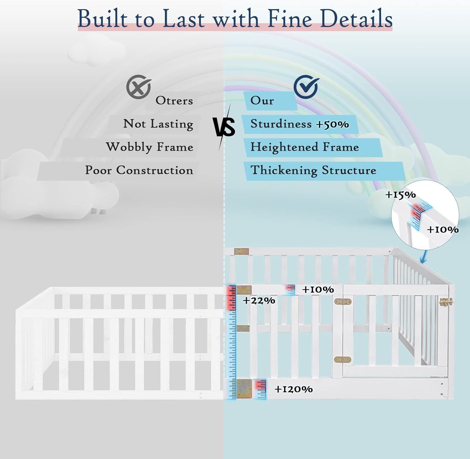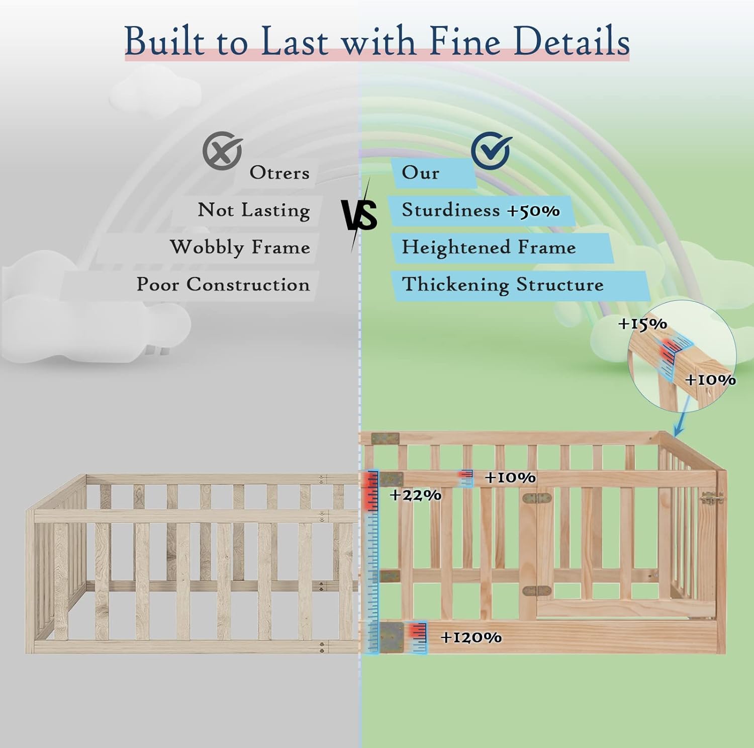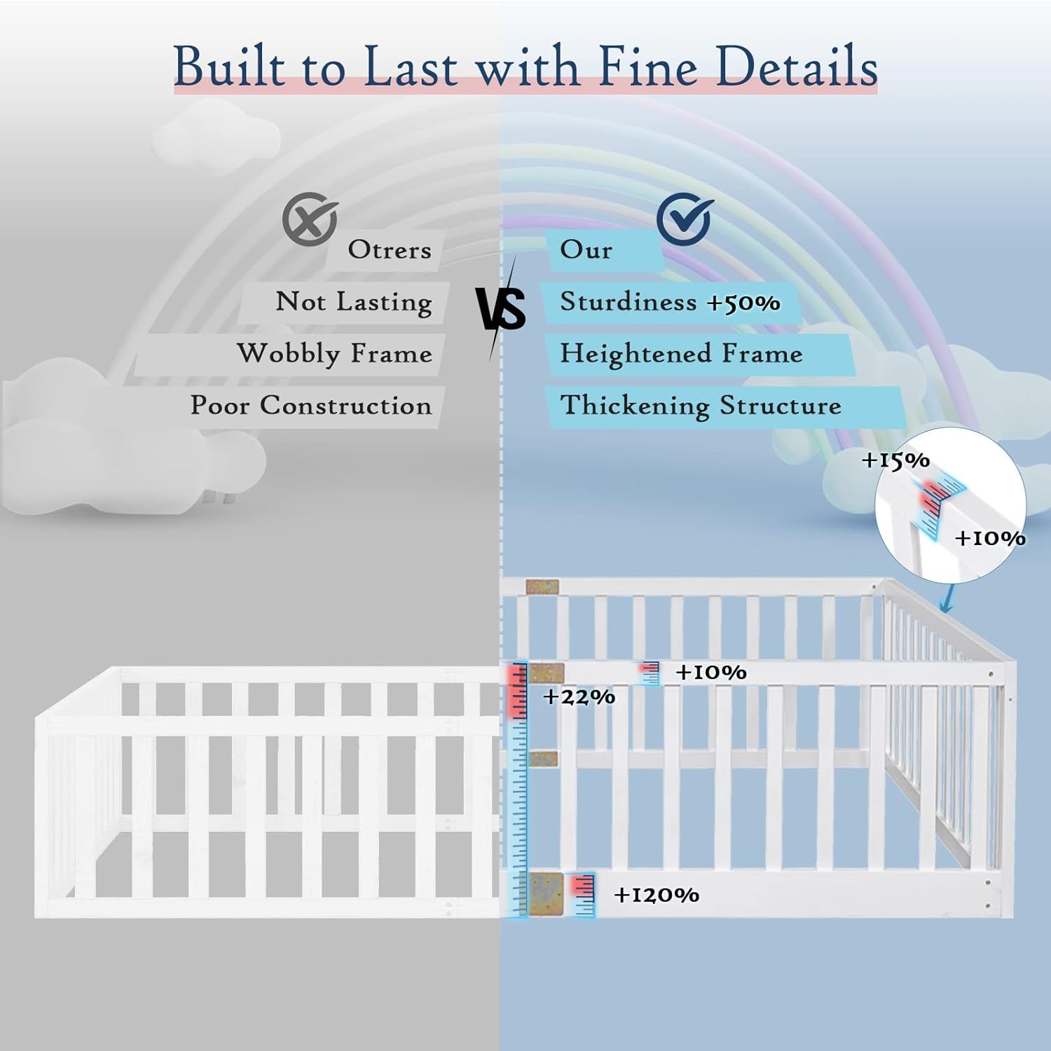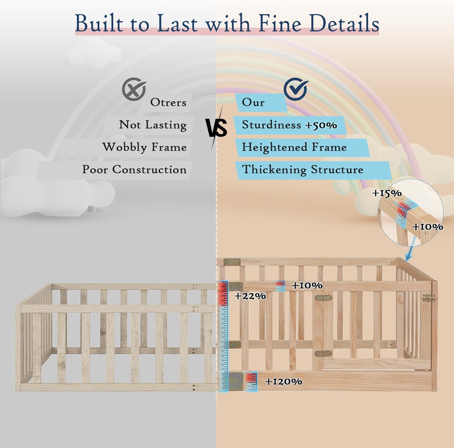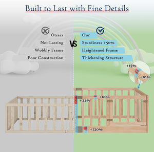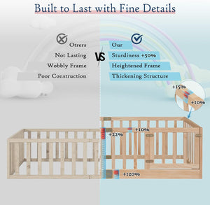 - 【Long-lasting Solid Structure】Upgraded thickened frame supports durability. This kids floor bed is easy to assemble less than a 30-minute assembly