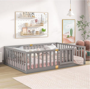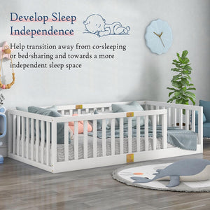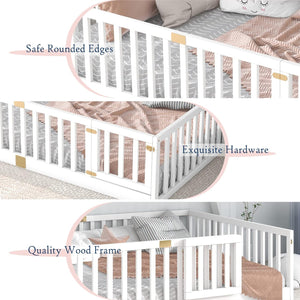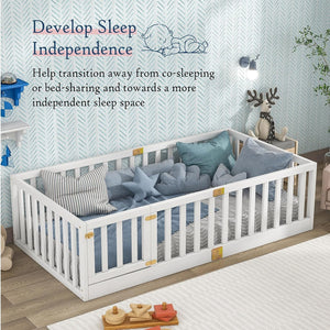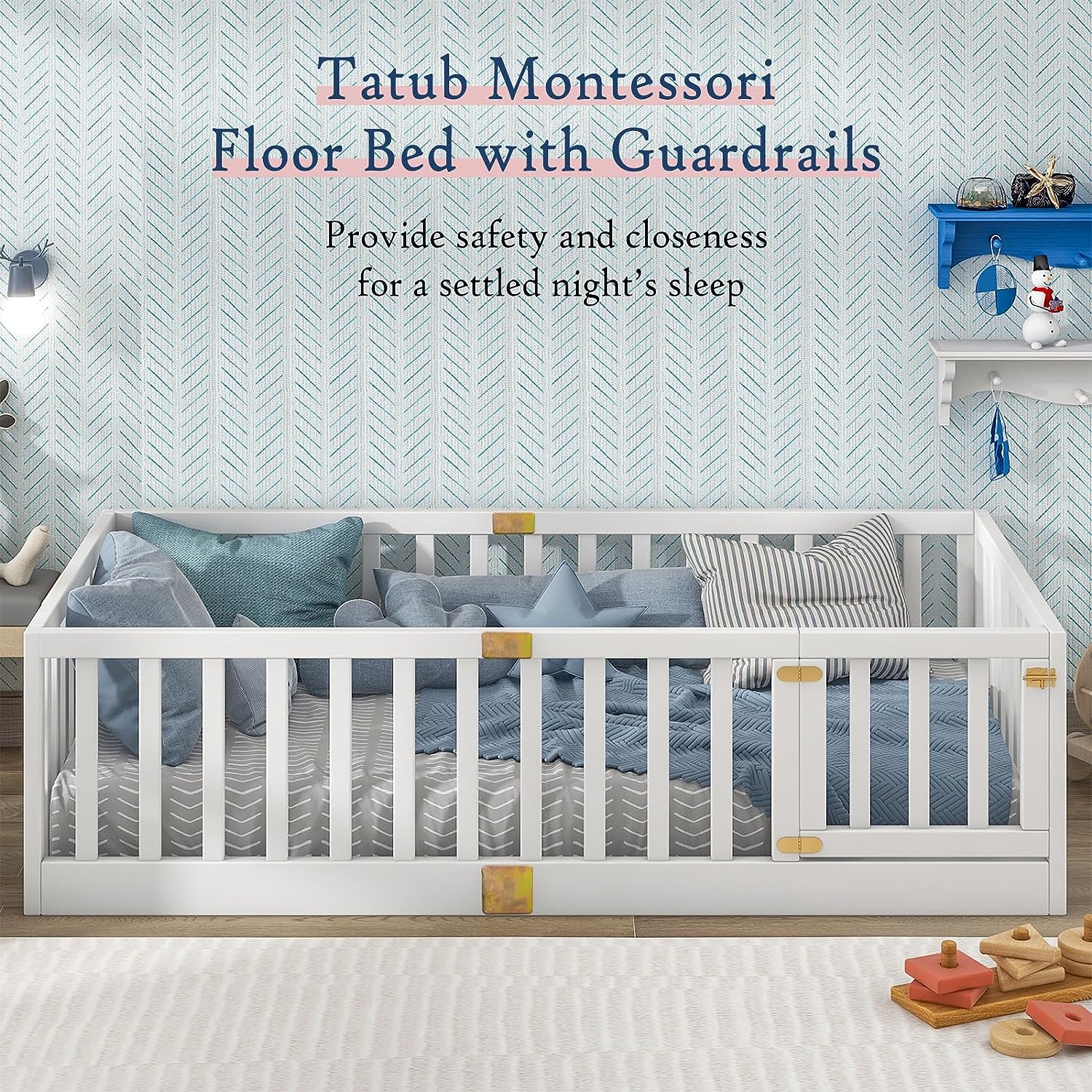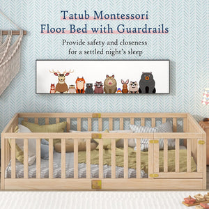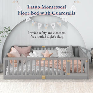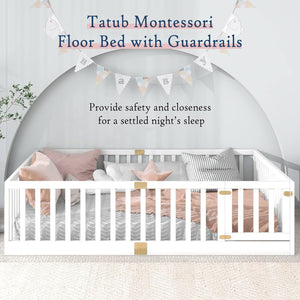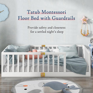 Tatub kids floor bed with railings for boys and girls. You can use it as a bed, a child's play space, a reading place and so on. The railings surrounded and low profile design keep the sleeping space safer. The montessori floor beds provide children more access to books and quiet toys when they first rise in the morning or wake up from naps. And the montessori kids bed supports the child's development of independence by allowing them to get into and out of bed independently. And can help transition away from co-sleeping or bed-sharing and towards a more independent sleep space. It's a perfect first montessori bed for kids.