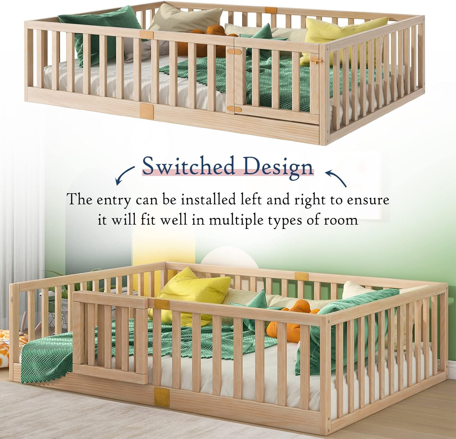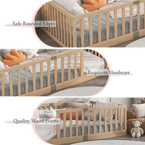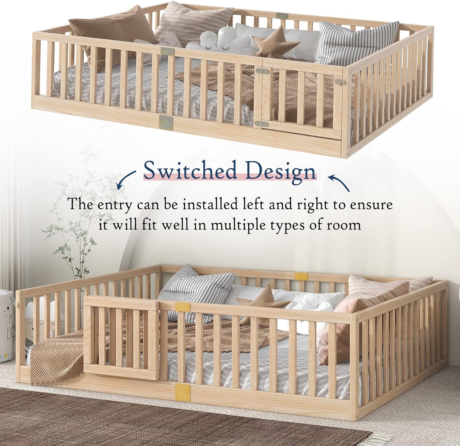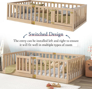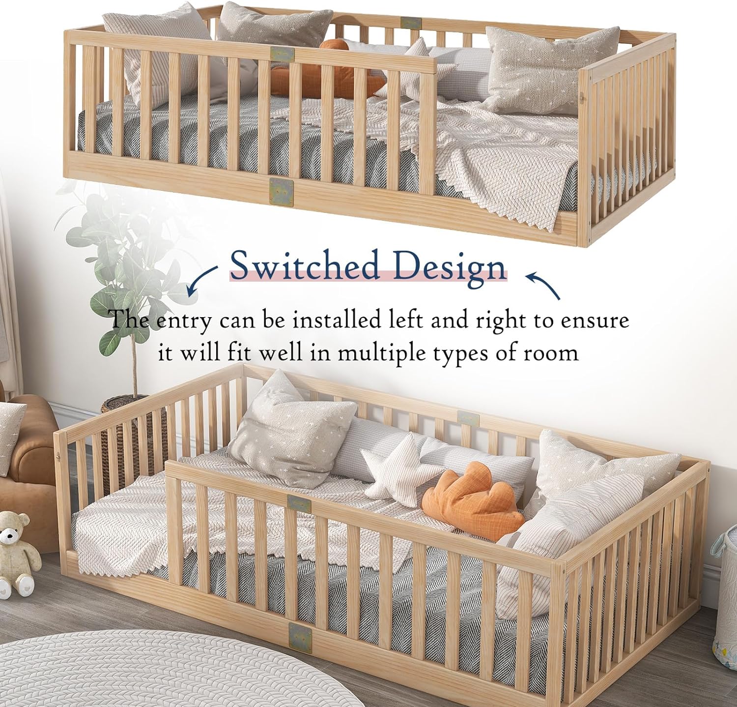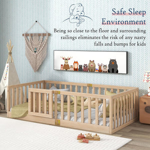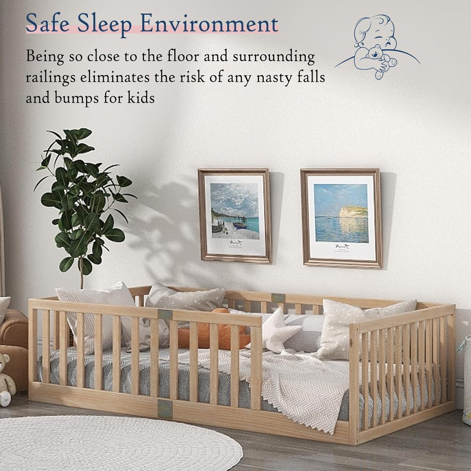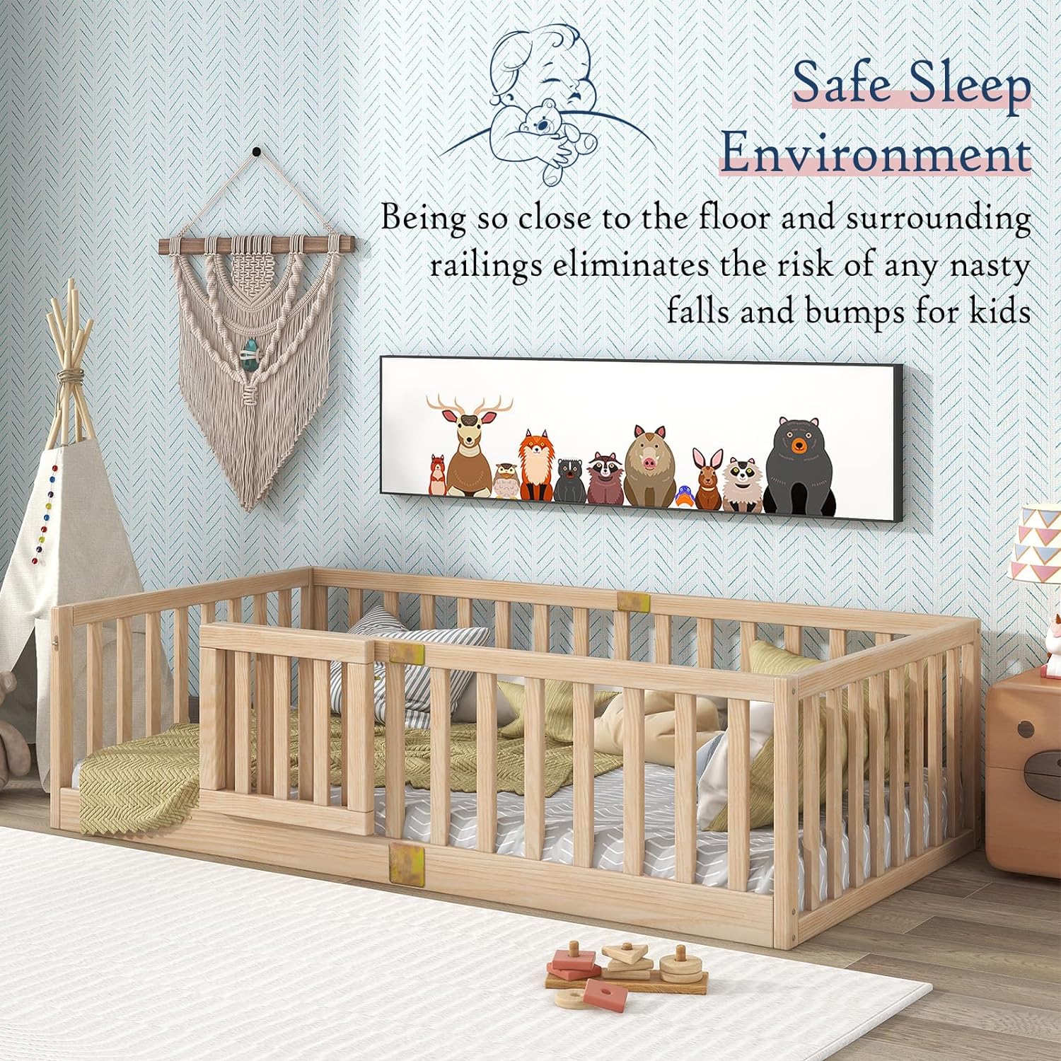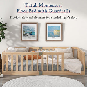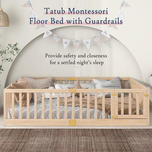 Tatub Full Floor Bed with Safety Guardrails and Door, Montessori Floor Bed for Kids, Wood Kids Floor Beds Frame, Door Can Install Left and Right, Full-Nature
