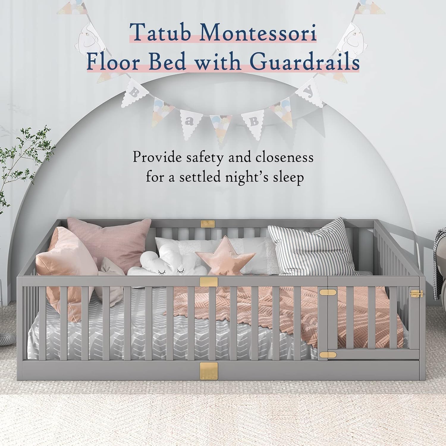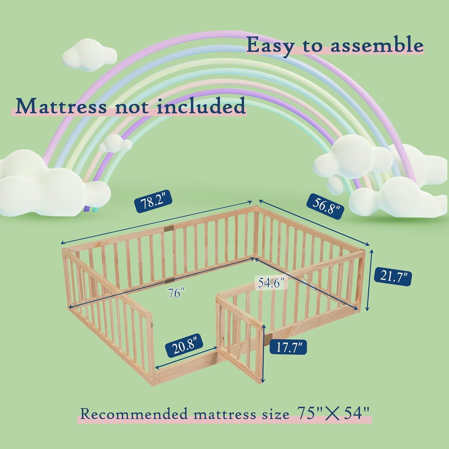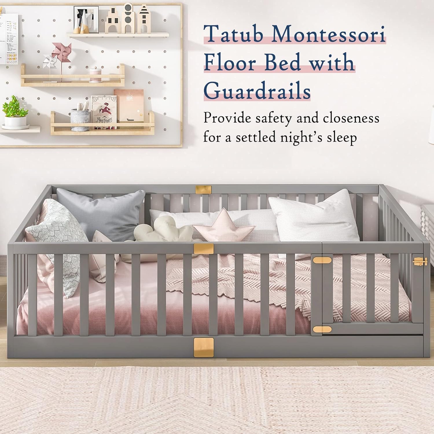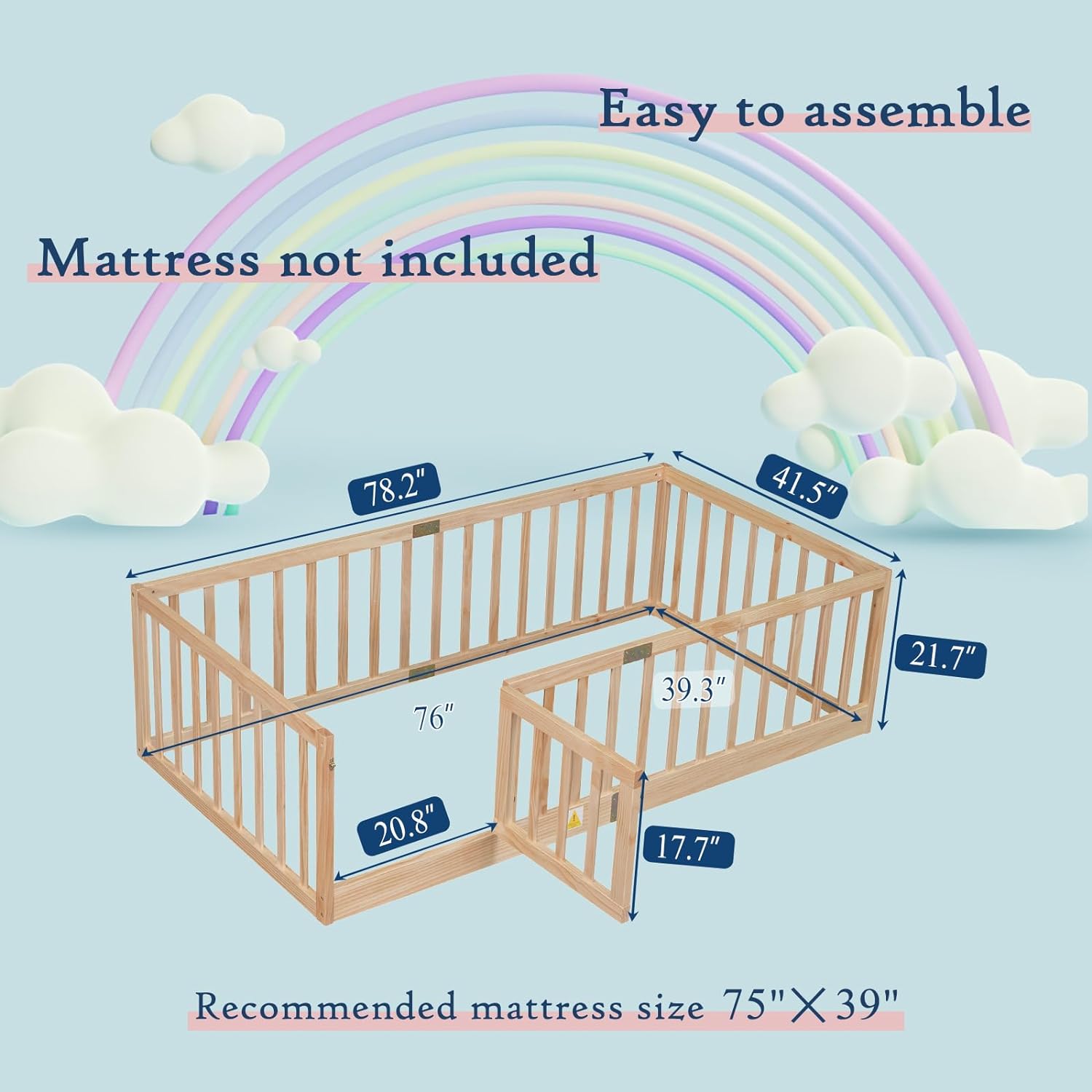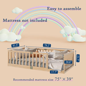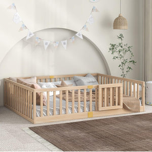 Tatub Full Floor Bed with Safety Guardrails and Door, Montessori Floor Bed for Kids, Wood Kids Floor Beds Frame, Door Can Install Left and Right, Full-Nature
