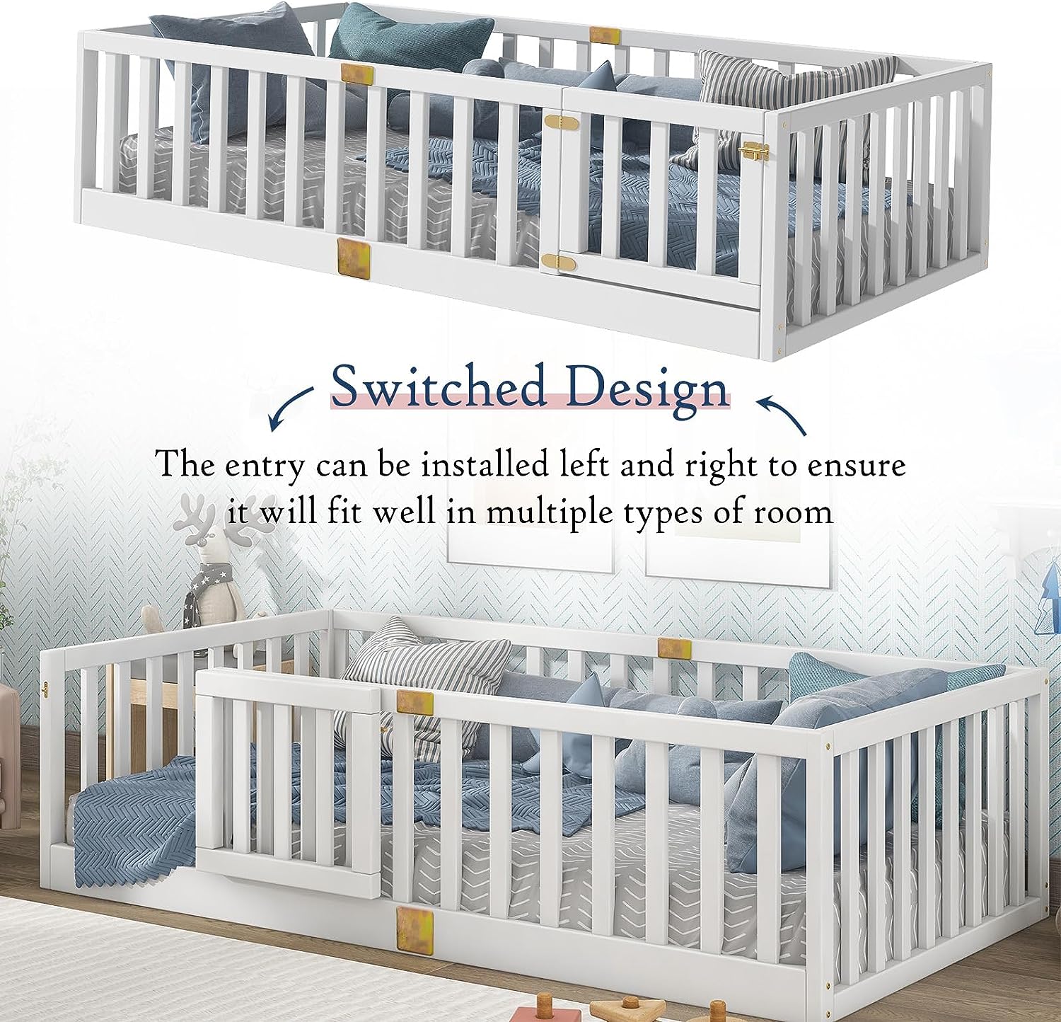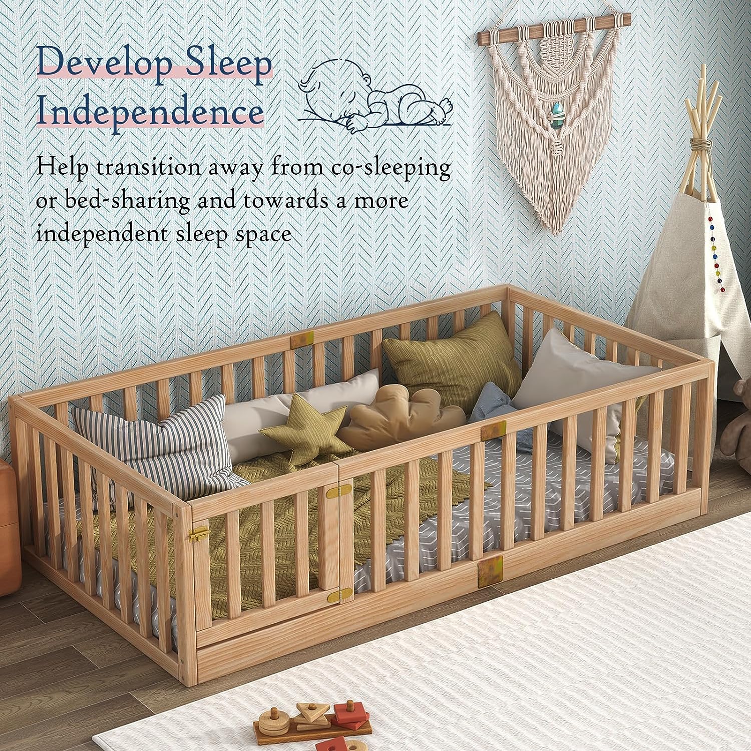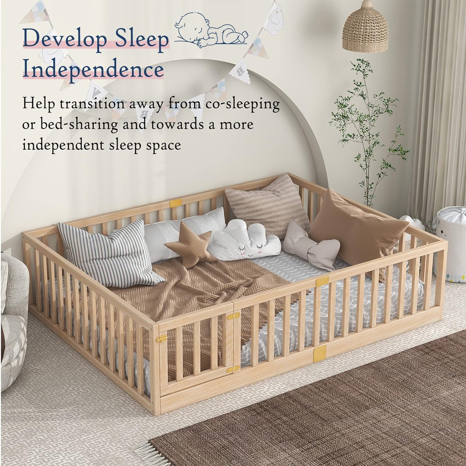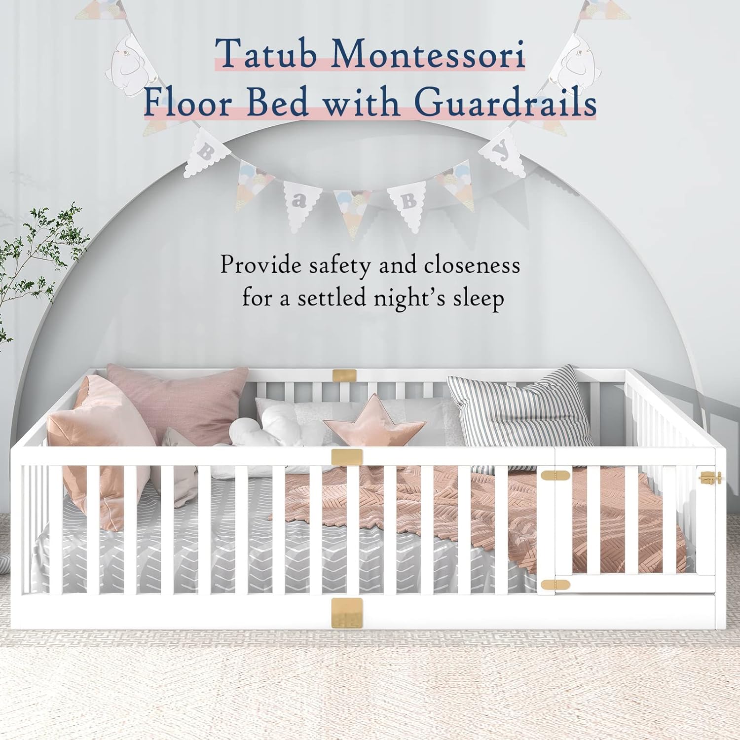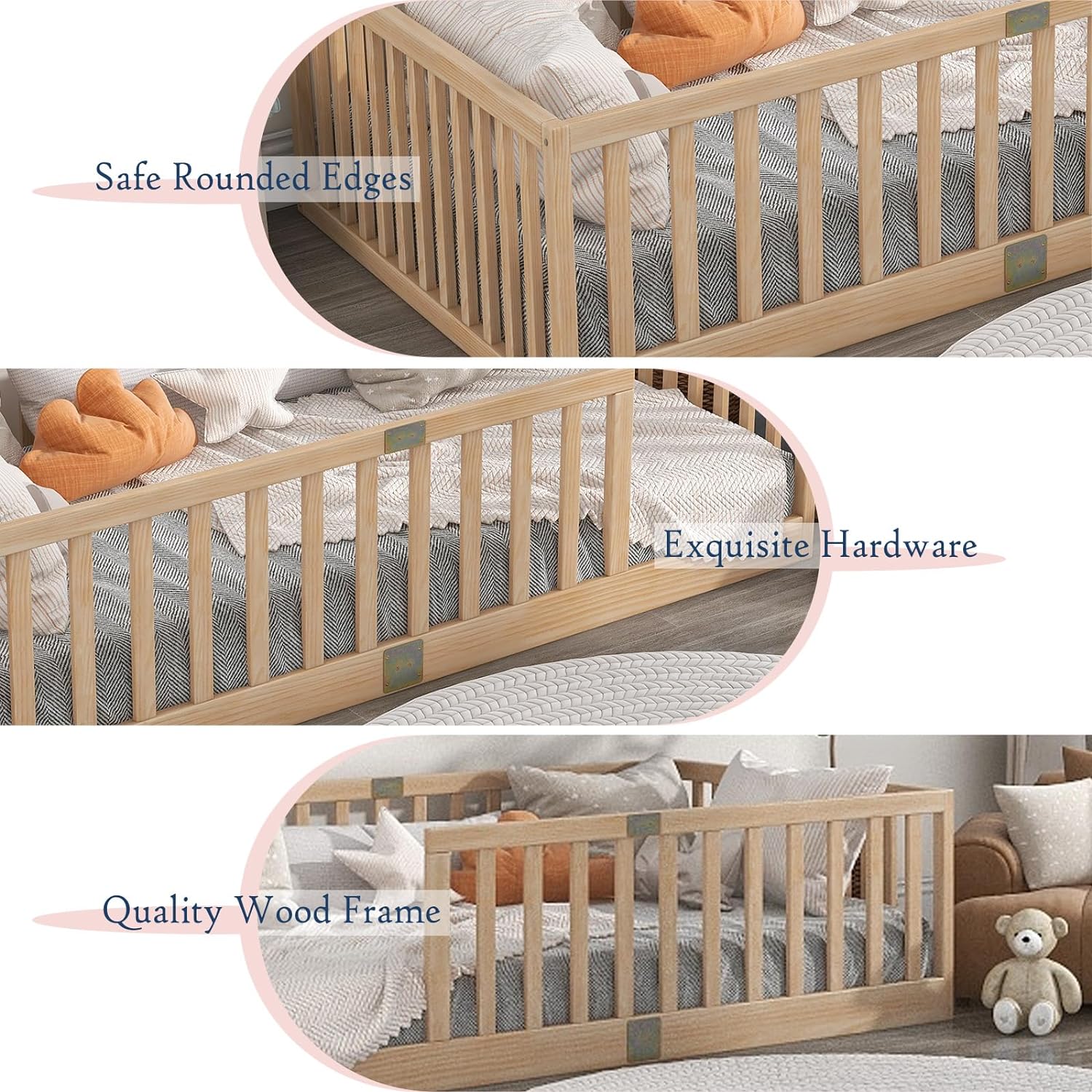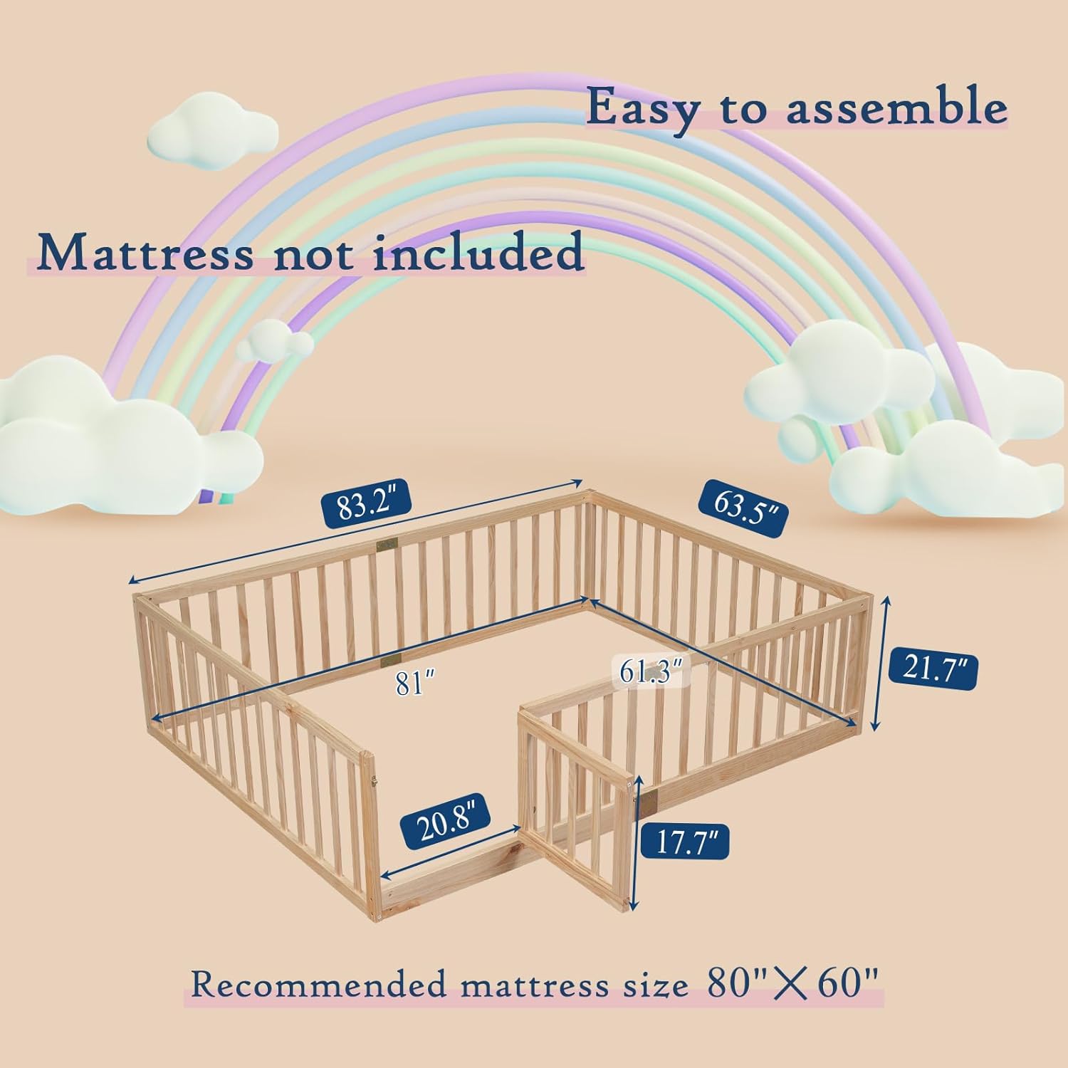 Tatub Full Floor Bed with Safety Guardrails and Door, Montessori Floor Bed for Kids, Wood Kids Floor Beds Frame, Door Can Install Left and Right, Full-Nature