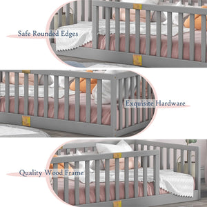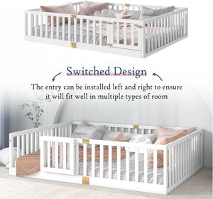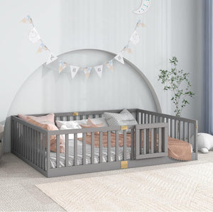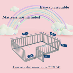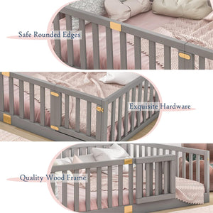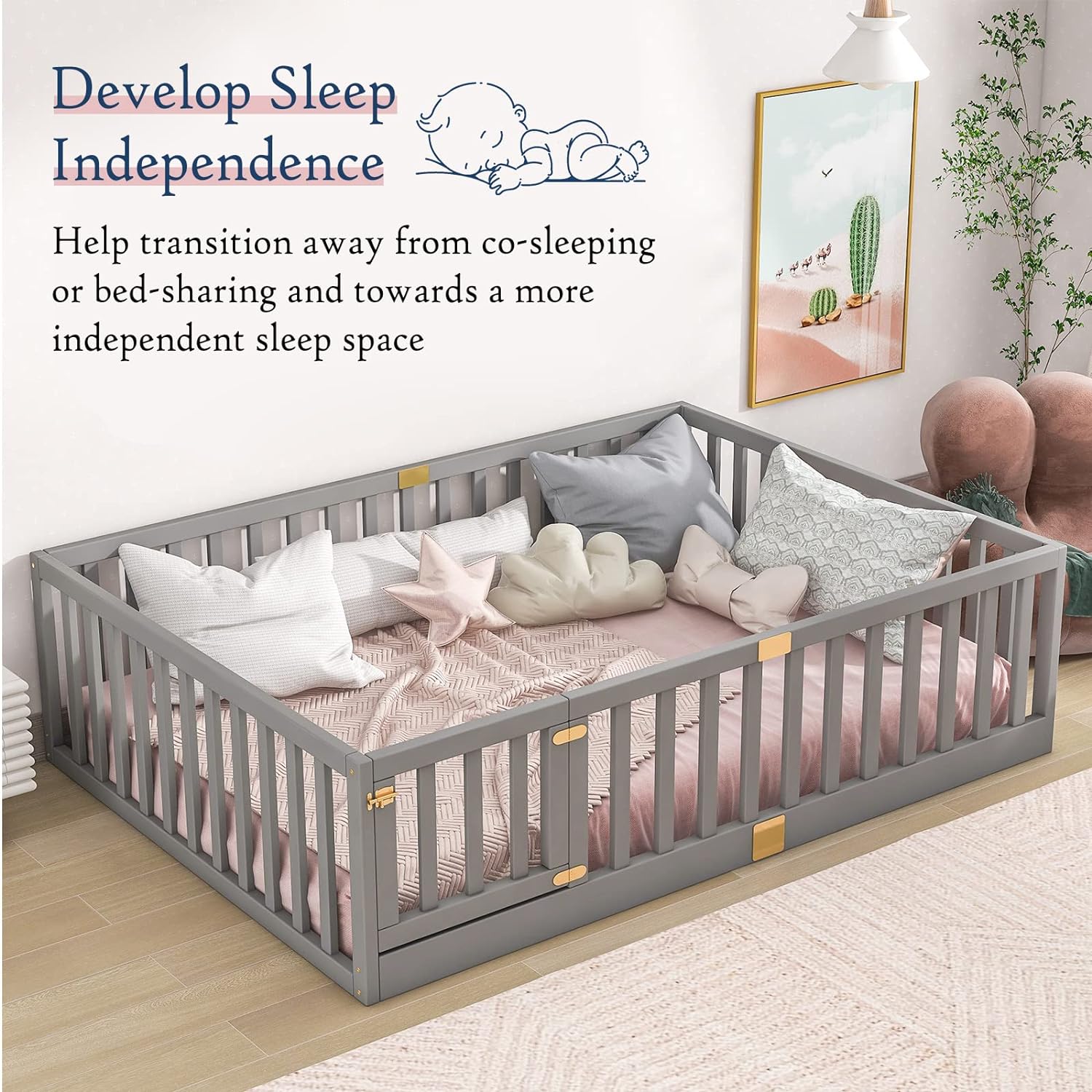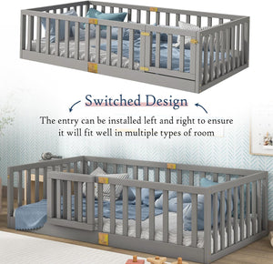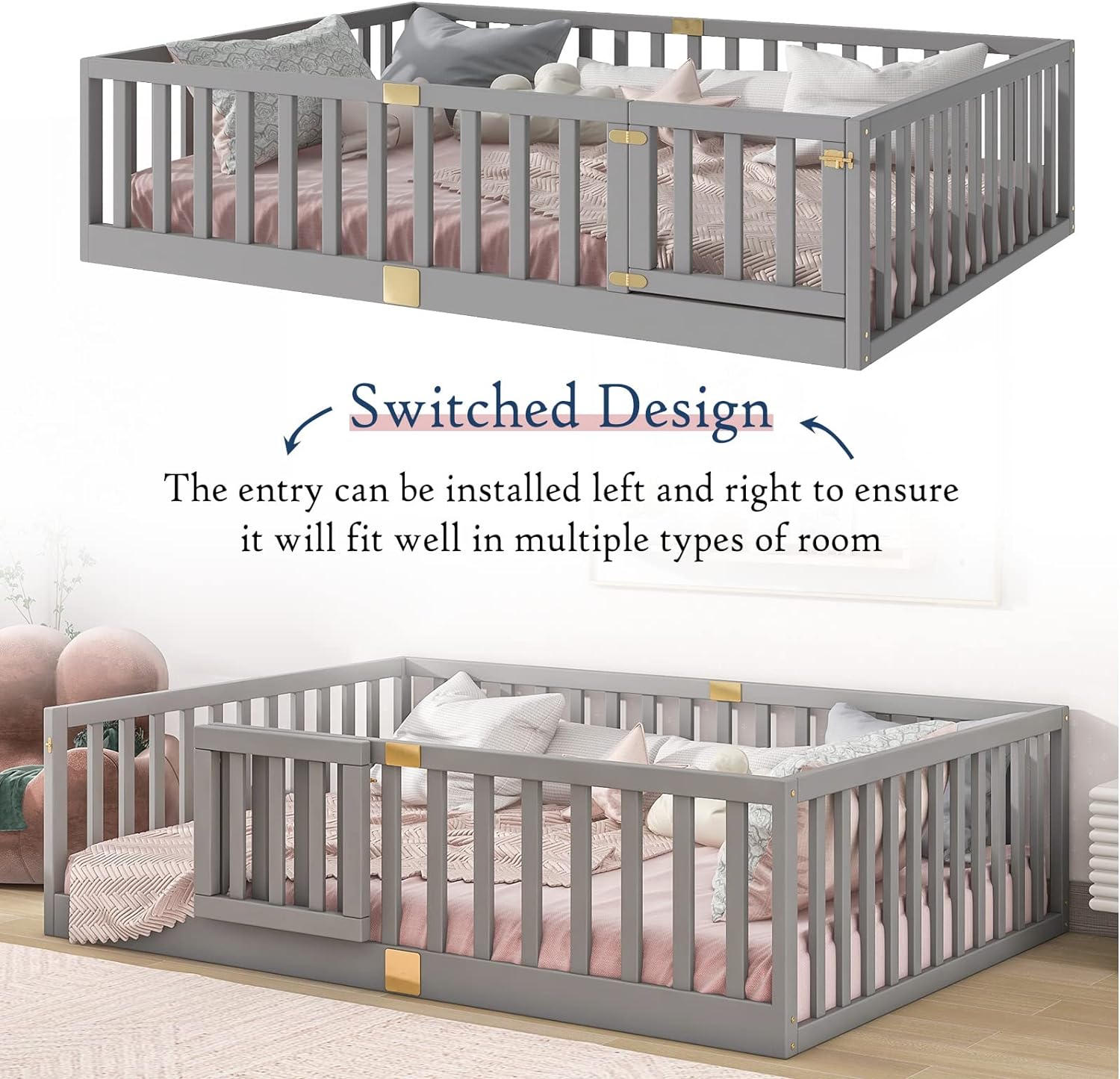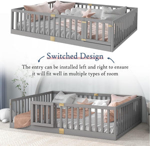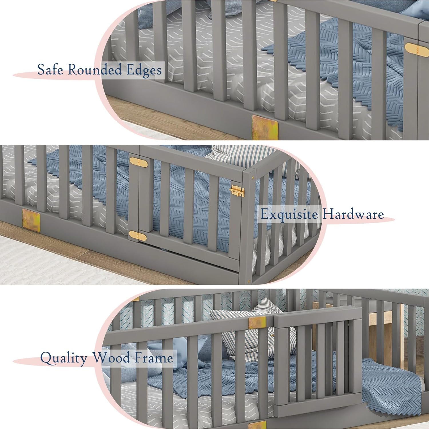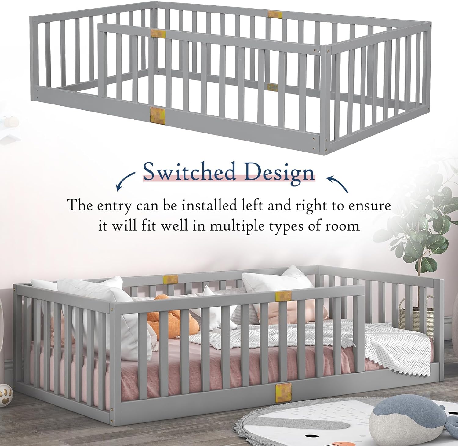 Tatub Full Floor Bed with Safety Guardrails and Door, Montessori Floor Bed for Kids, Wood Kids Floor Beds Frame, Door Can Install Left and Right, Full-Nature