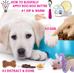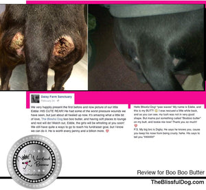 Boo boo butter is a rich salve/balm/ointment, great for any issue that needs extra support and old fashioned fixing. No artificial ingredients, no synthetics, no petroleum by-products, nothing you cannot pronounce, just good stuff to support your dog's healing process. .