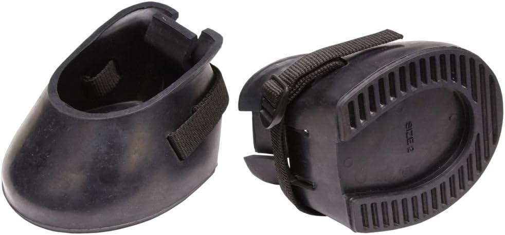 Flexible moded poly/rubber with extra thick safety cushion sole. Pull on fit secured with strong nylon strap. Designed to resist scuffs, scrapes and tears. Temporary replacement for a lost shoe offering protector of the tender frog.