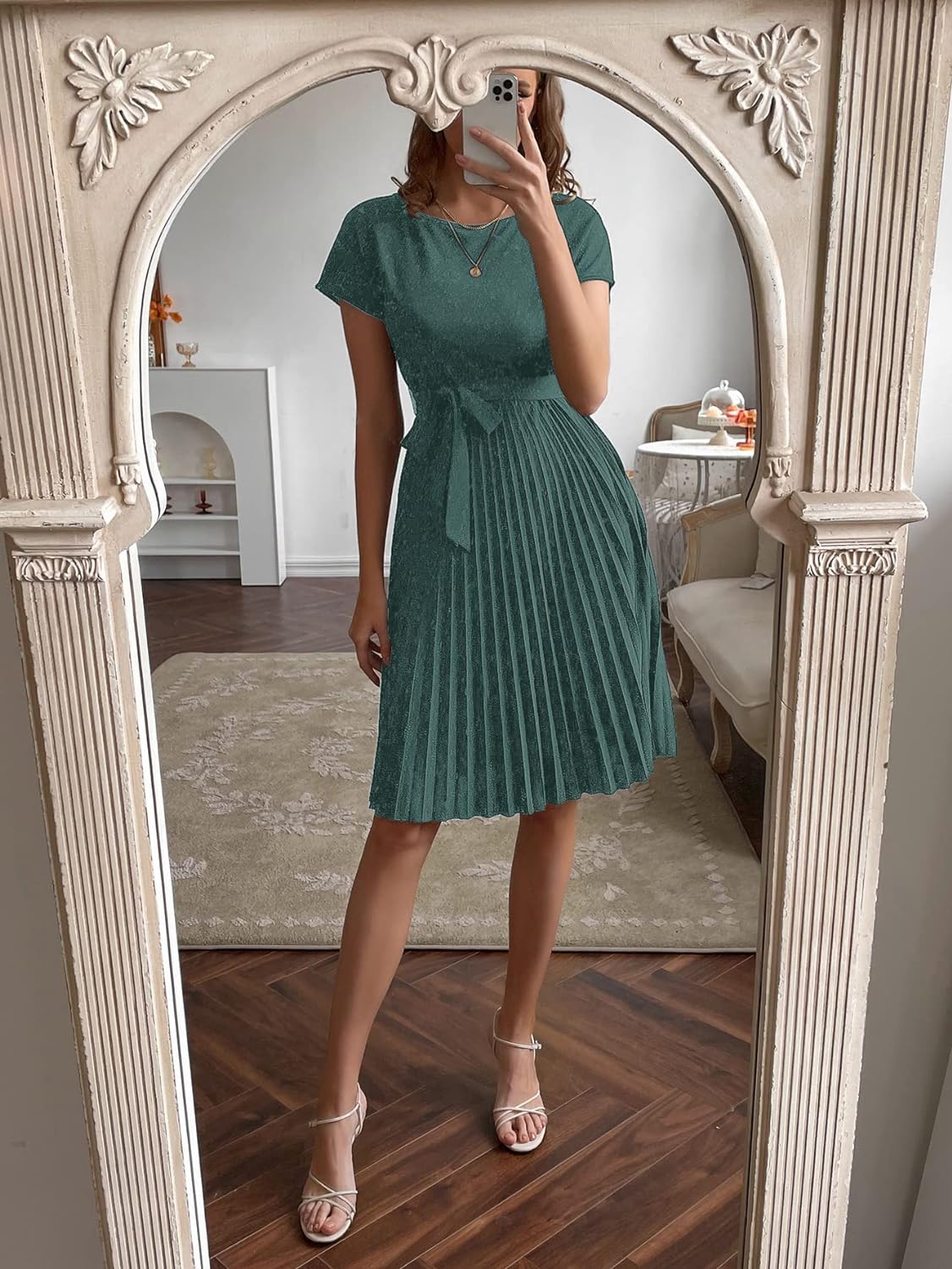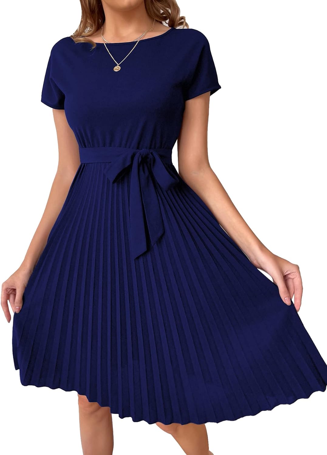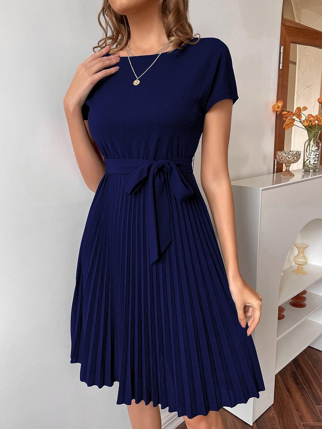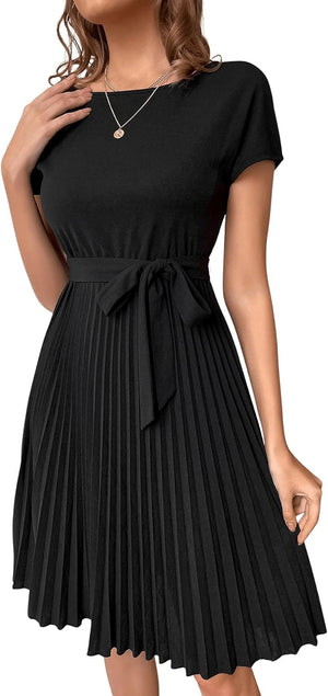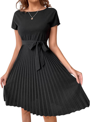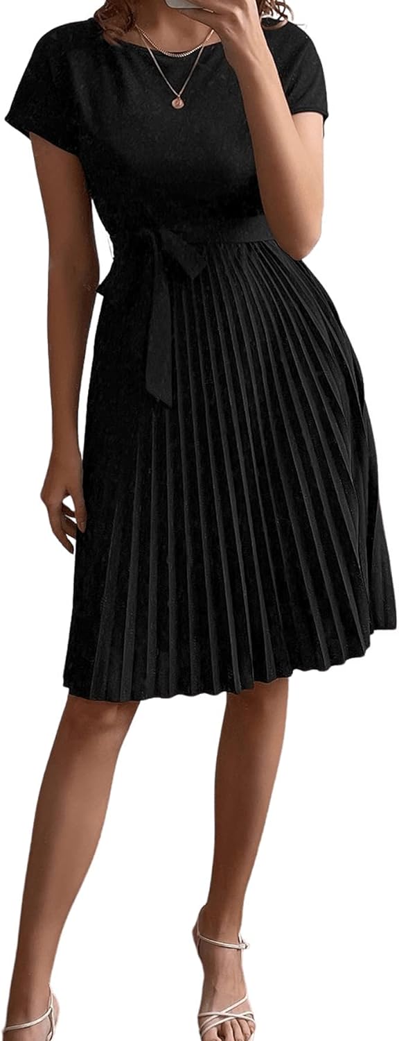 Verdusa Women's Elegant Pleated Short Sleeve High Waist Belted A Line Short Dress