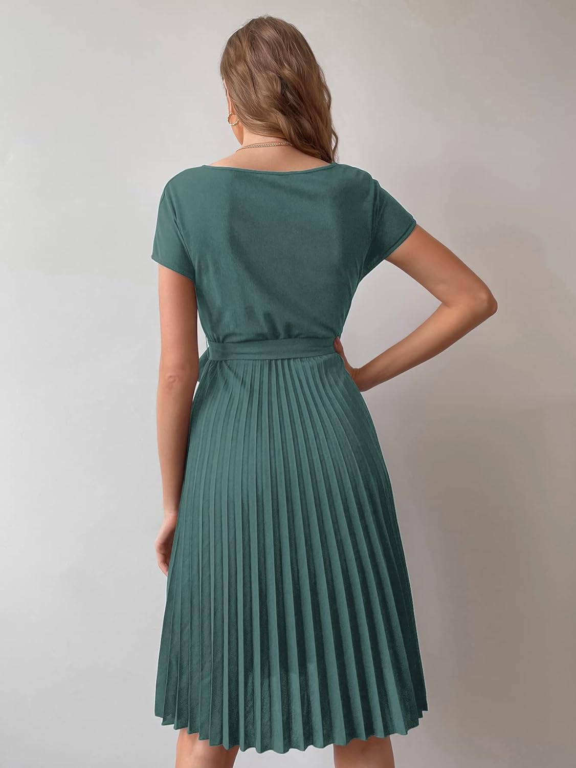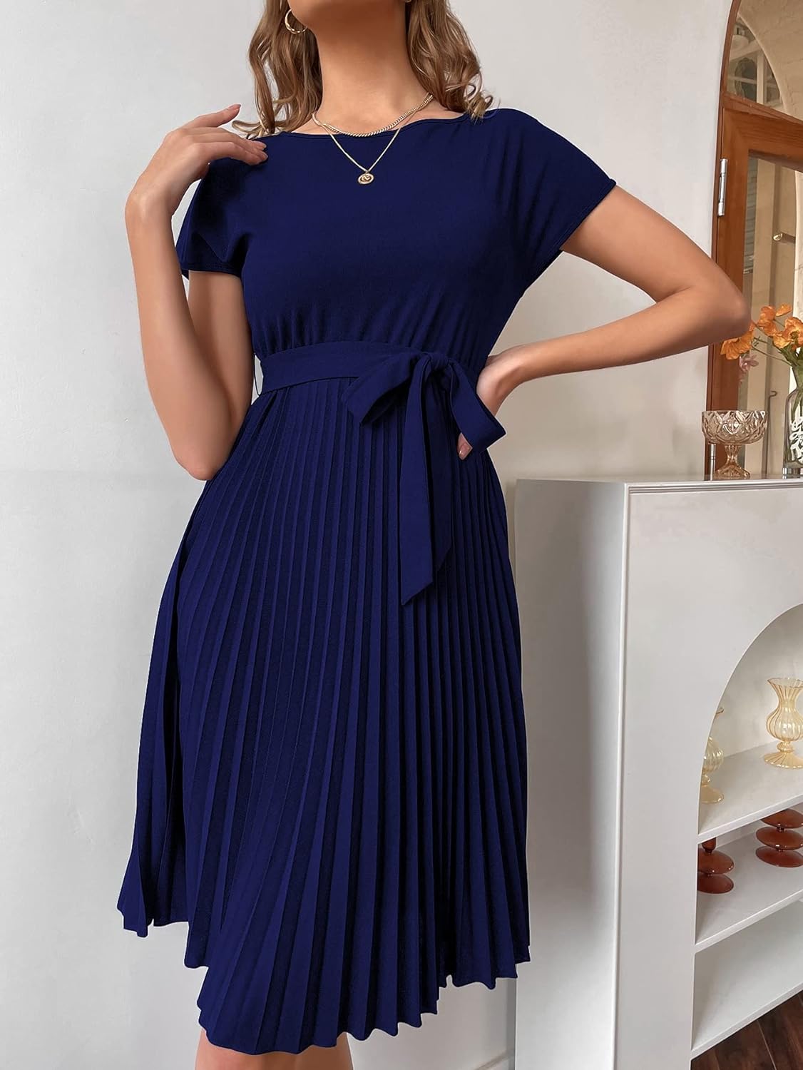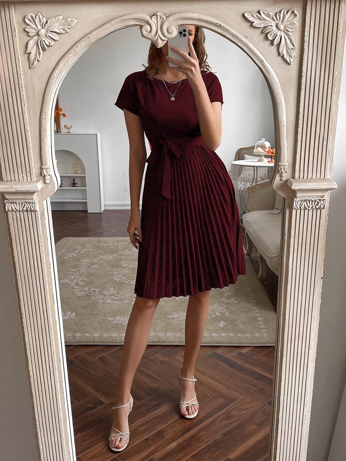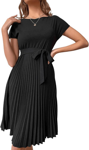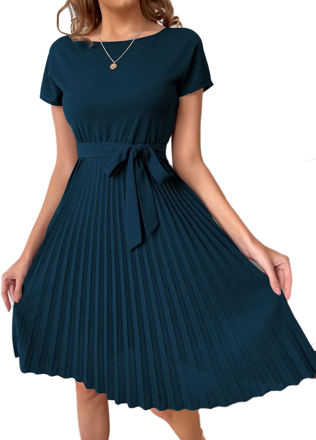 Verdusa Women's Elegant Pleated Short Sleeve High Waist Belted A Line Short Dress