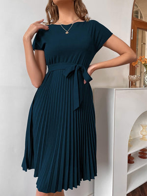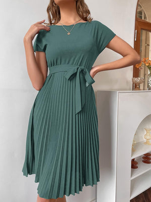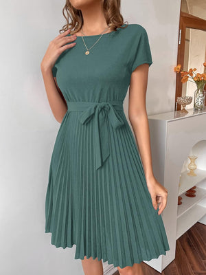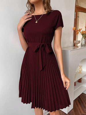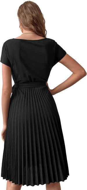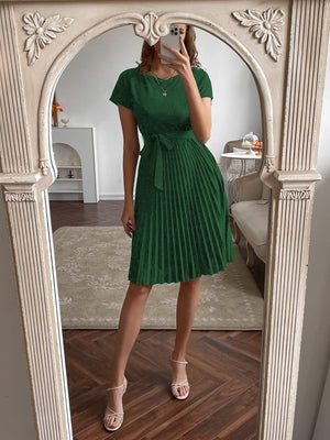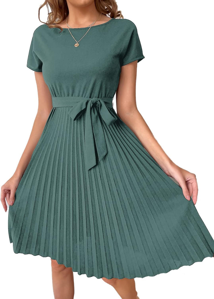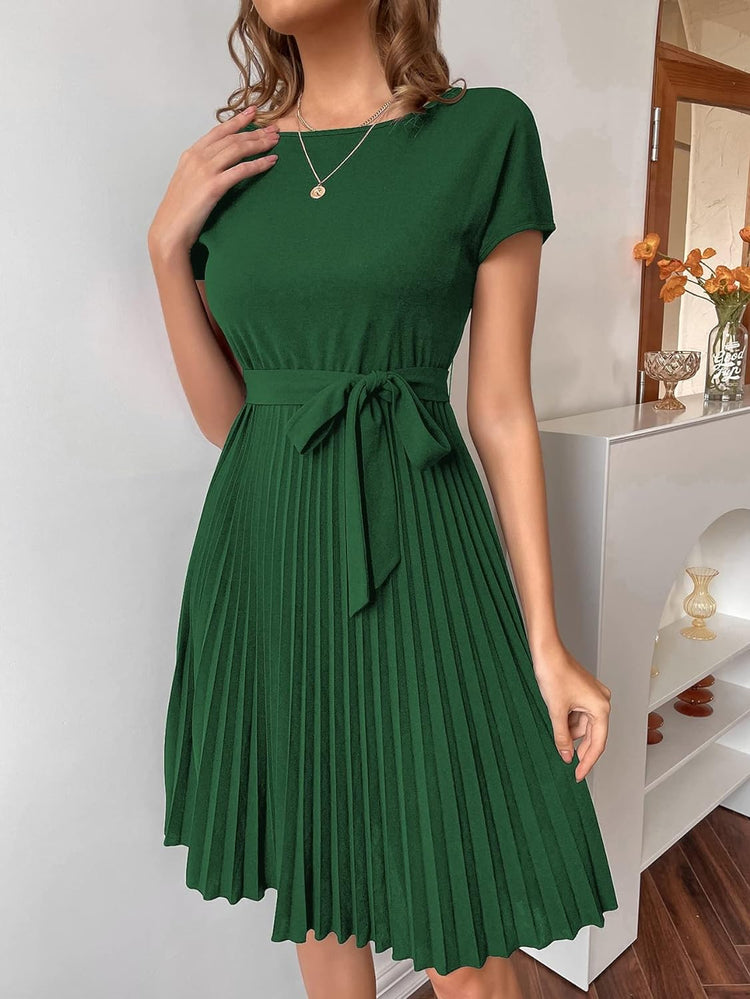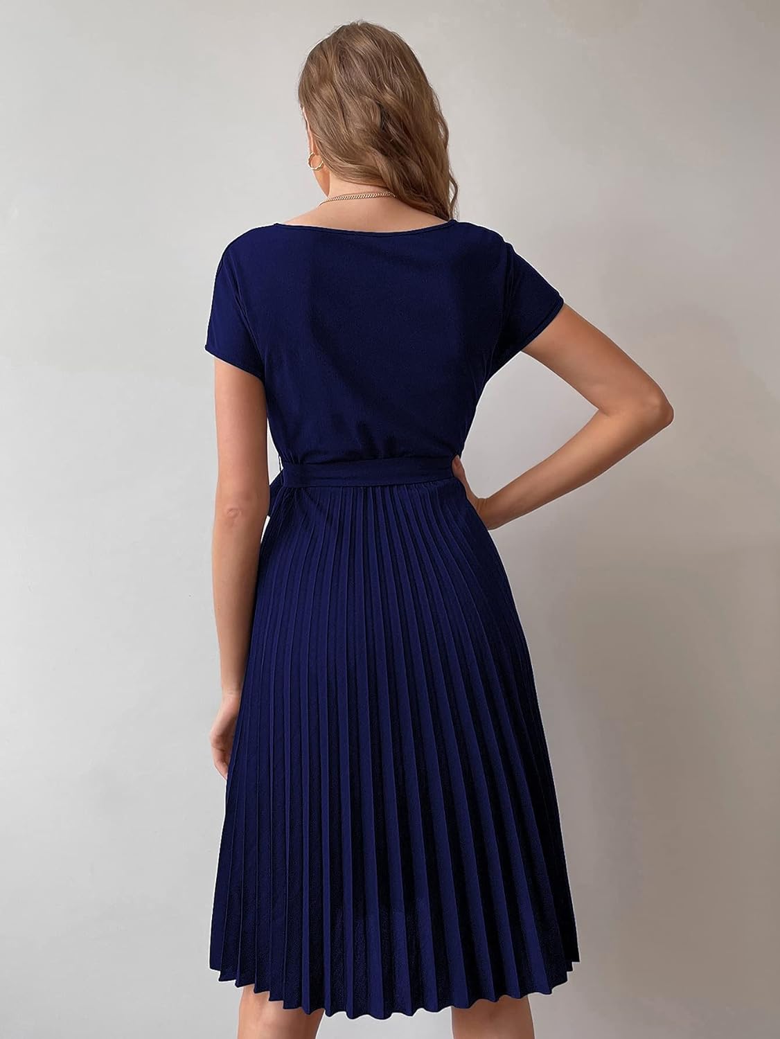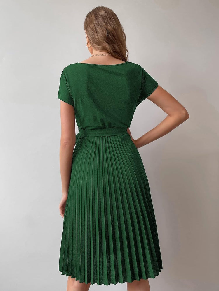 Verdusa Women's Elegant Pleated Short Sleeve High Waist Belted A Line Short Dress