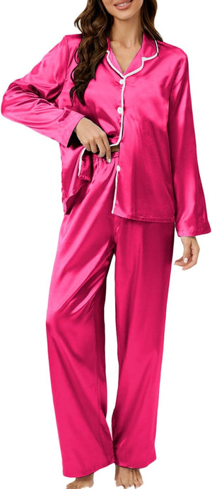 Verdusa Women's Satin Pajama Set Button Down Loungewear Long Sleeve Top and Pants Hot Pink Small, Hot Pink, S