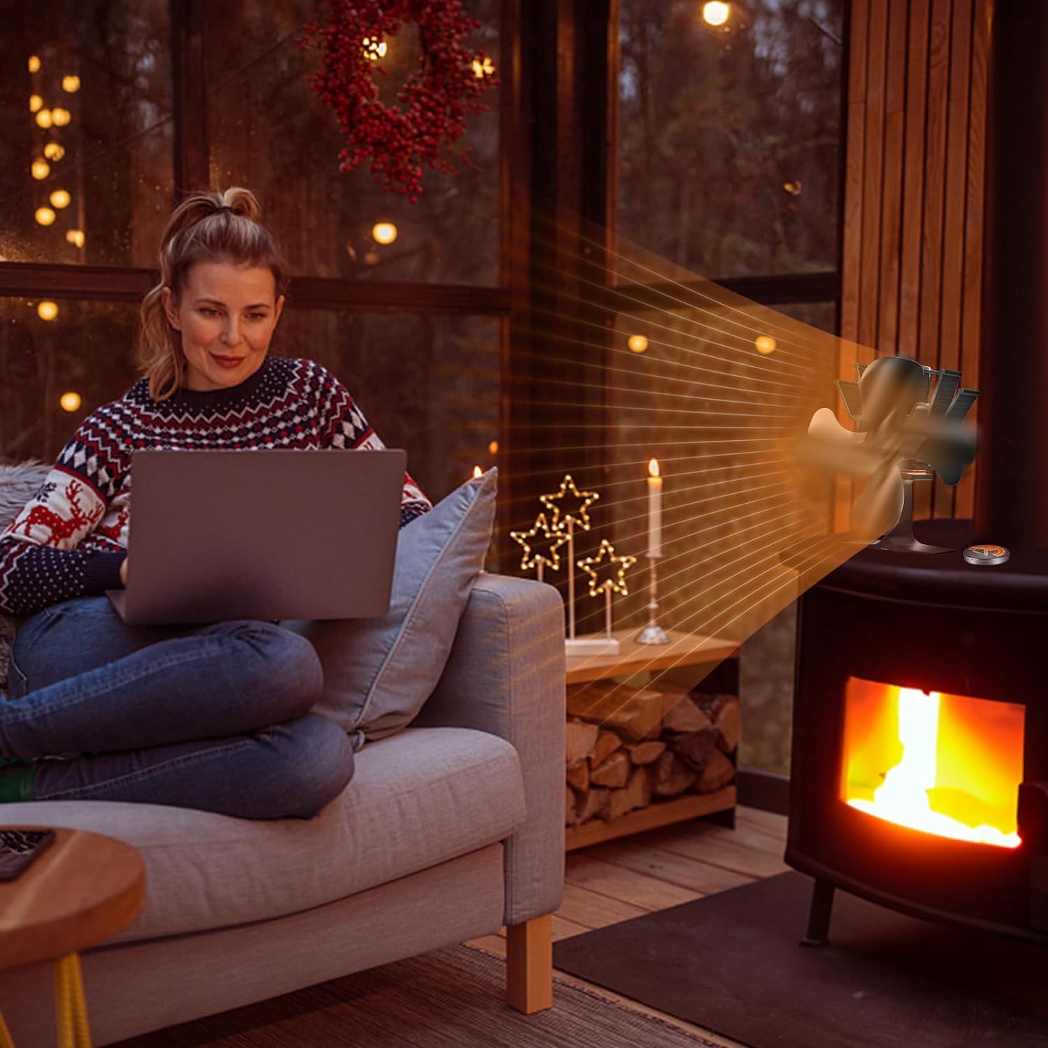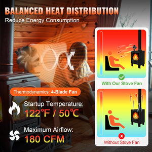 - Higher Efficiency: This fireplace fan evenly distributes heat to all corners of the room, quickly enhancing the overall comfort. At the same time, its low-temperature startup reduces wood consumption effectively, minimizes energy waste, and lowers household energy expenses.