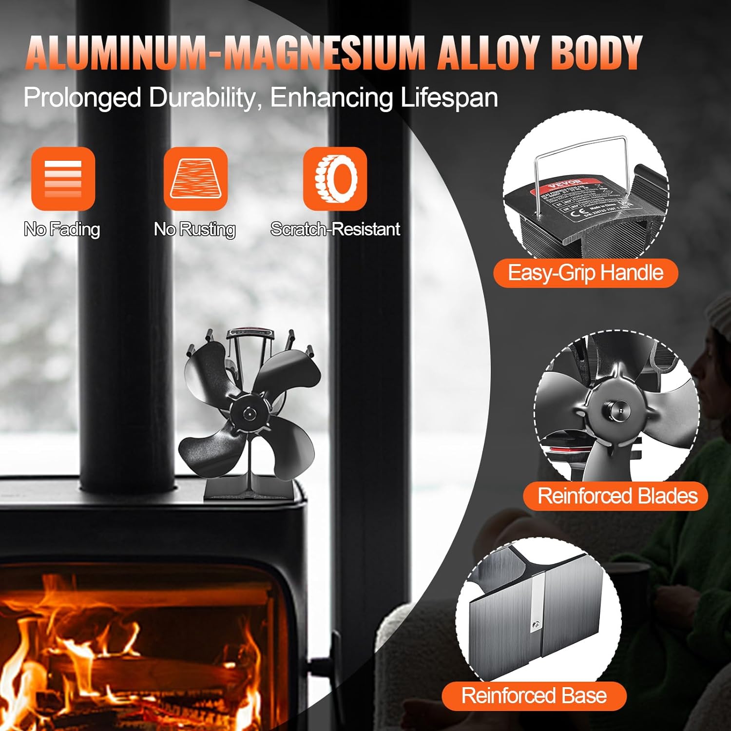 - High-Strength Material: Constructed from aluminum-magnesium alloy, the fireplace fan is corrosion-resistant, heat-resistant, and highly impact-resistant. It can withstand high temperatures and will not deform, rust, or fade even during extended operation at high temperatures.
