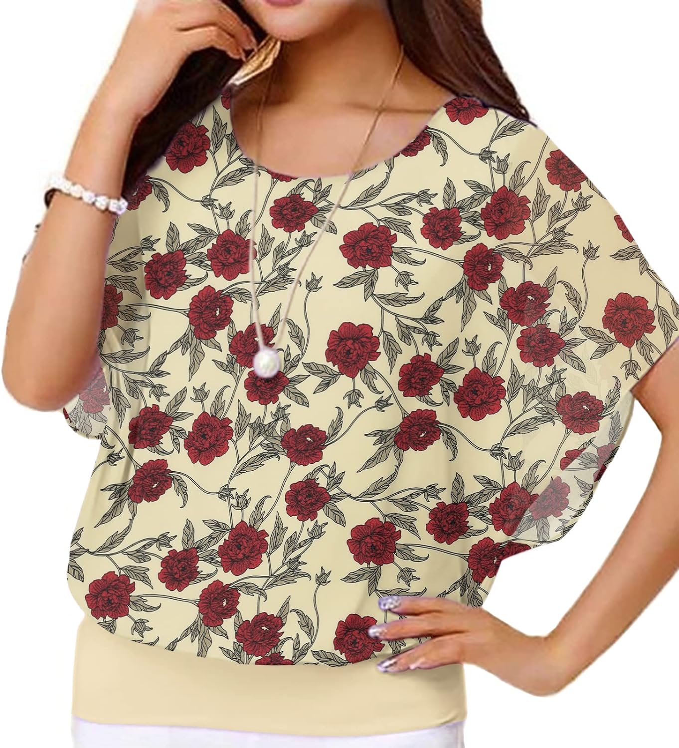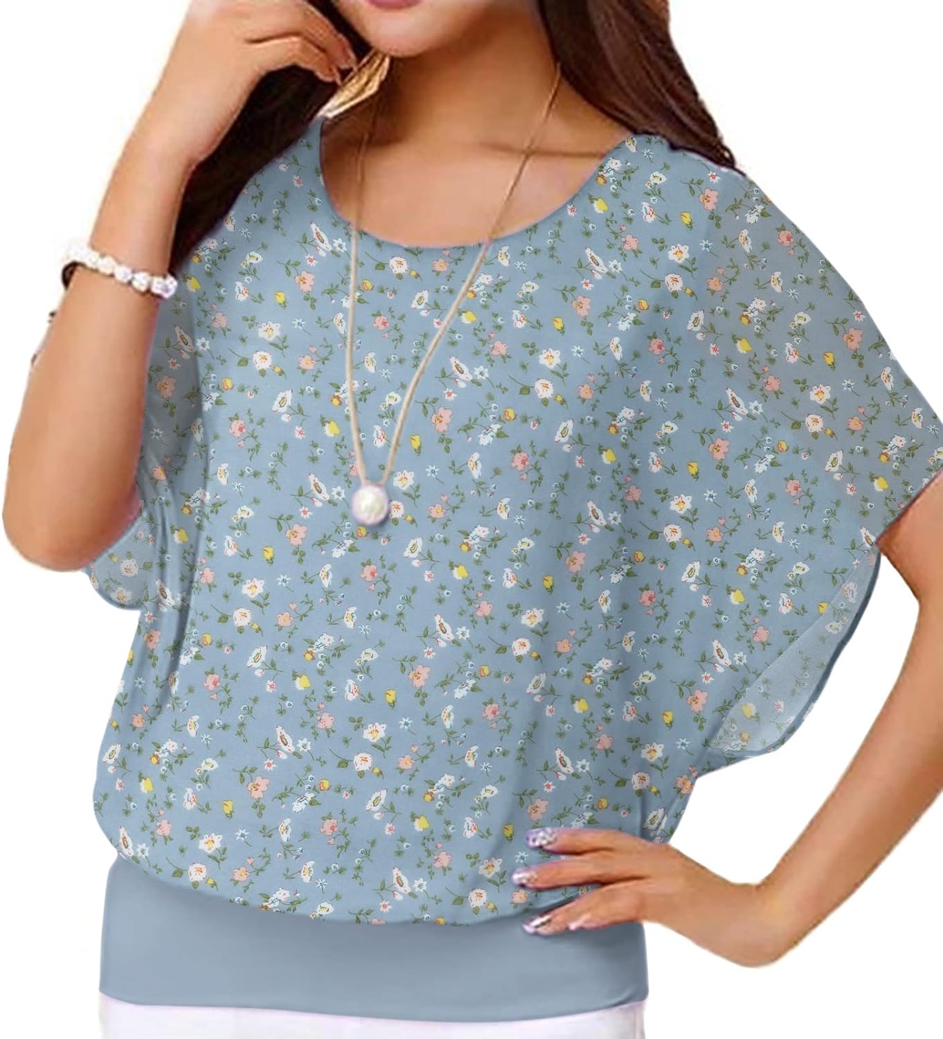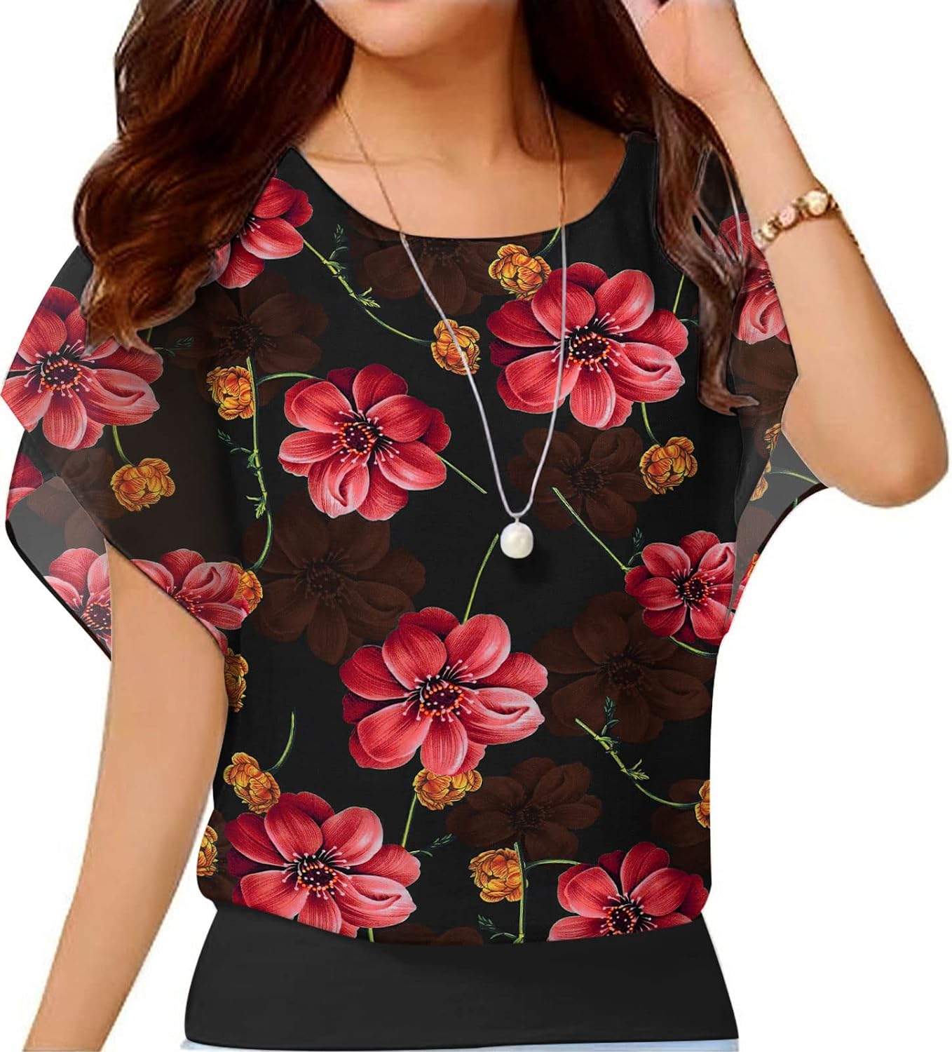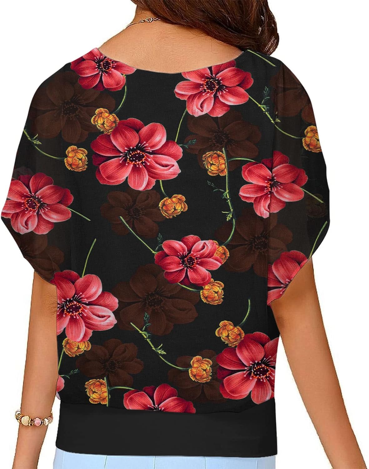 * Floral print chiffon blouse for women, short sleeve, round neck, slim fit, with bat wings, elegant