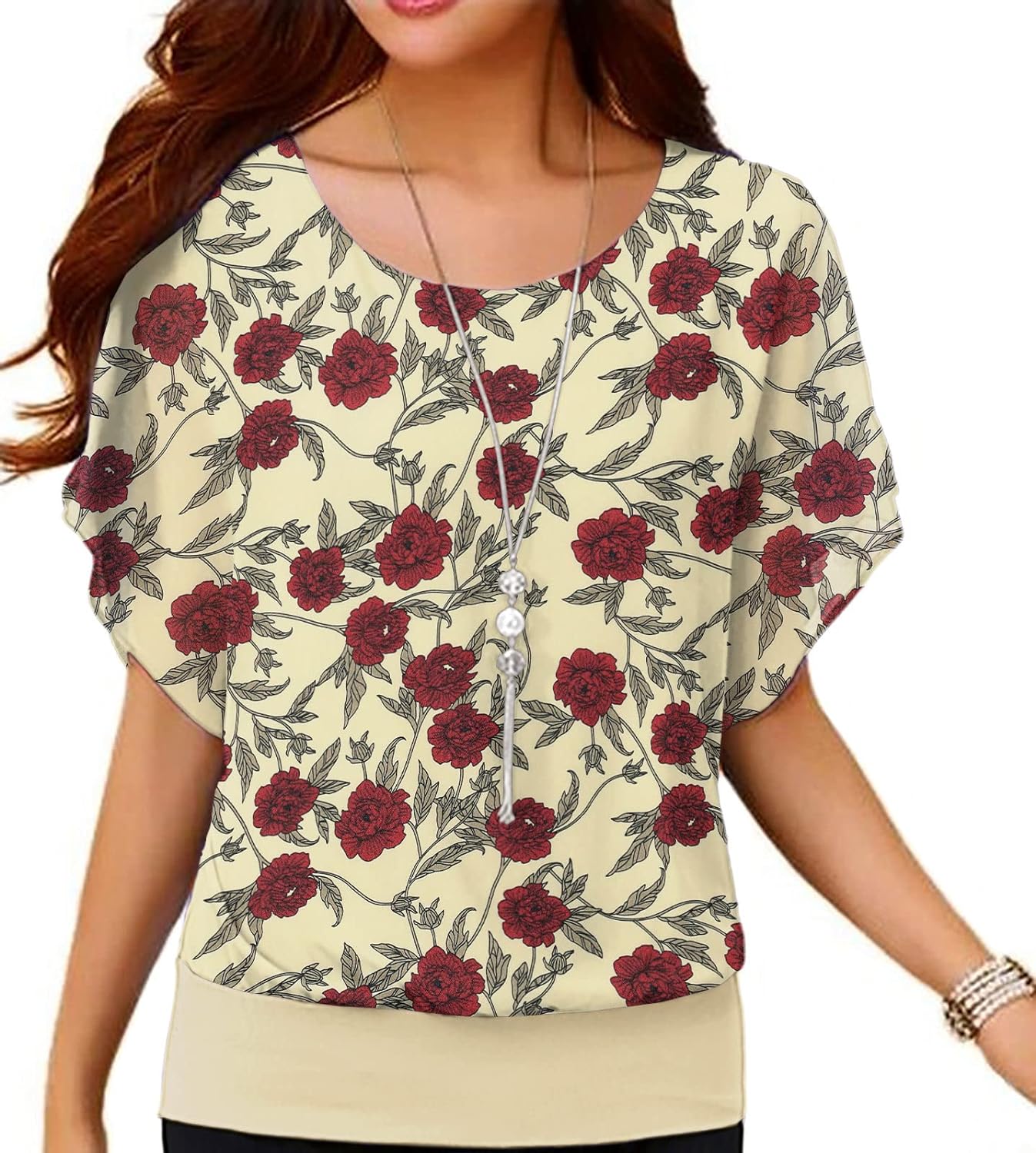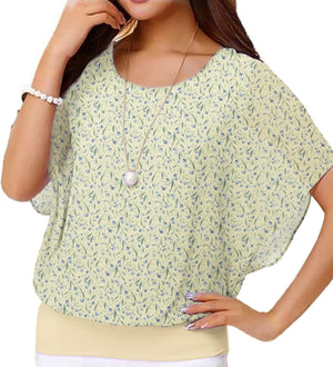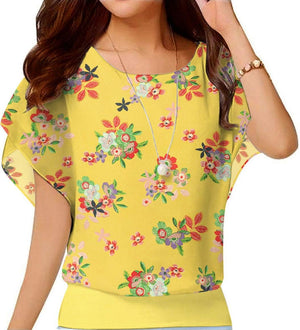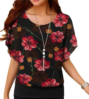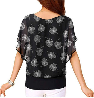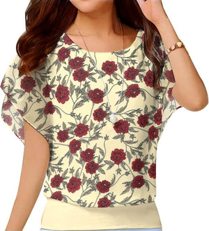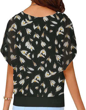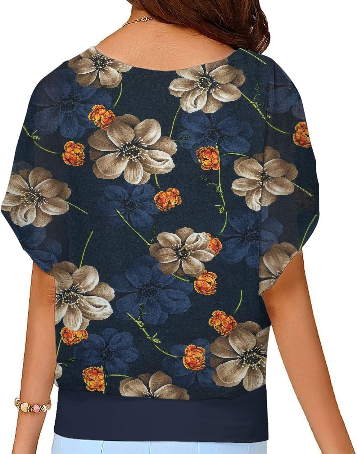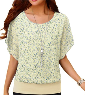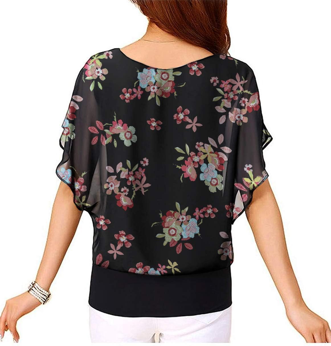 * Floral print chiffon blouse for women, short sleeve, round neck, slim fit, with bat wings, elegant