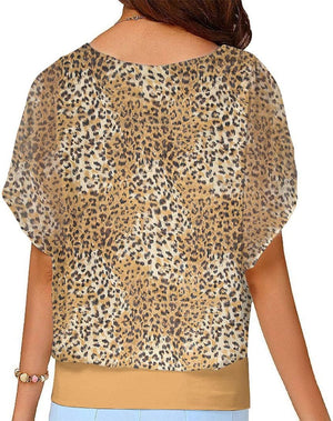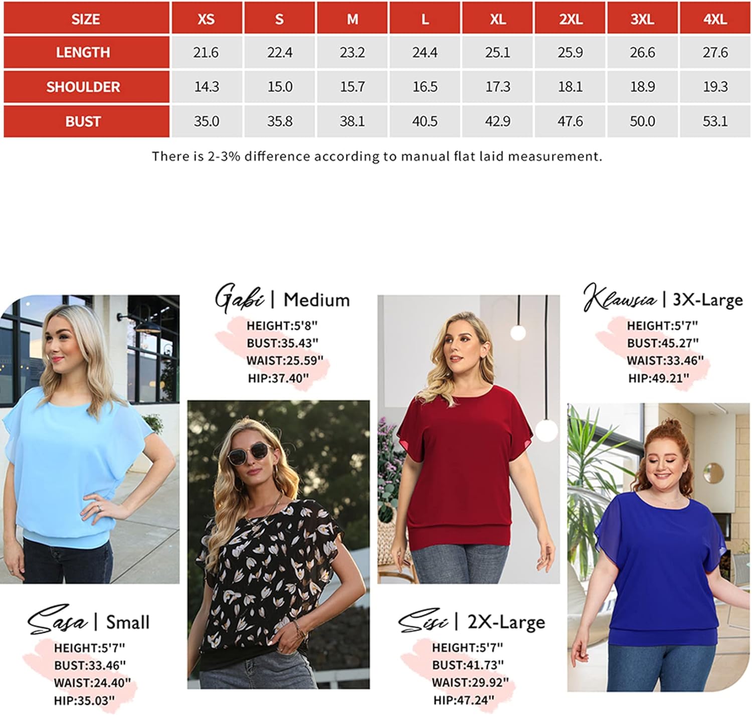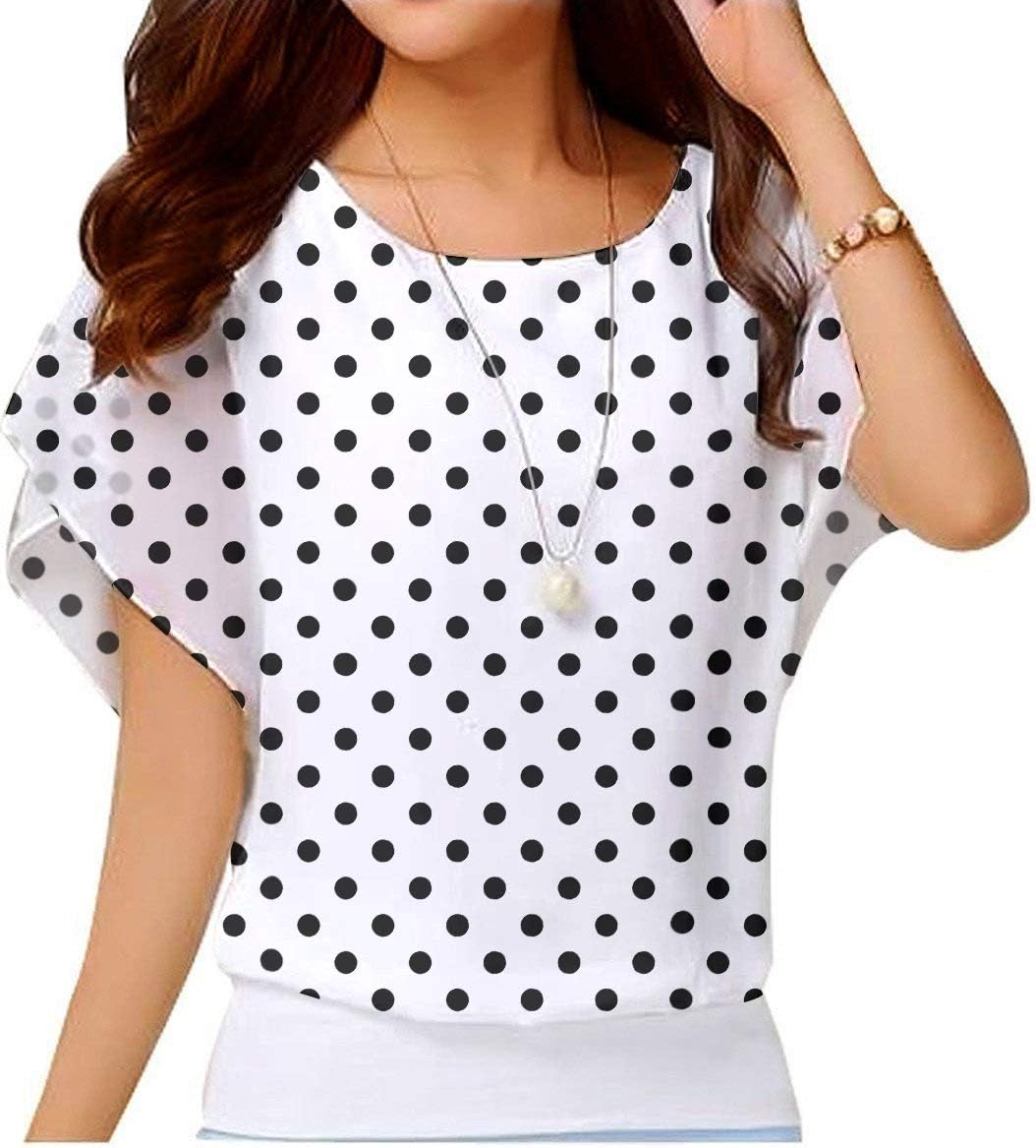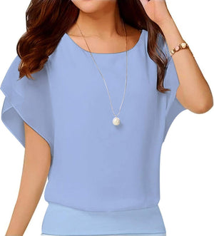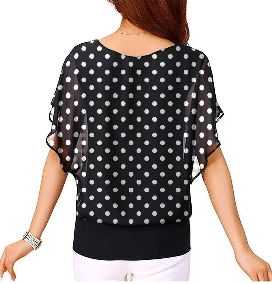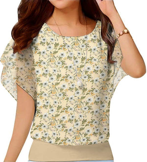 * Floral print chiffon blouse for women, short sleeve, round neck, slim fit, with bat wings, elegant