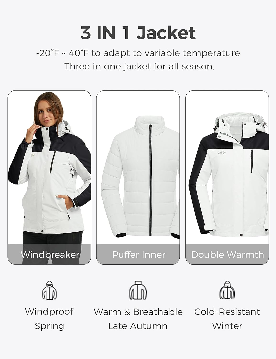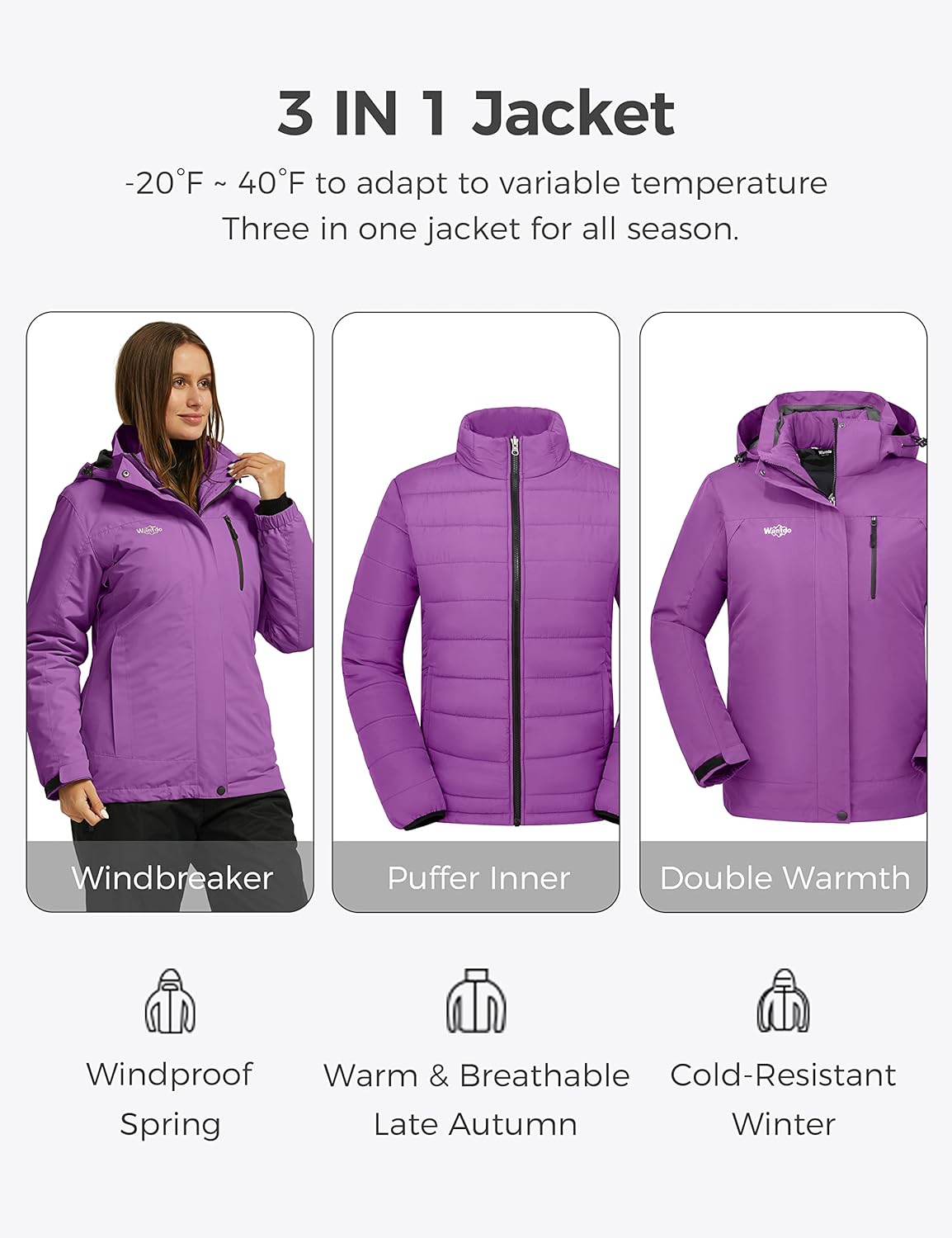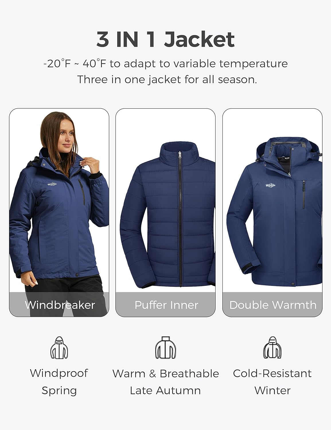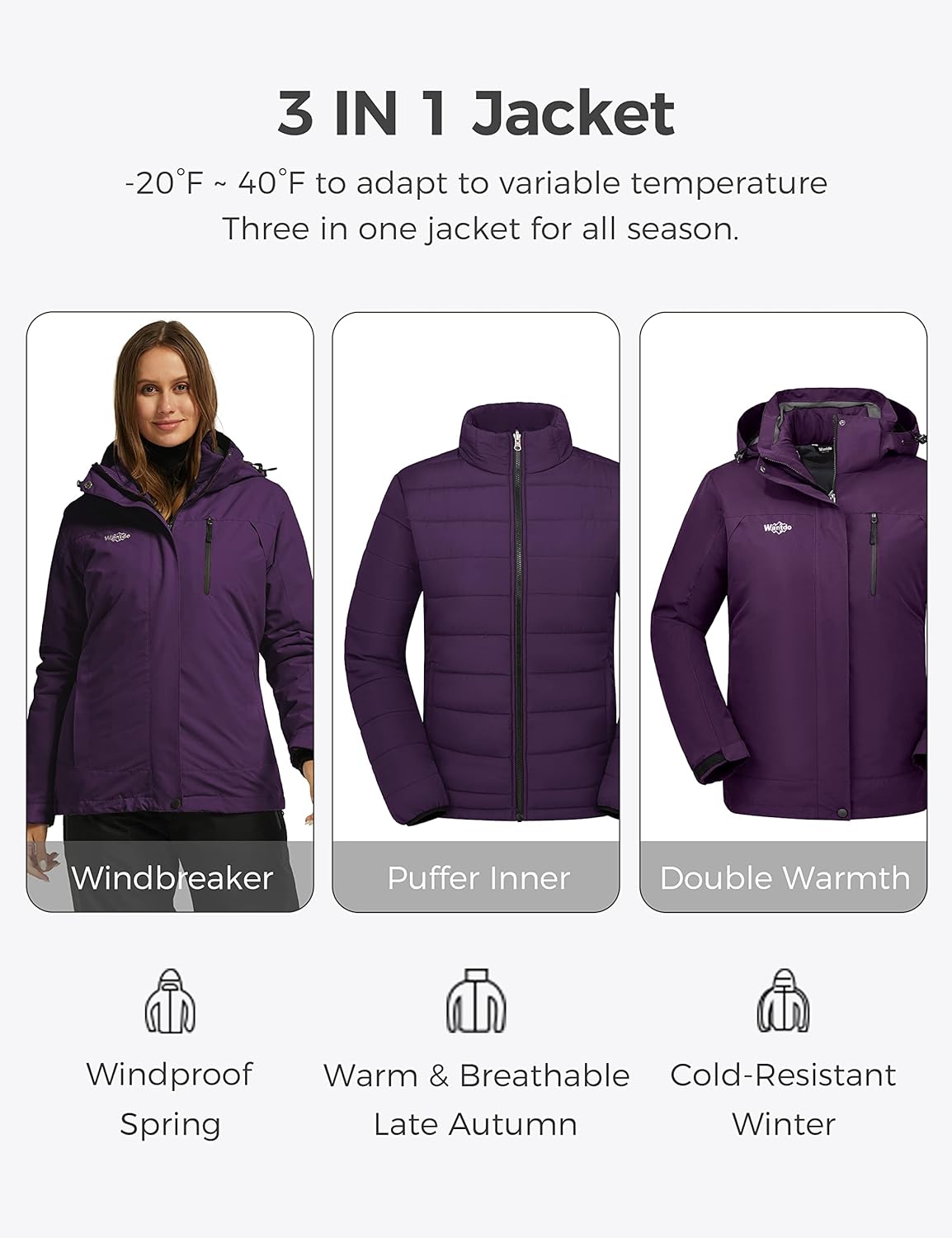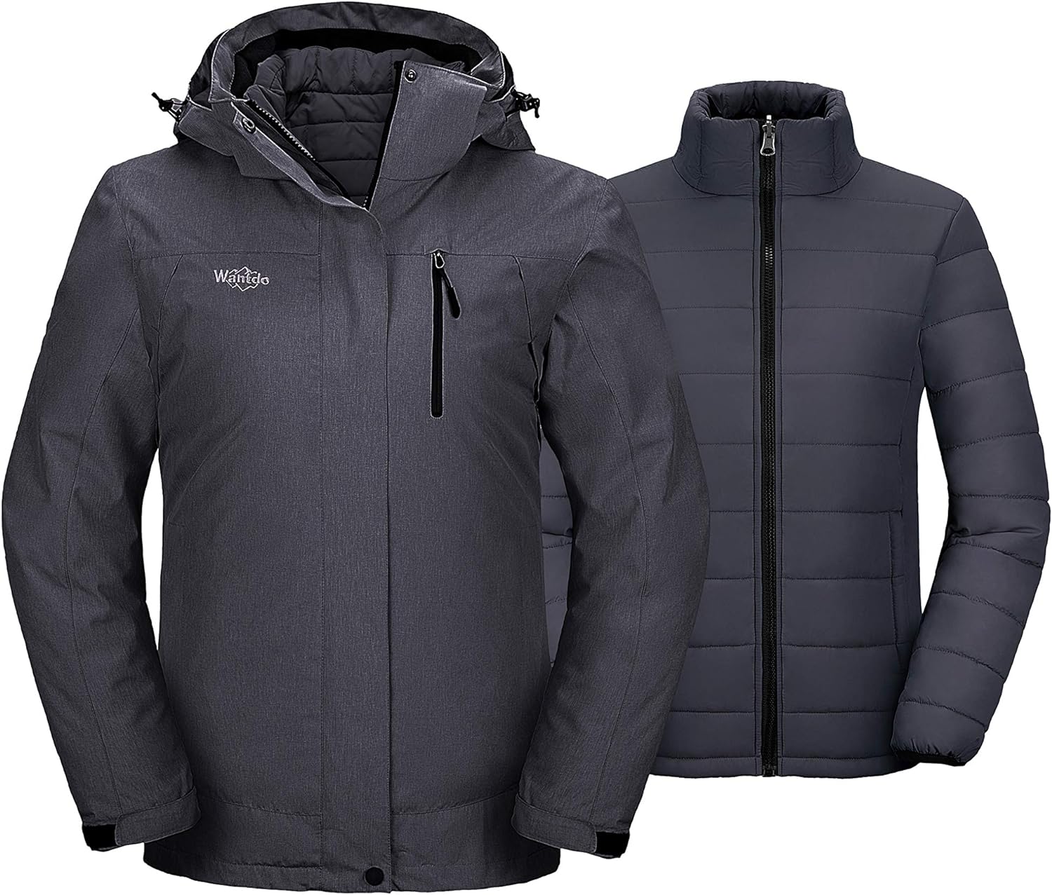 Wantdo Women's 3 in 1 Waterproof Ski Jacket Windproof Winter Snow Coat Snowboarding Jackets Warm Raincoat