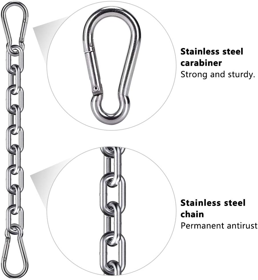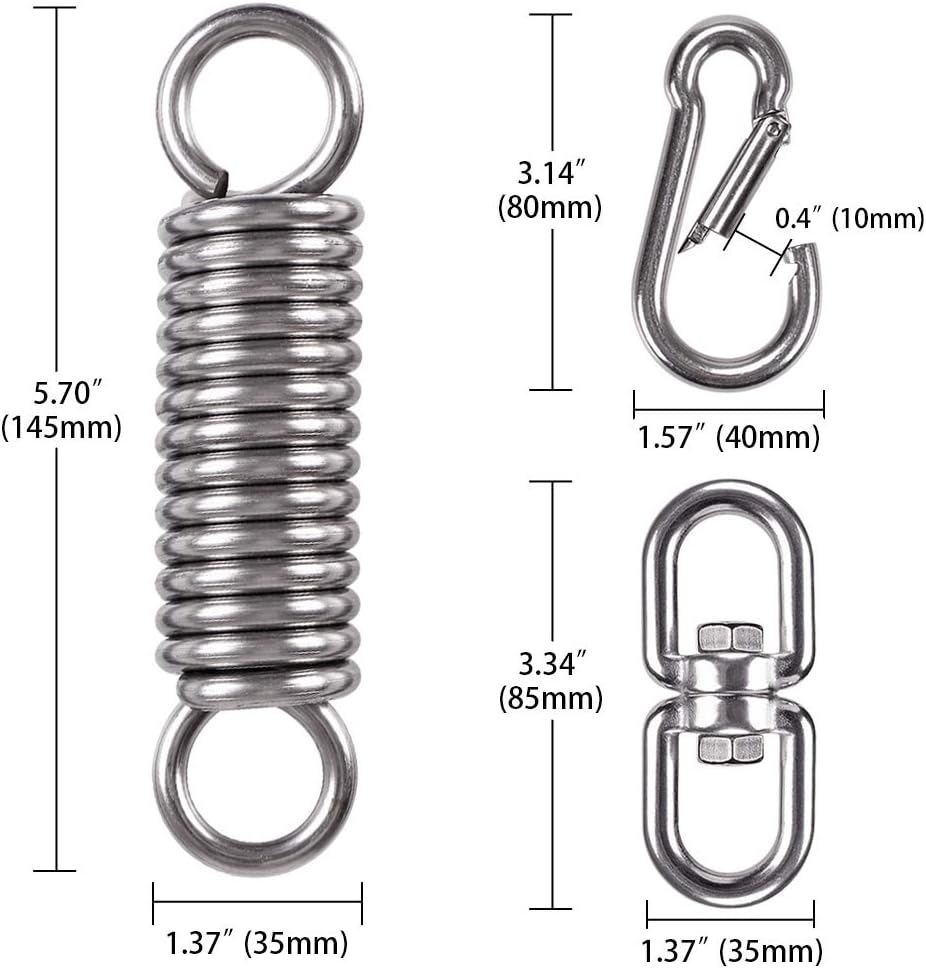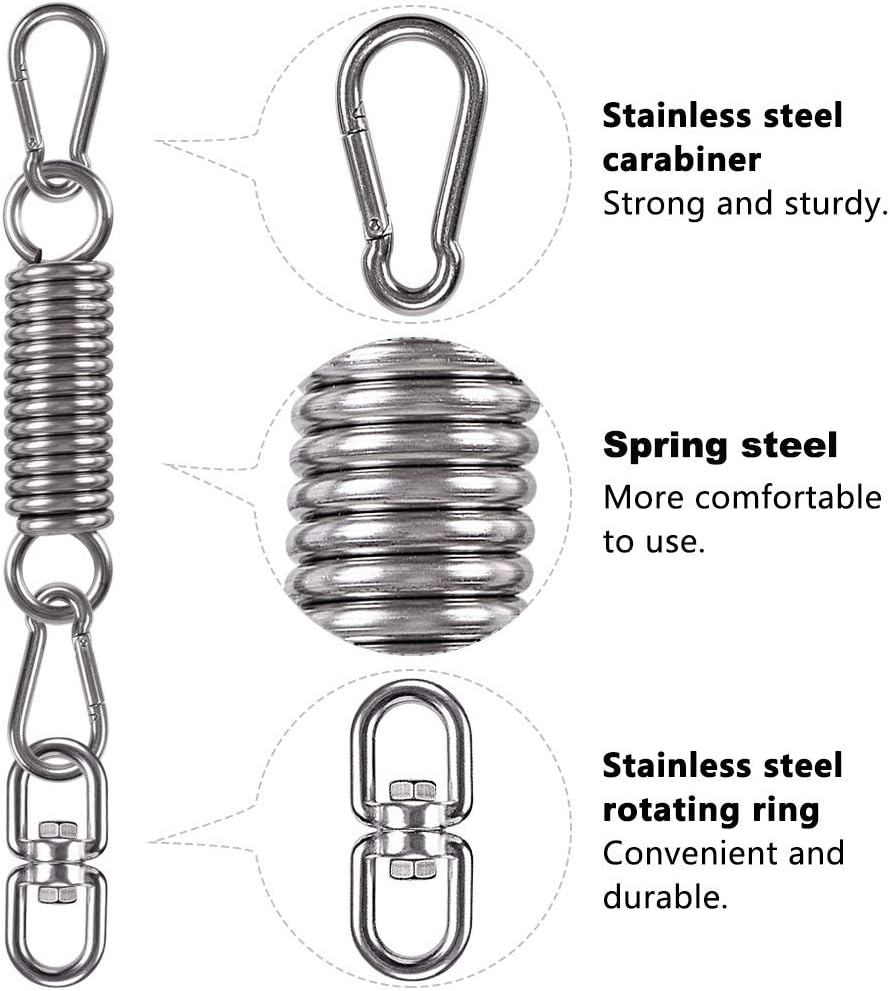 - HIGH QUALITY: The comfort springs are made with a high-strength spring steel, which are zinc-plated and clear-coated to provide protection against the elements and rust-resistant. swing swivel and snap hooks are made of stainless steel, corrosion resistance,high hardness, non-toxic and pollution-free environment.Suitable for any scene.