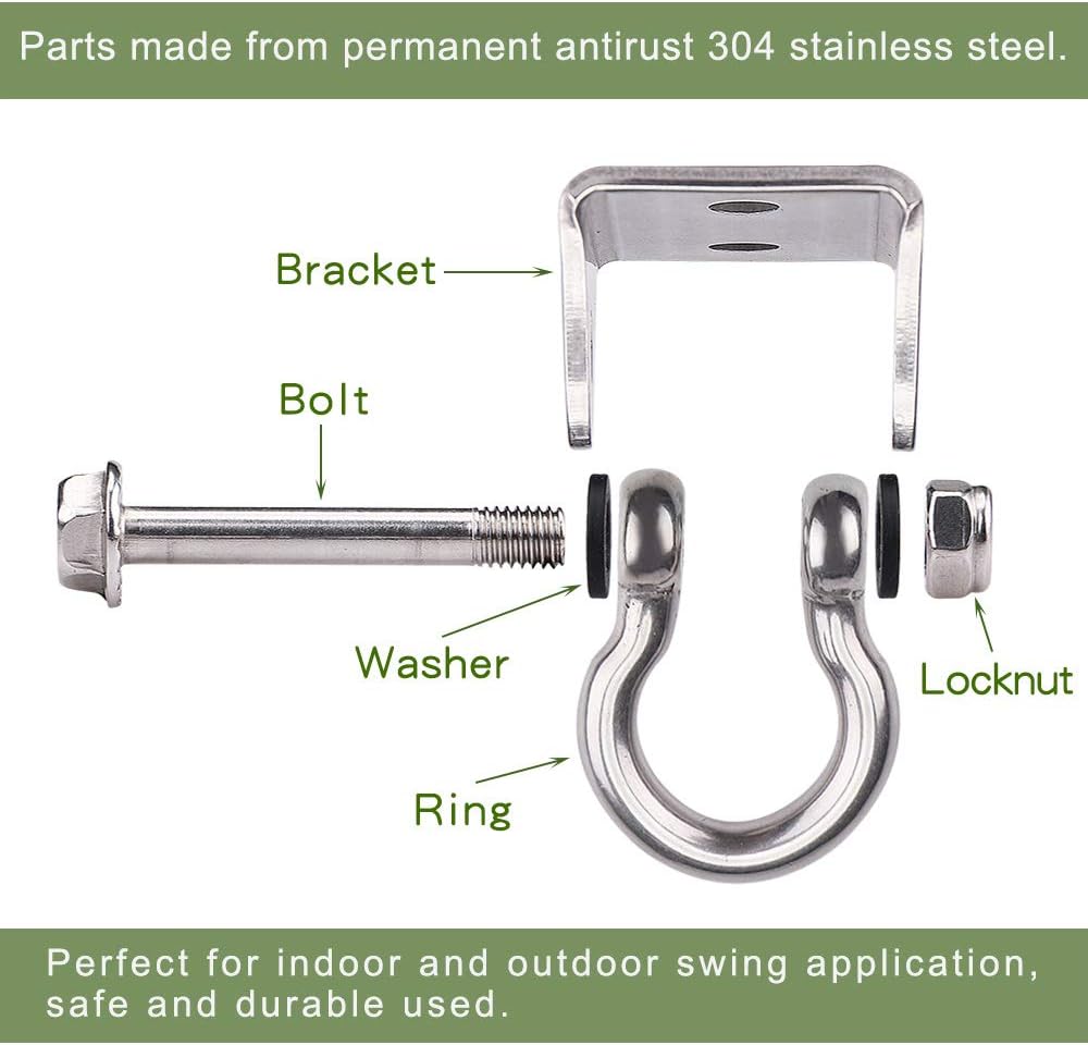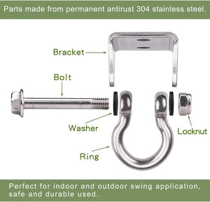 - HIGH QUALITY: Swing hangers made of PERMANENT ANTIRUST 304 stainless steel, perfect used as suspension hooks, wall ceiling mount swing set bracket, hanging hardware for any indoor and outdoor playground swing and suspension equipment Accessories.