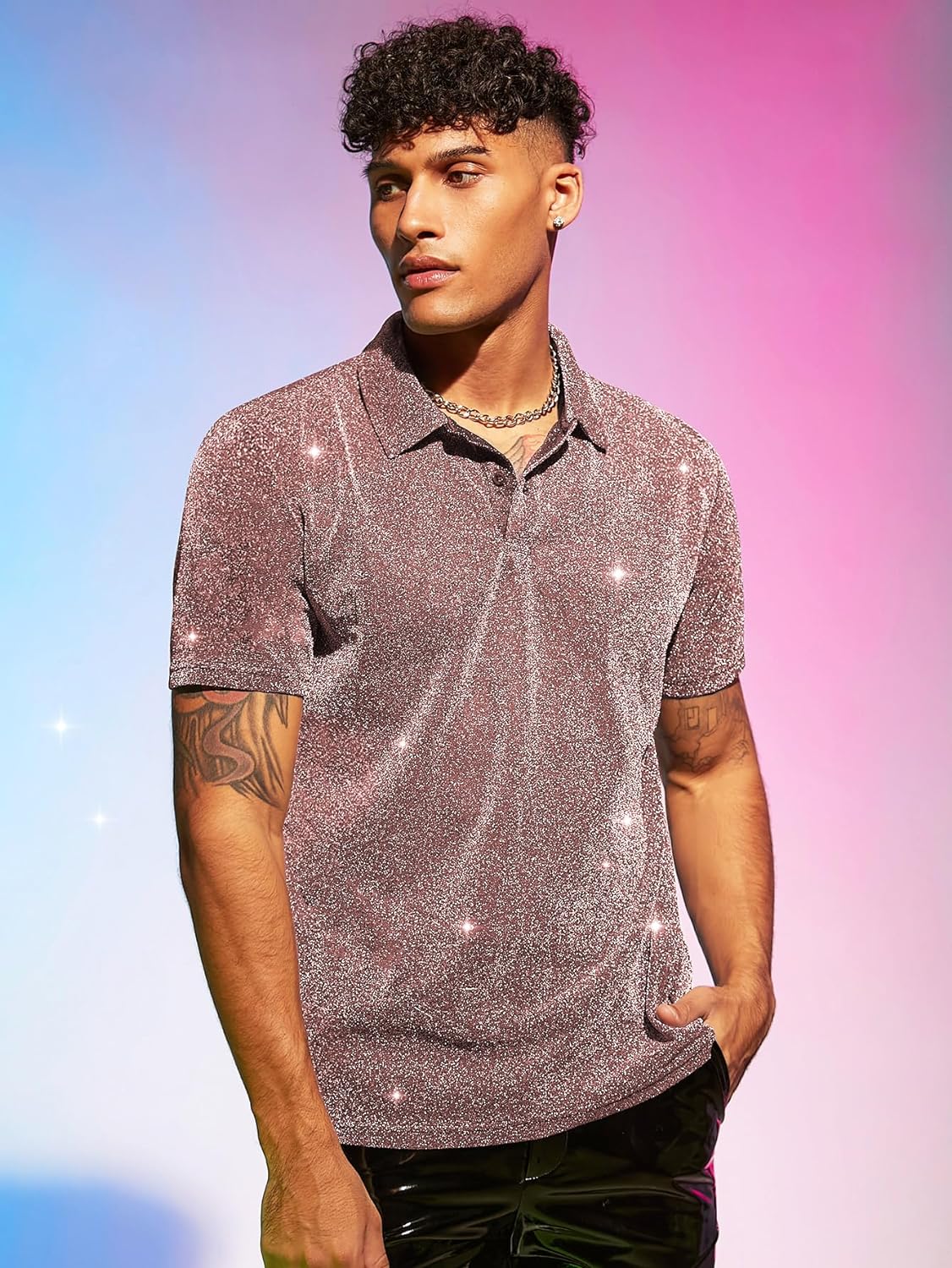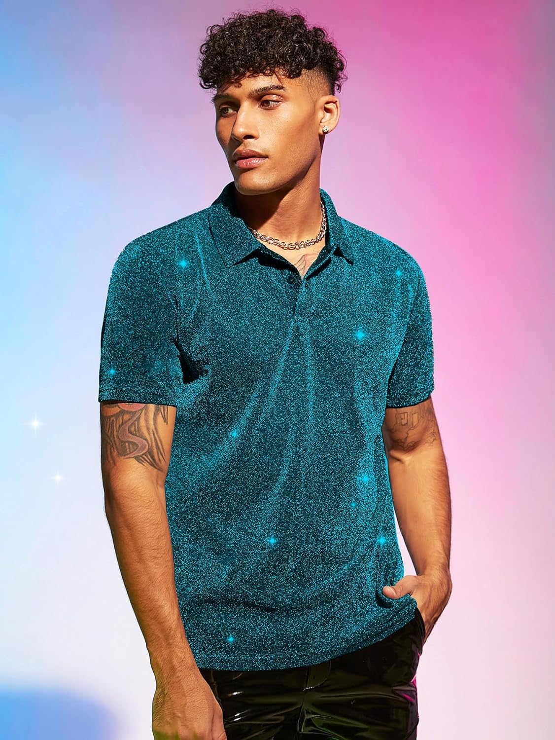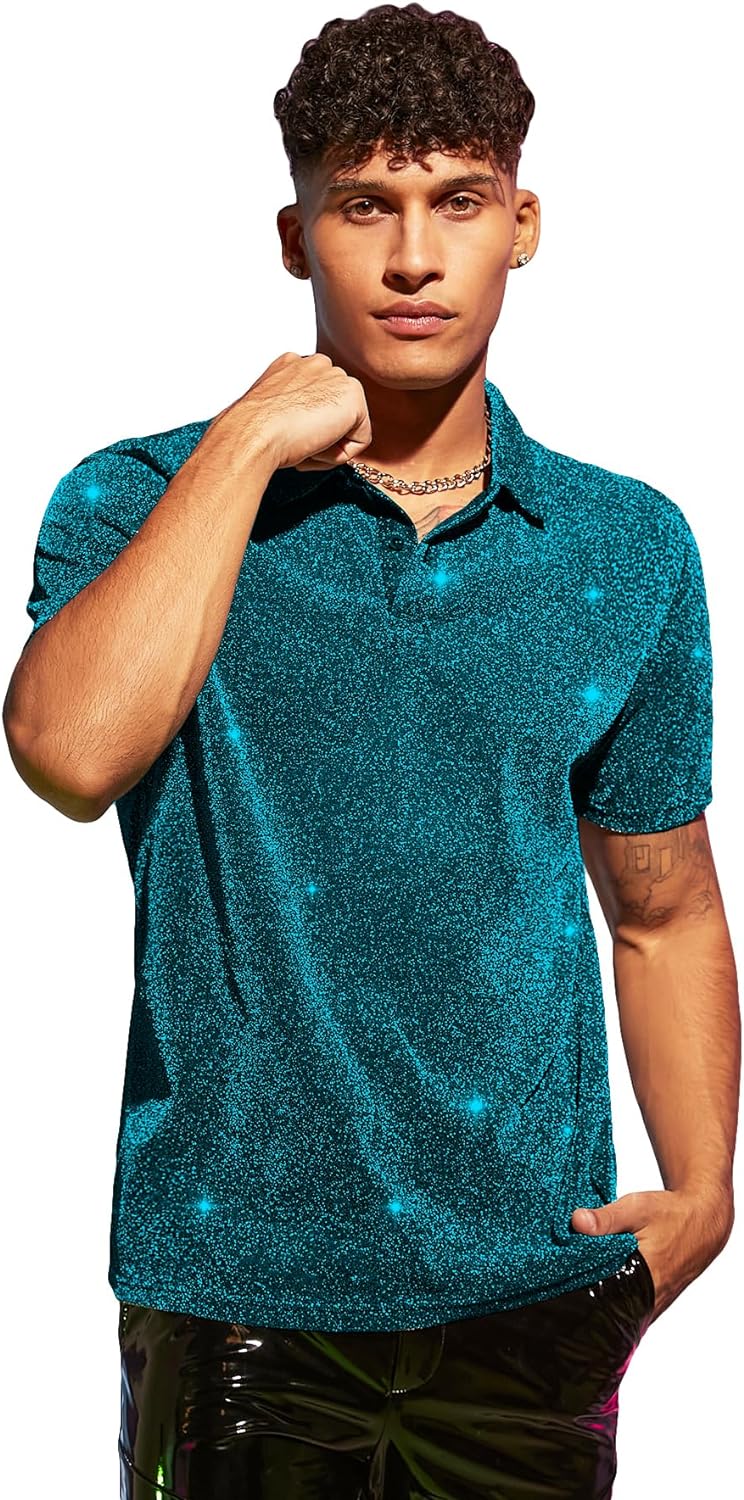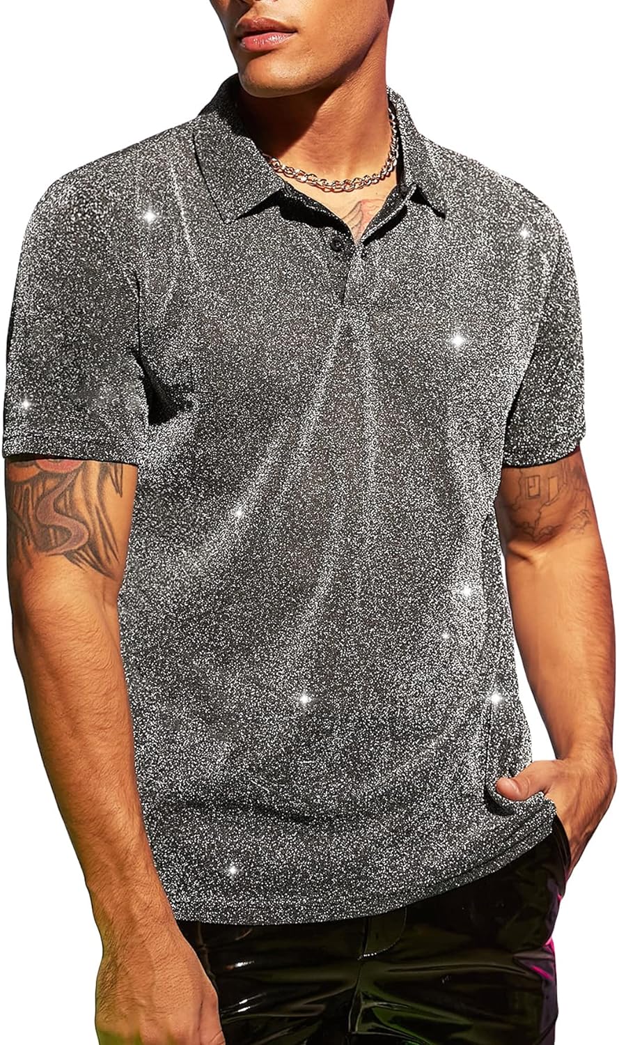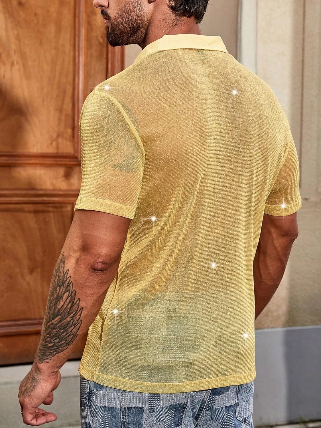 WDIRARA Men's Metallic Mesh V Neck Short Sleeve Sheer Top Golf Polo Shirts Partywear