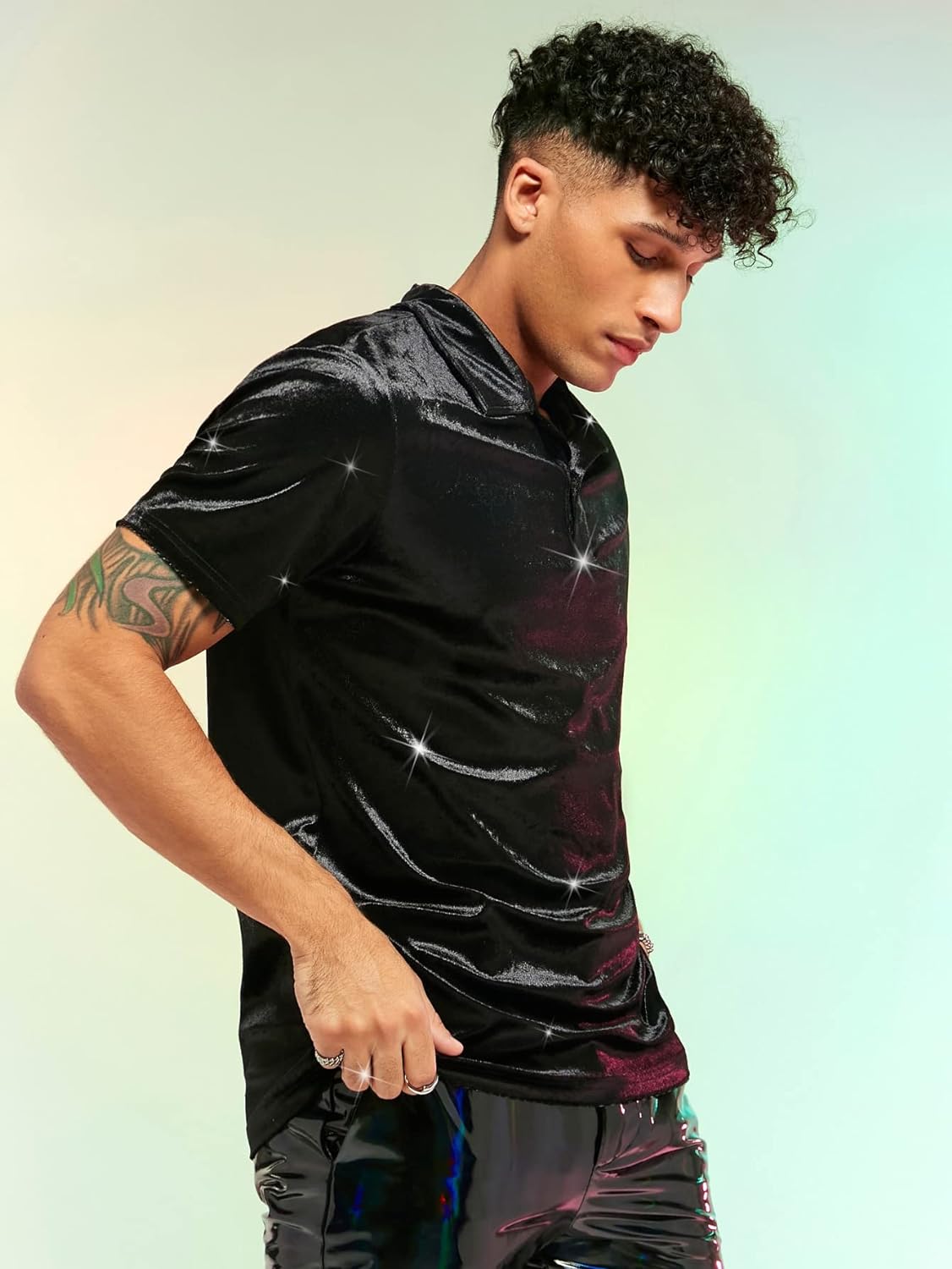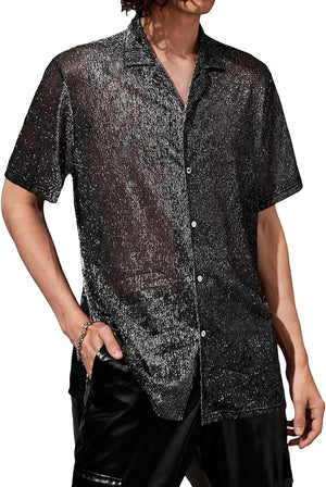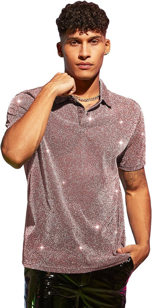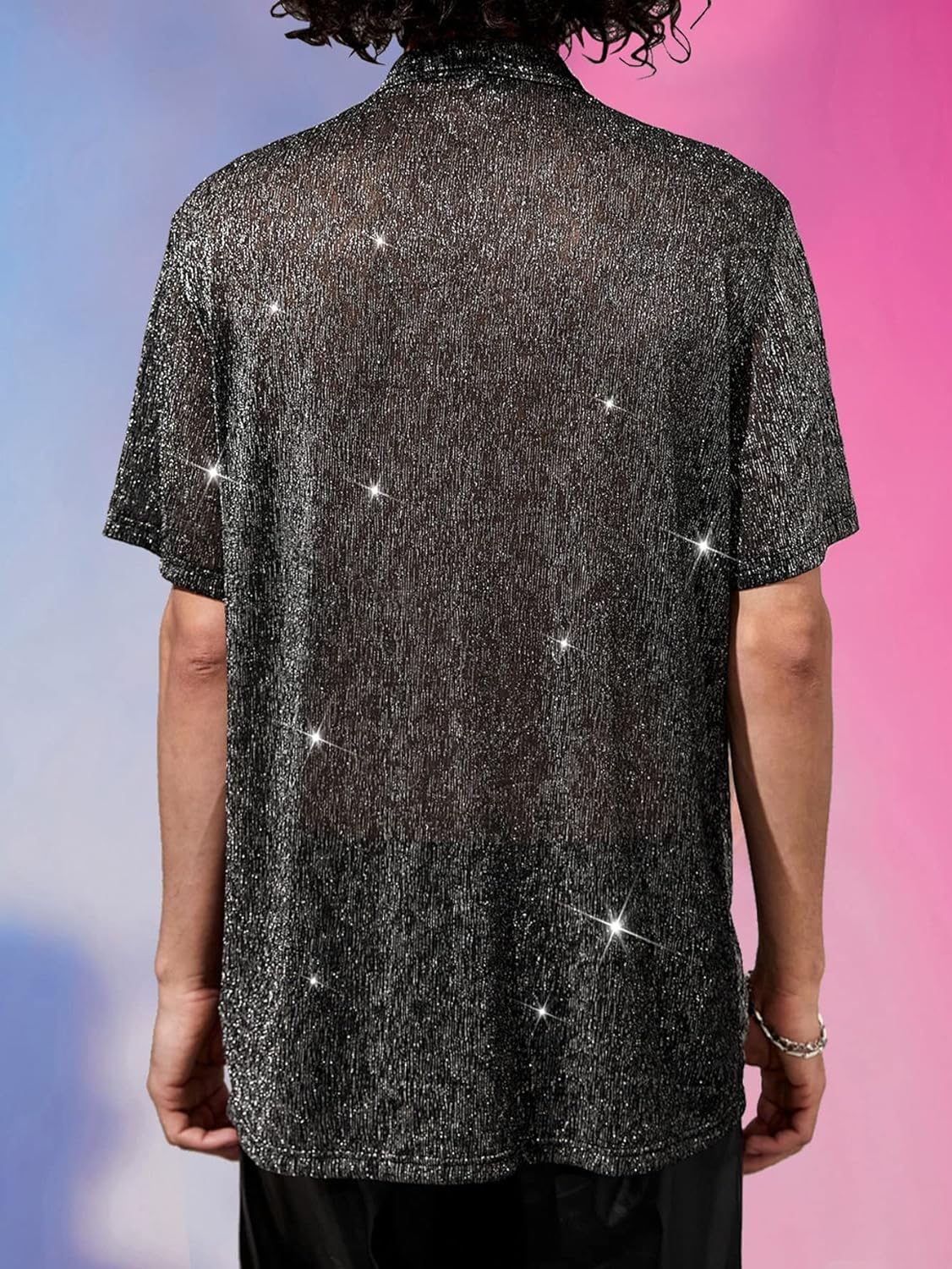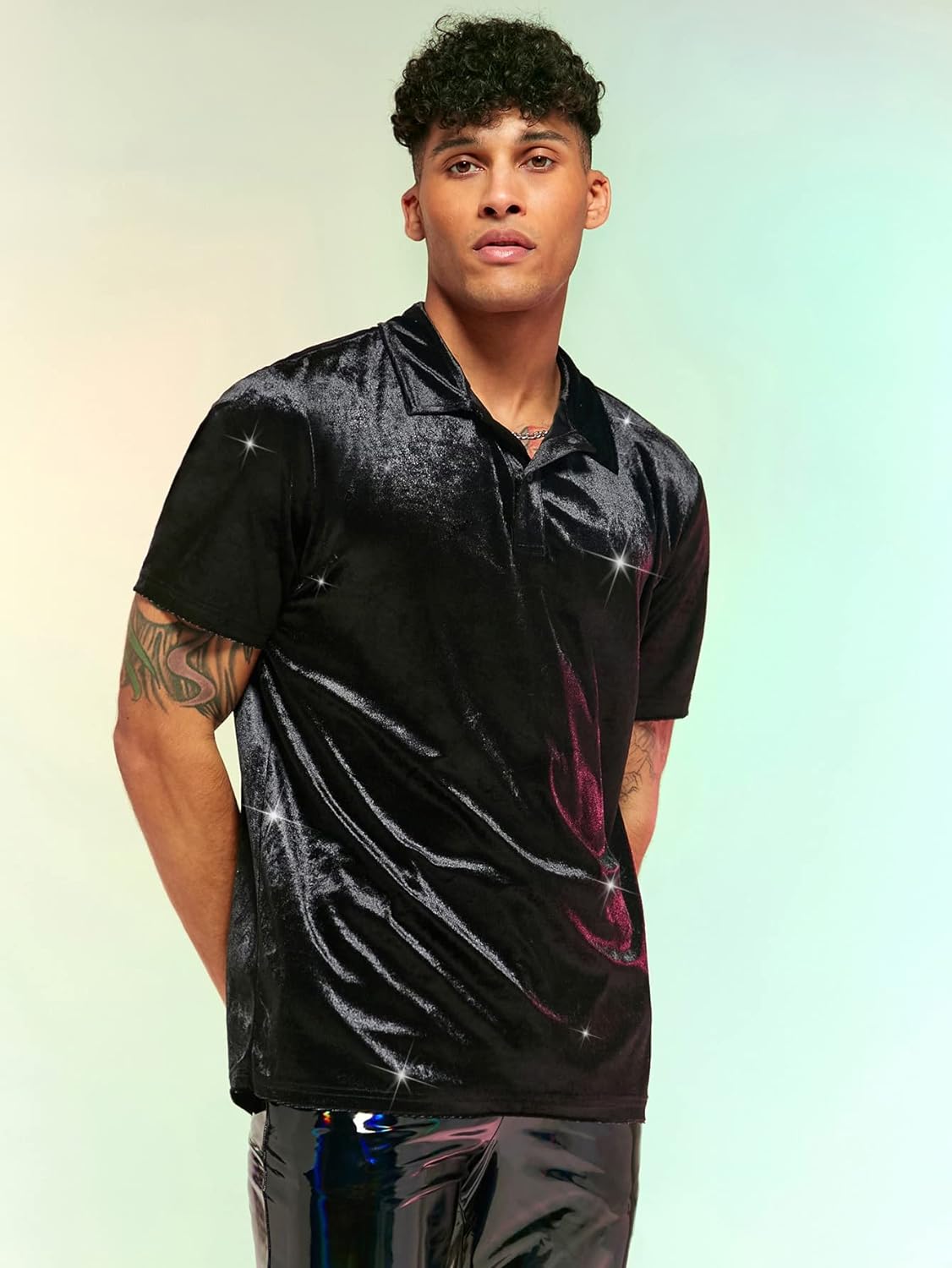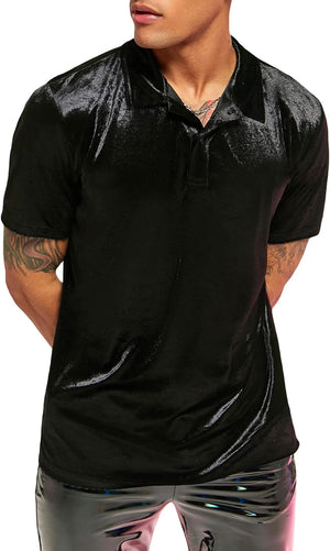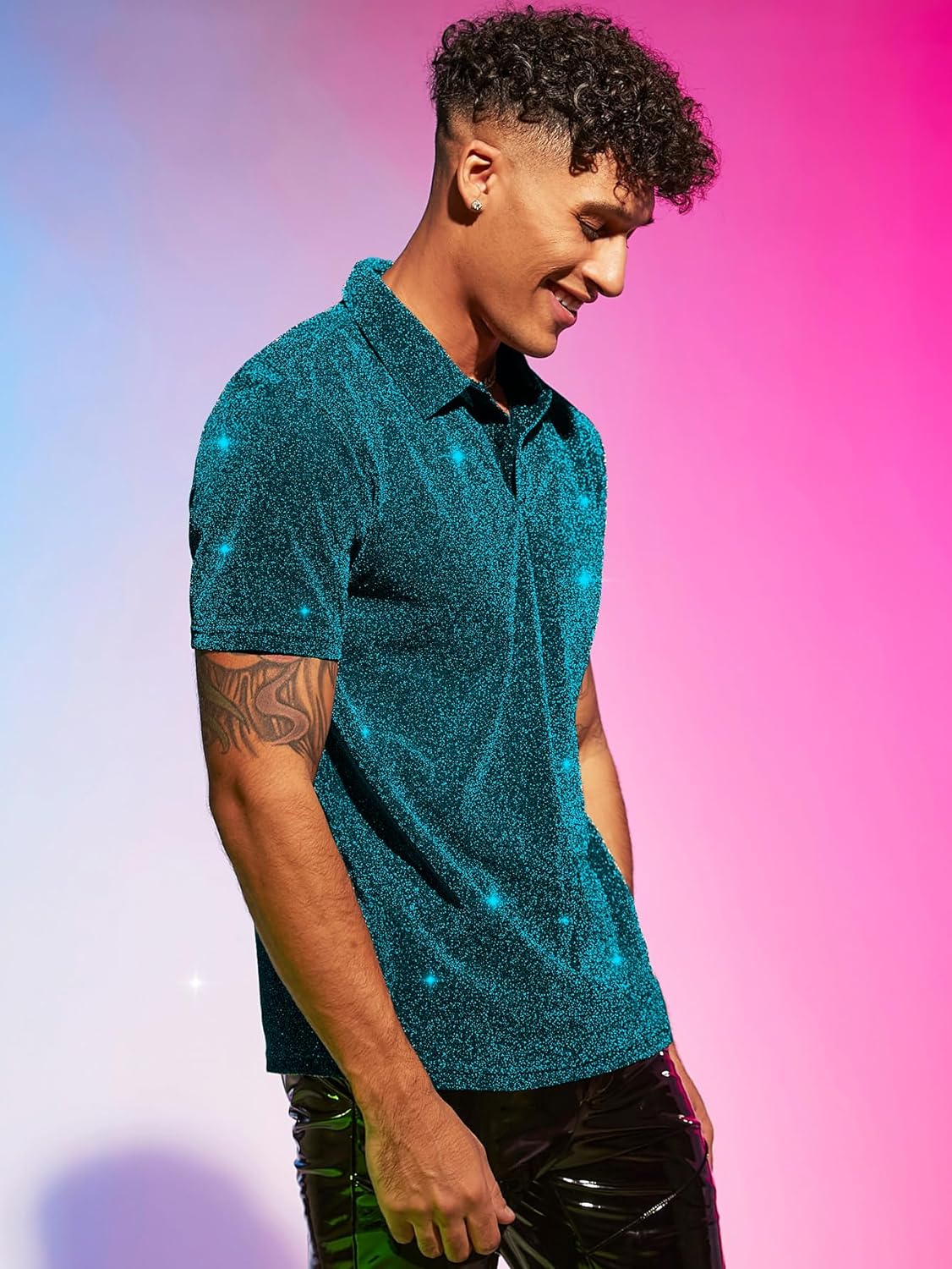 WDIRARA Men's Metallic Mesh V Neck Short Sleeve Sheer Top Golf Polo Shirts Partywear