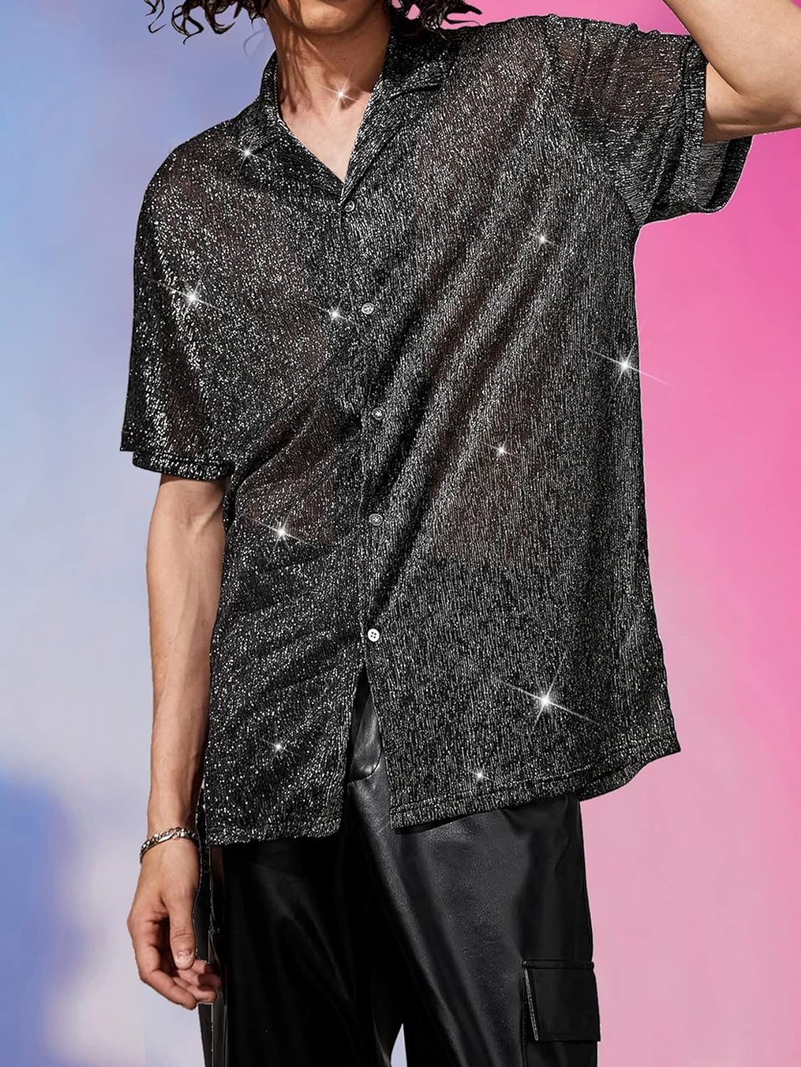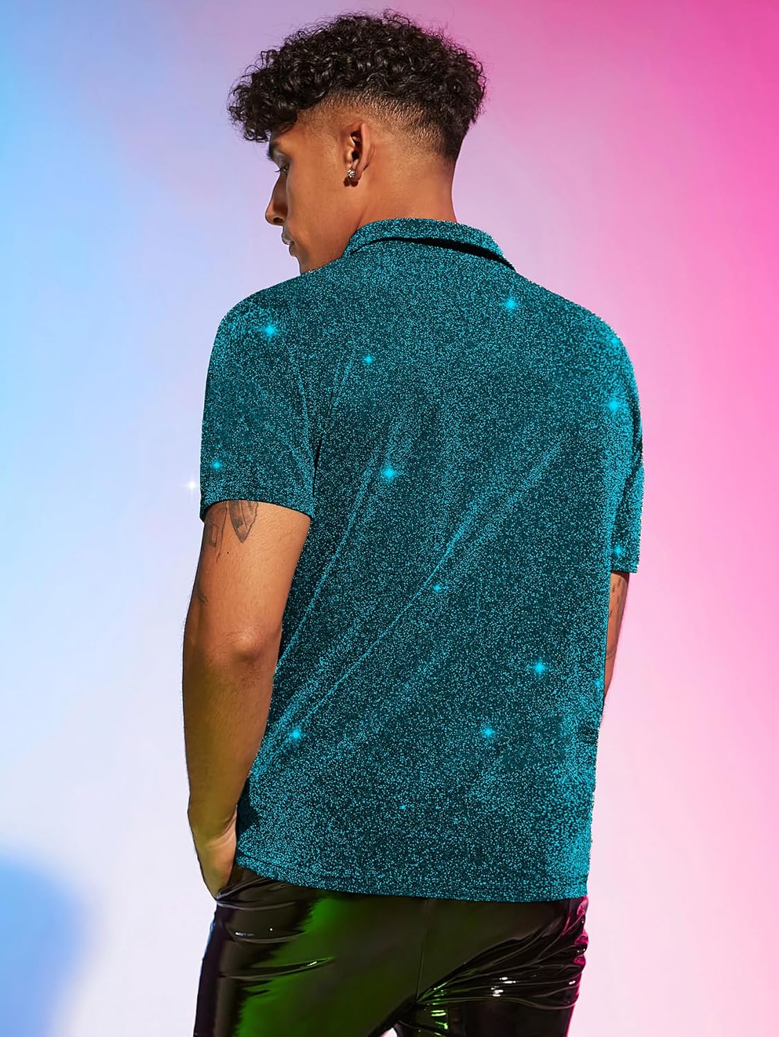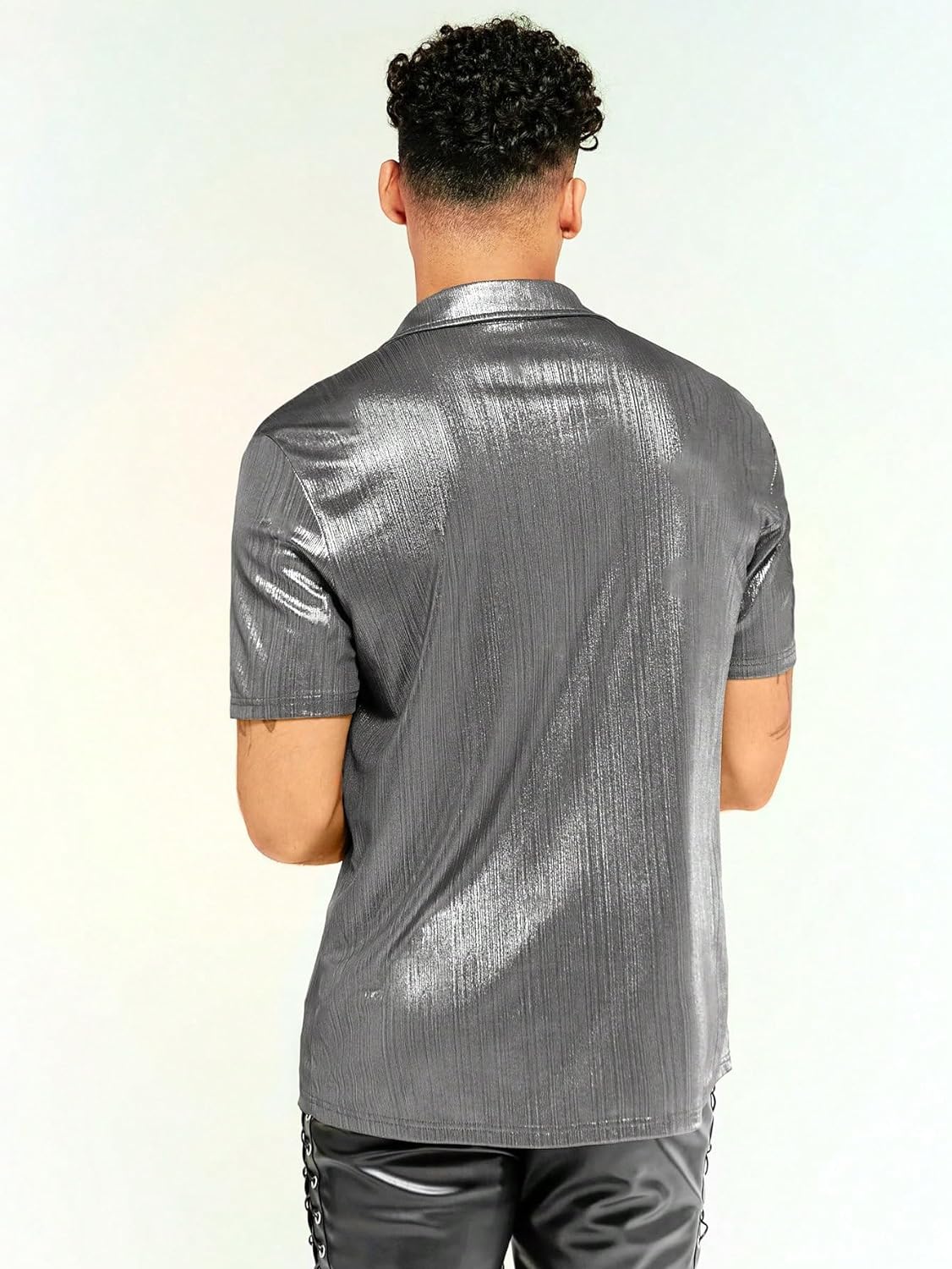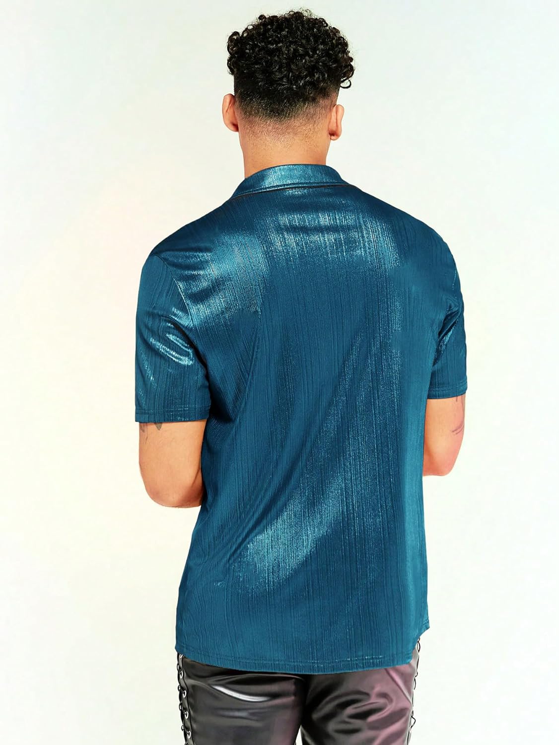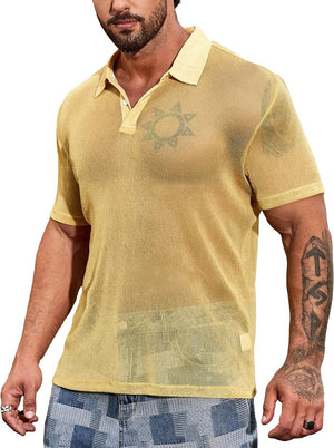WDIRARA Men's Metallic Mesh V Neck Short Sleeve Sheer Top Golf Polo Shirts Partywear