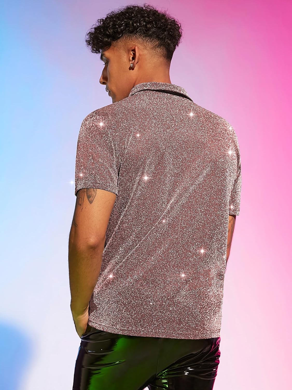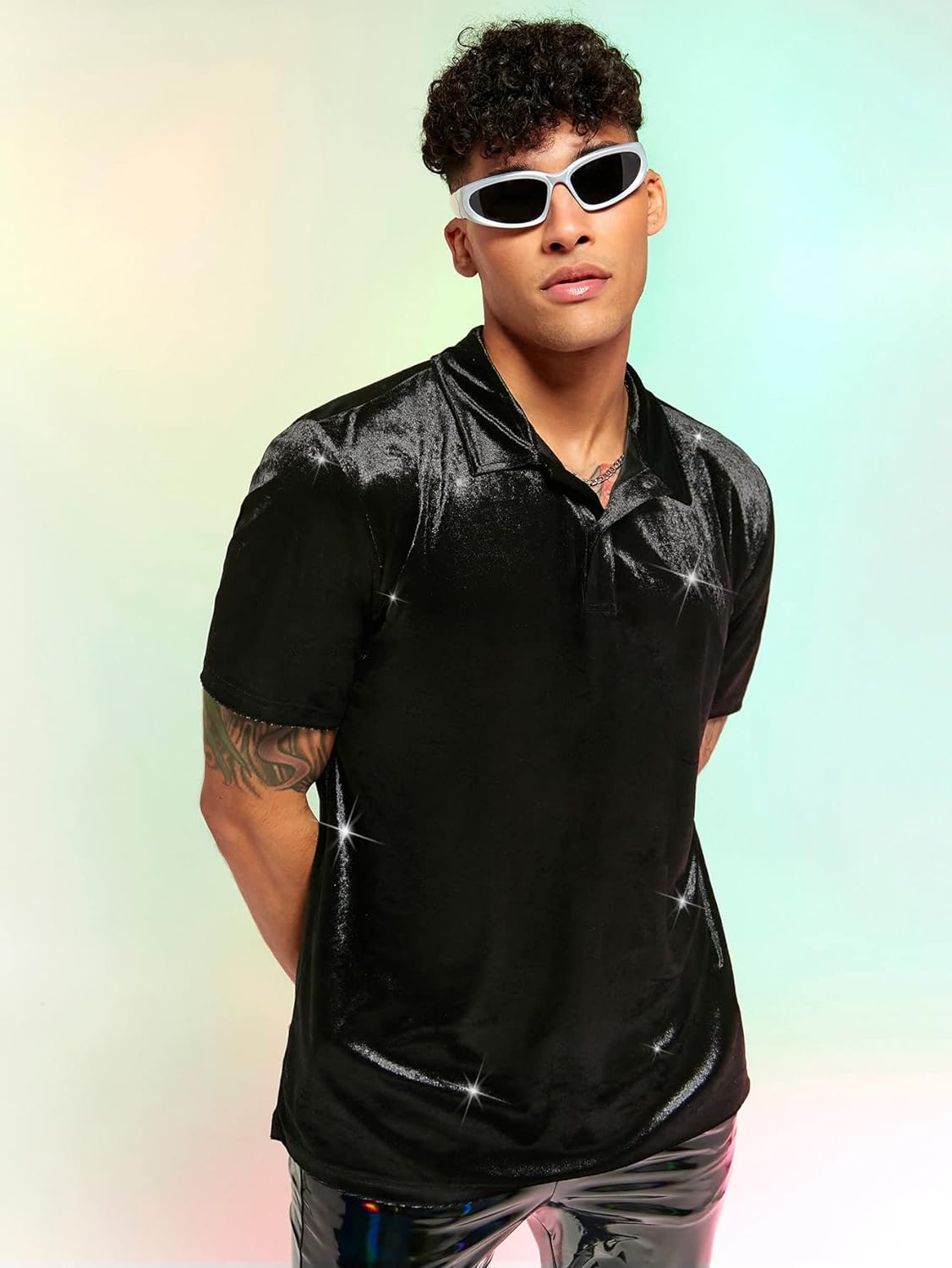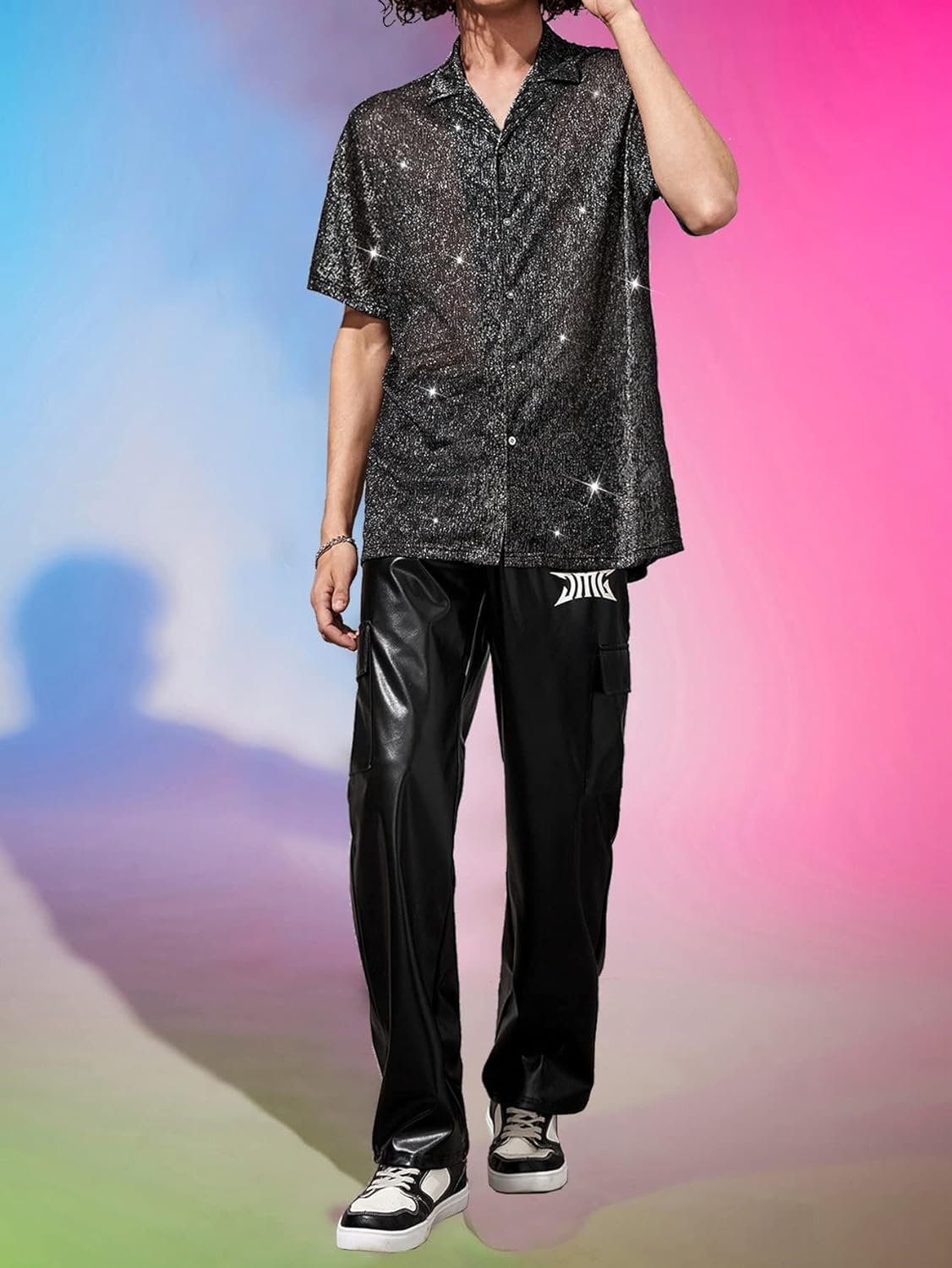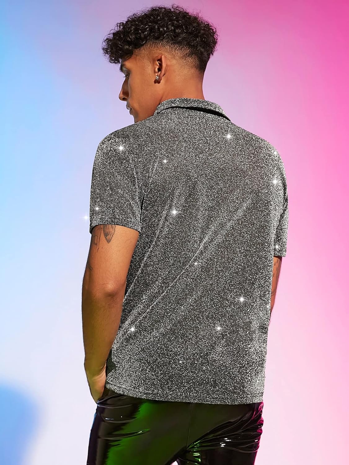 WDIRARA Men's Metallic Mesh V Neck Short Sleeve Sheer Top Golf Polo Shirts Partywear