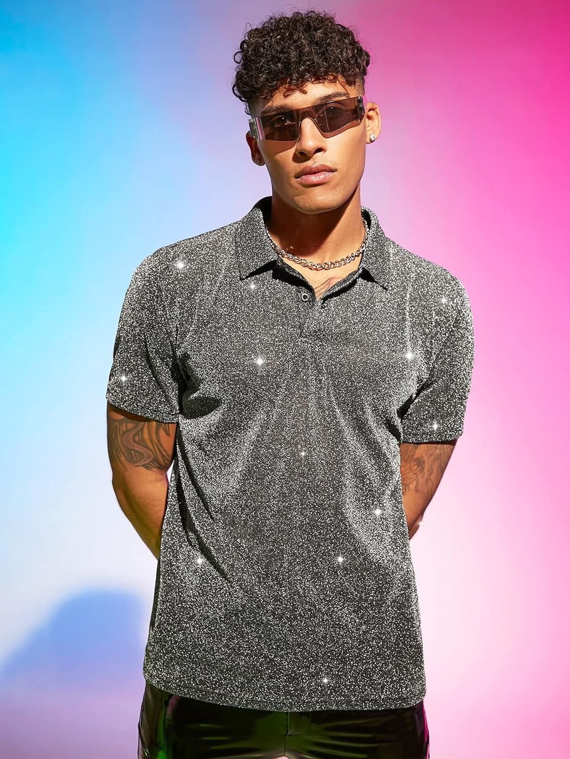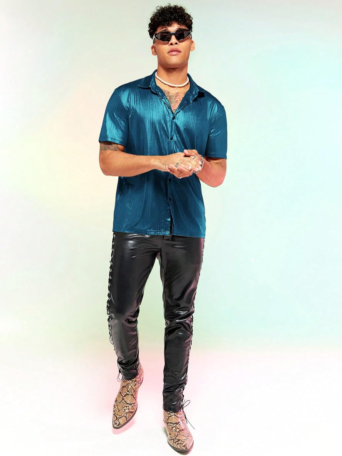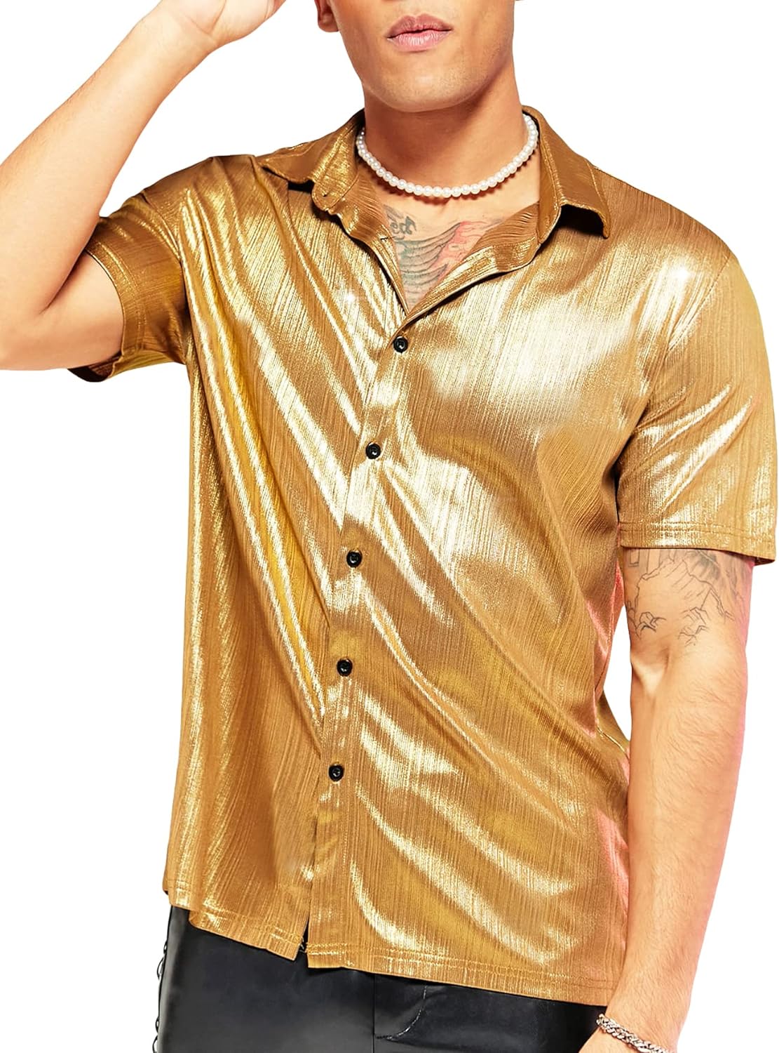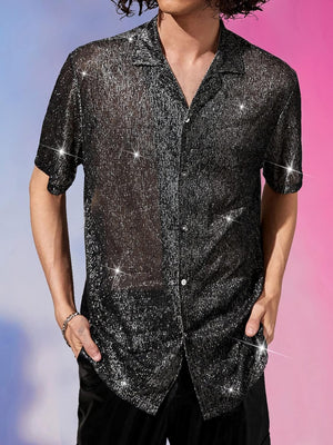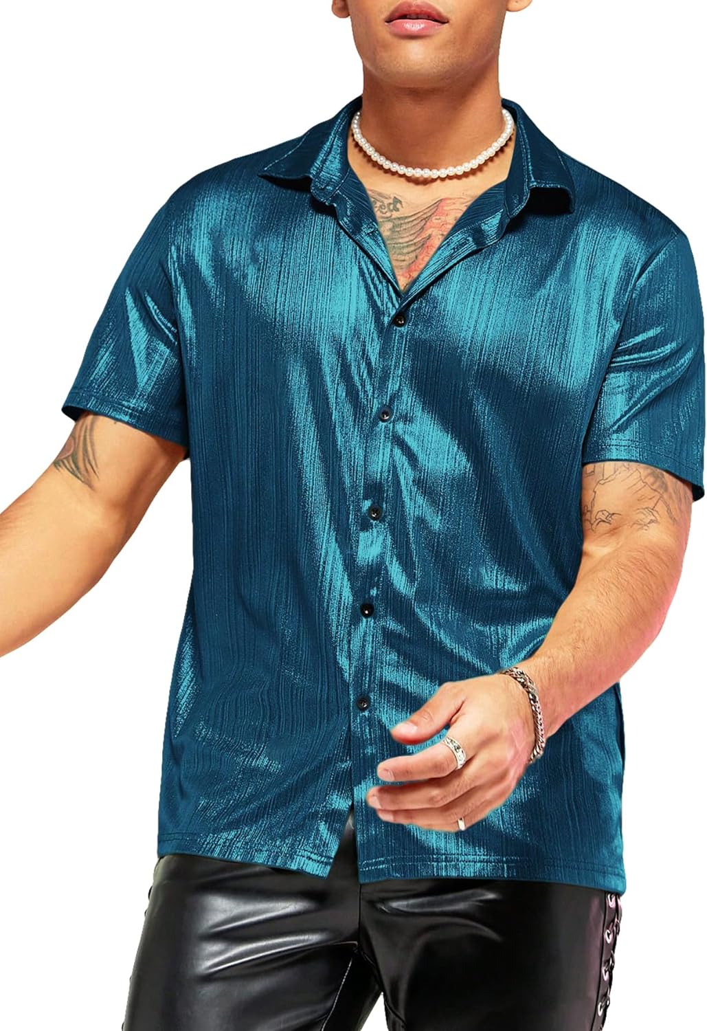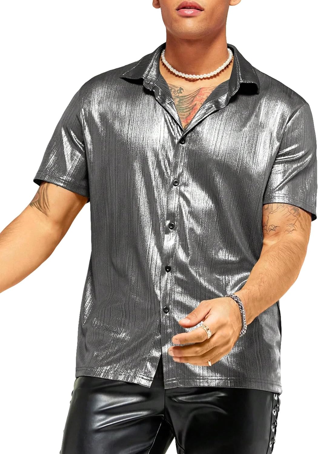 WDIRARA Men's Metallic Mesh V Neck Short Sleeve Sheer Top Golf Polo Shirts Partywear
