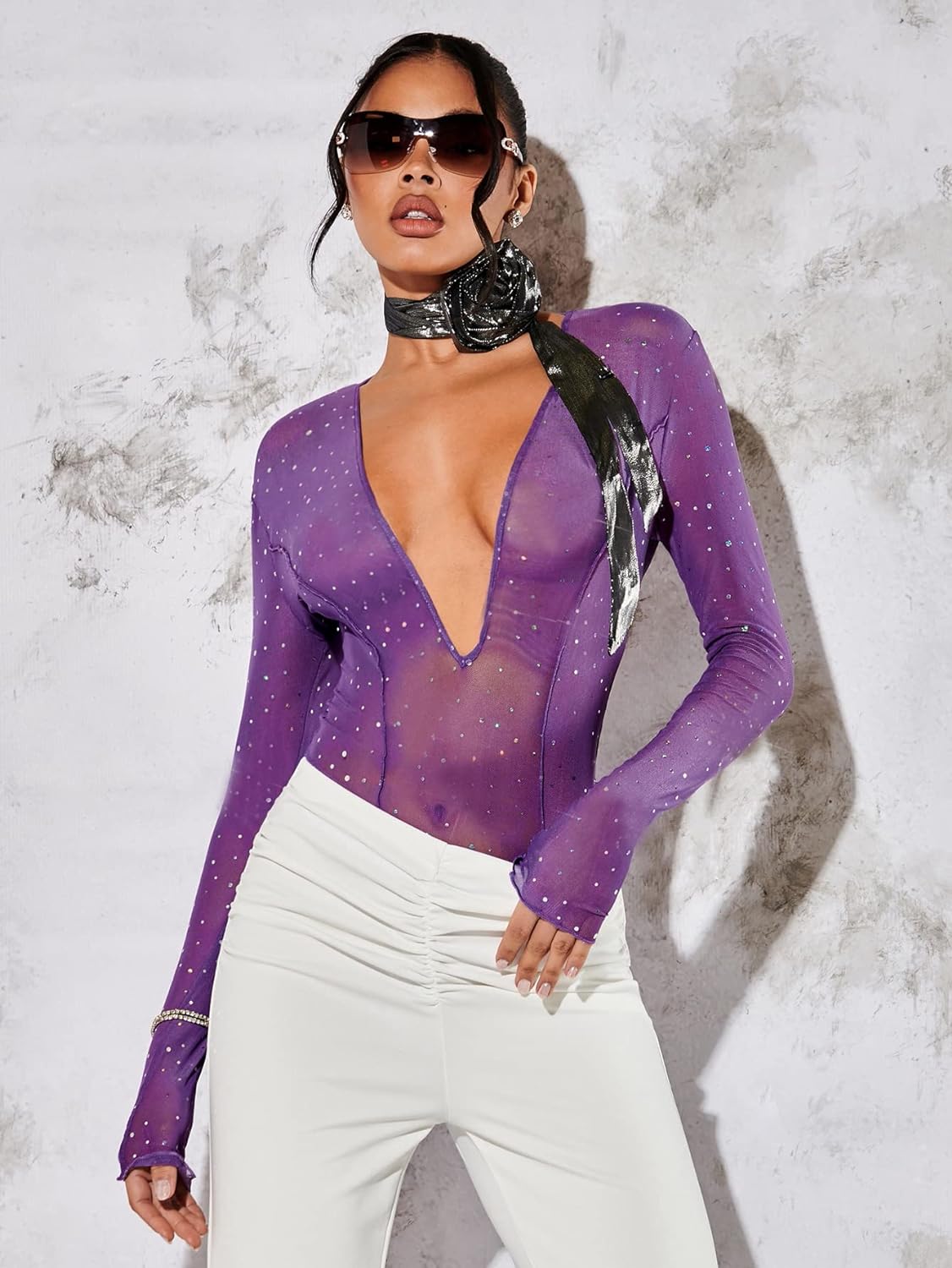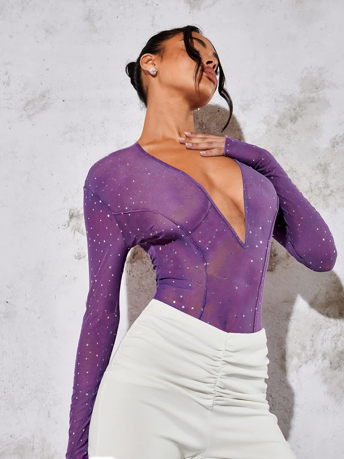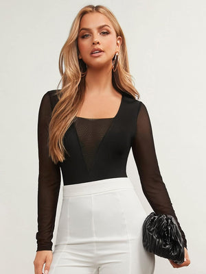 WDIRARA Women's Square Neck Mesh Long Sleeve Elegant Simple Fitted Top Bodysuit
