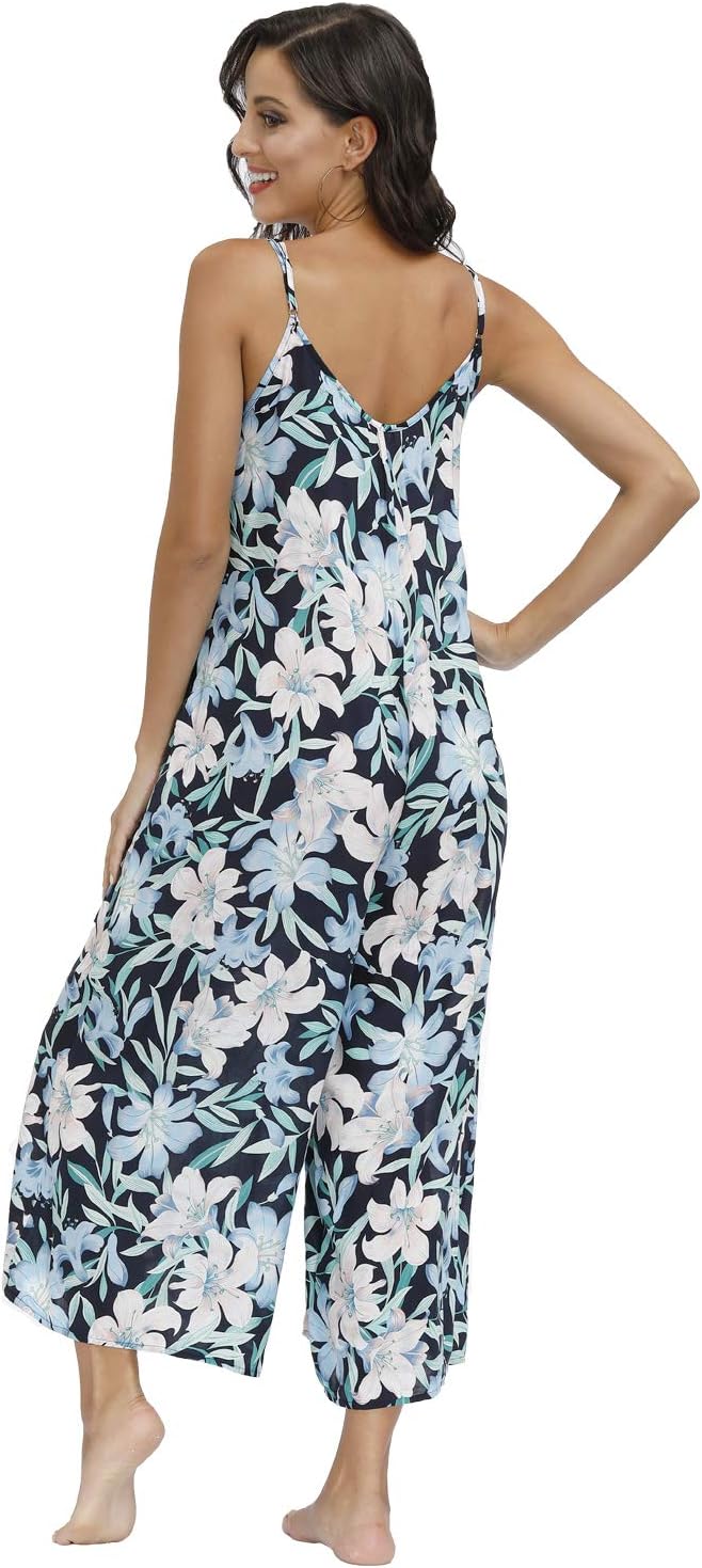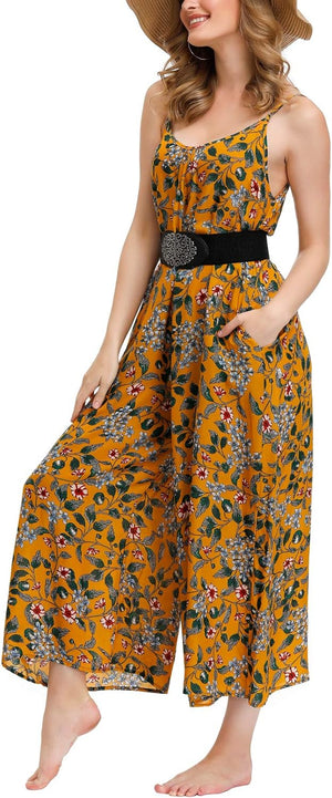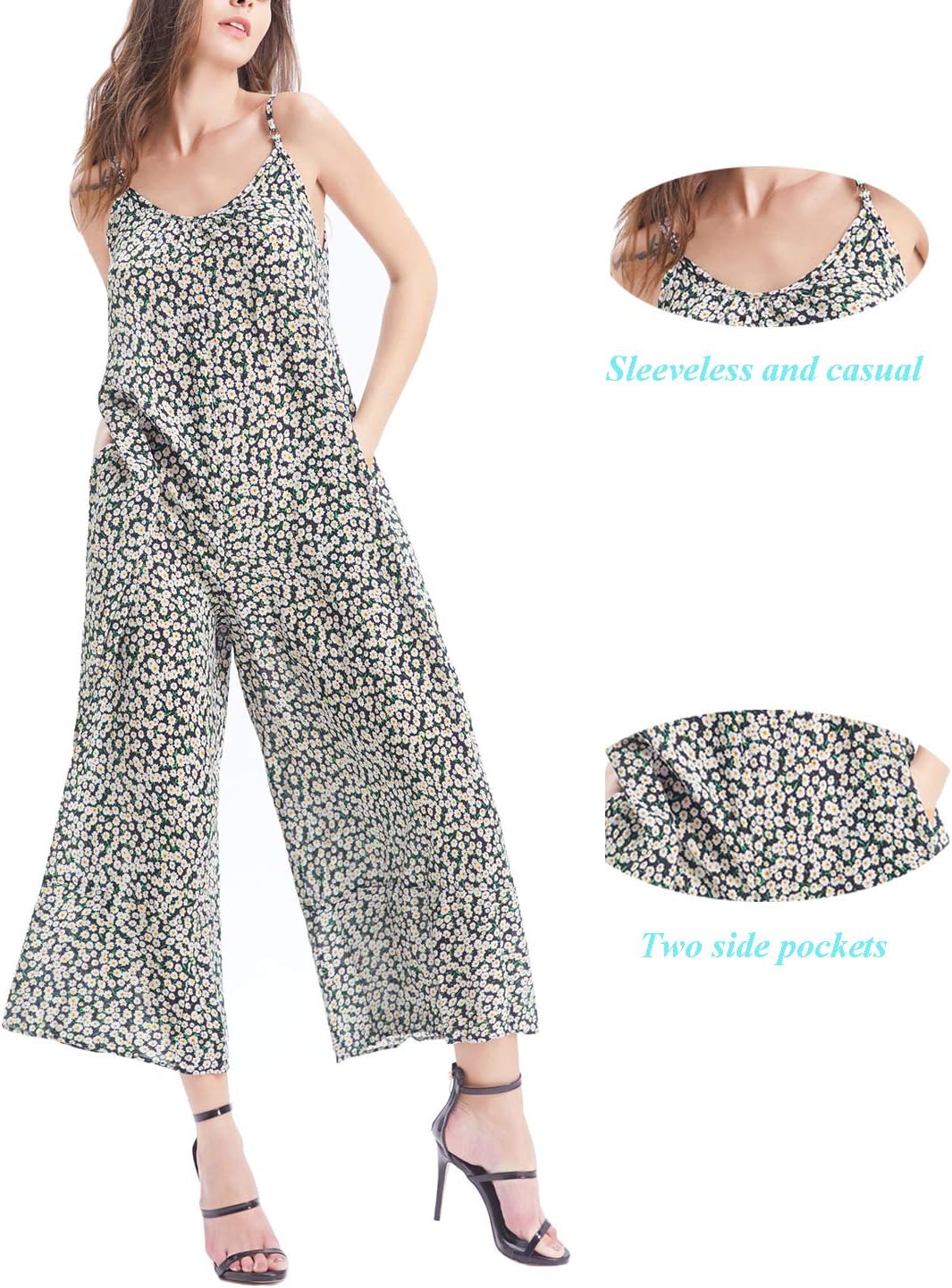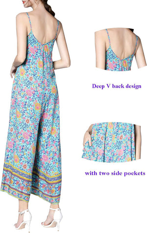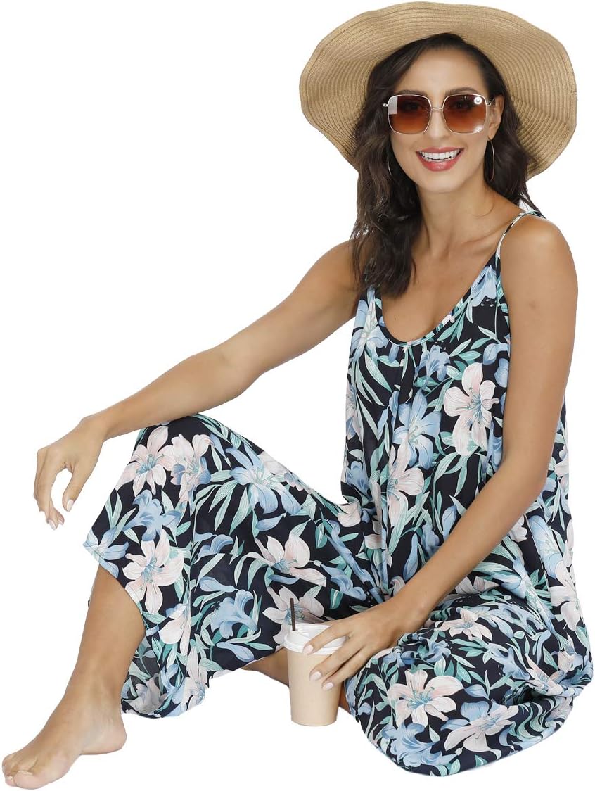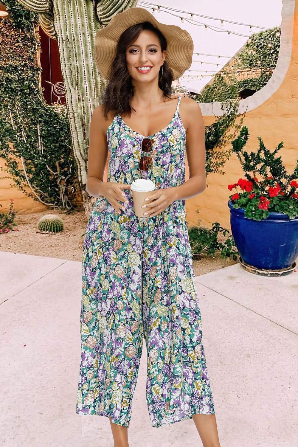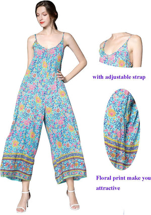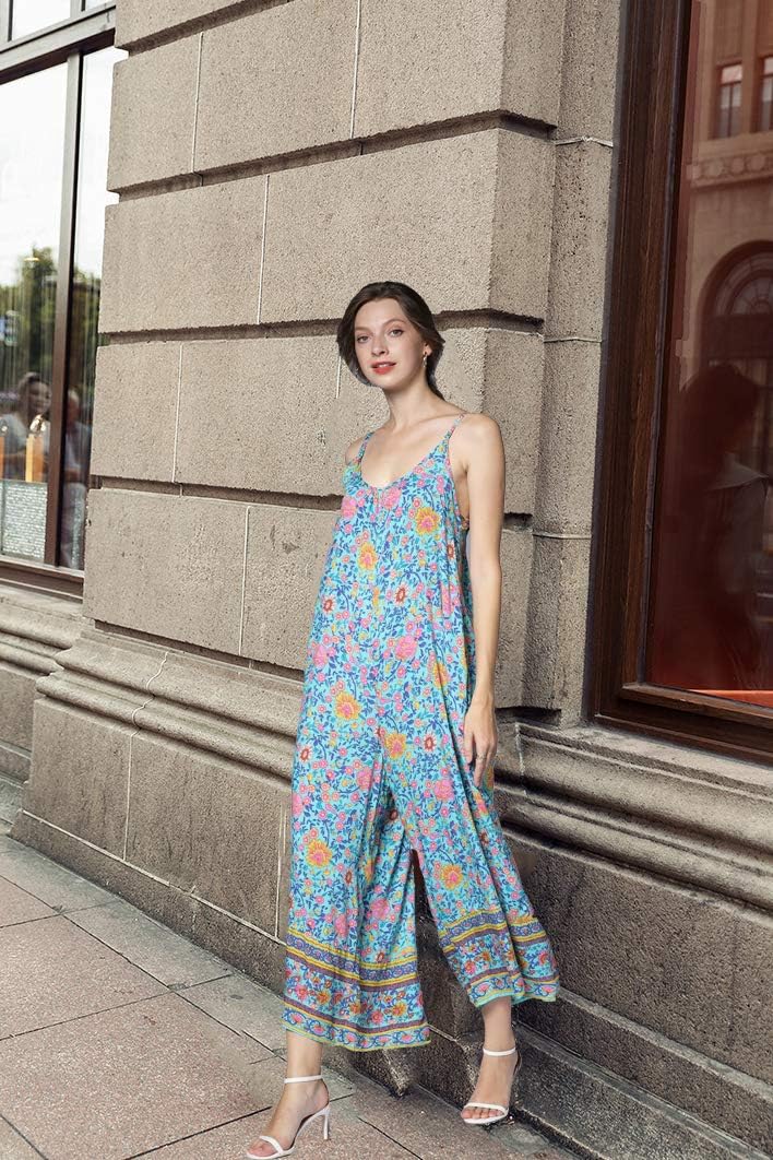 wexcen Jumpsuits for Women Floral Wide Leg Spaghetti Strap Sleeveless Casual Loose Ethnic Long Rompers with Pockets
