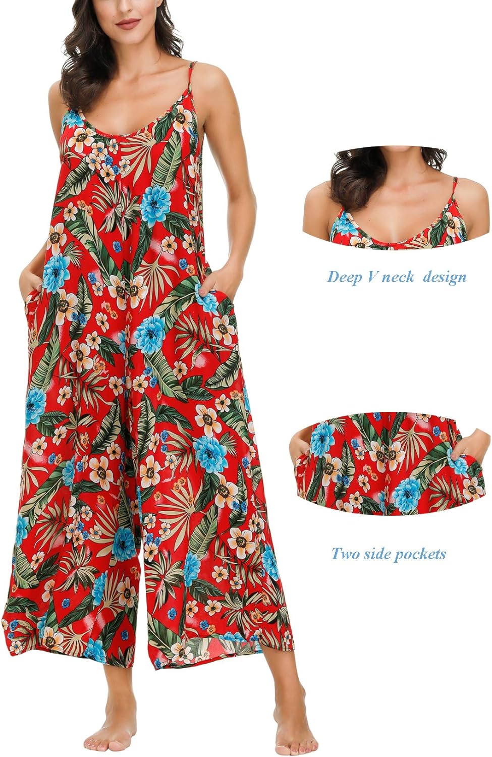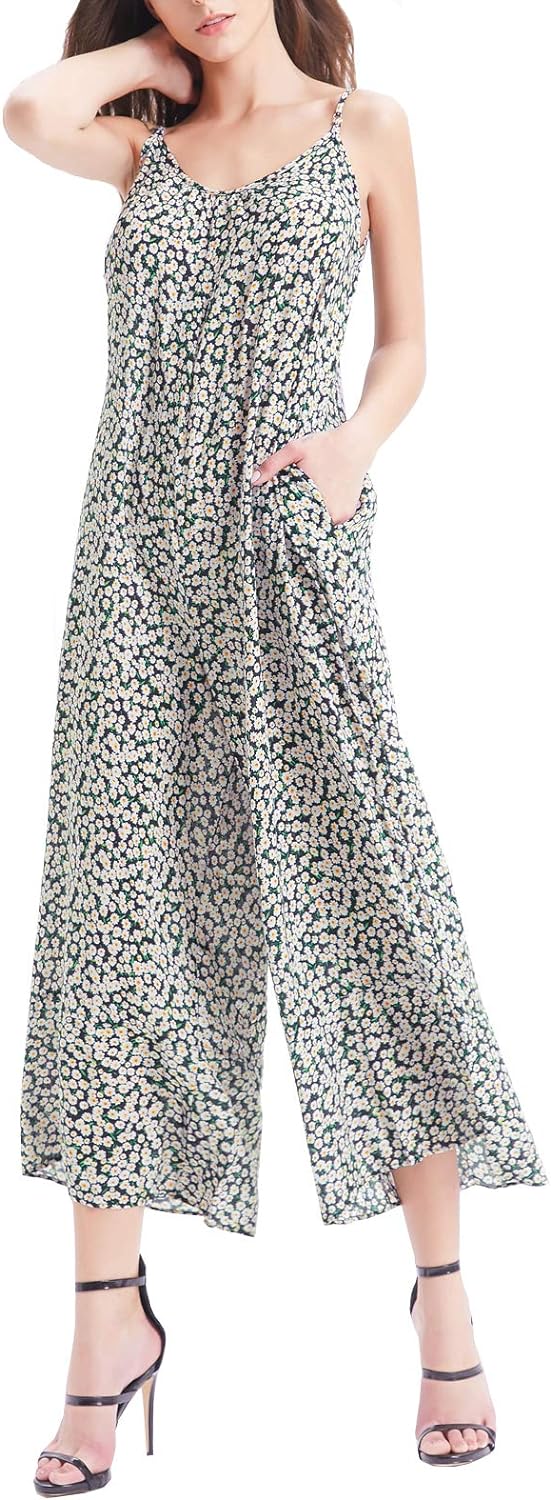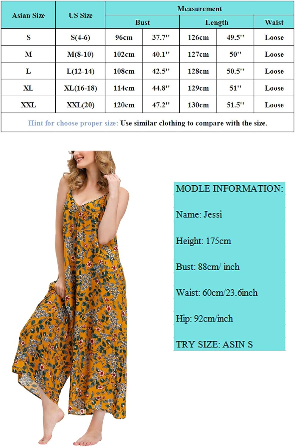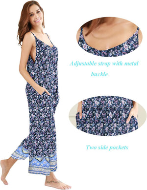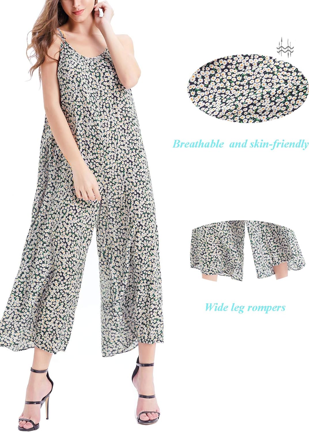 wexcen Jumpsuits for Women Floral Wide Leg Spaghetti Strap Sleeveless Casual Loose Ethnic Long Rompers with Pockets