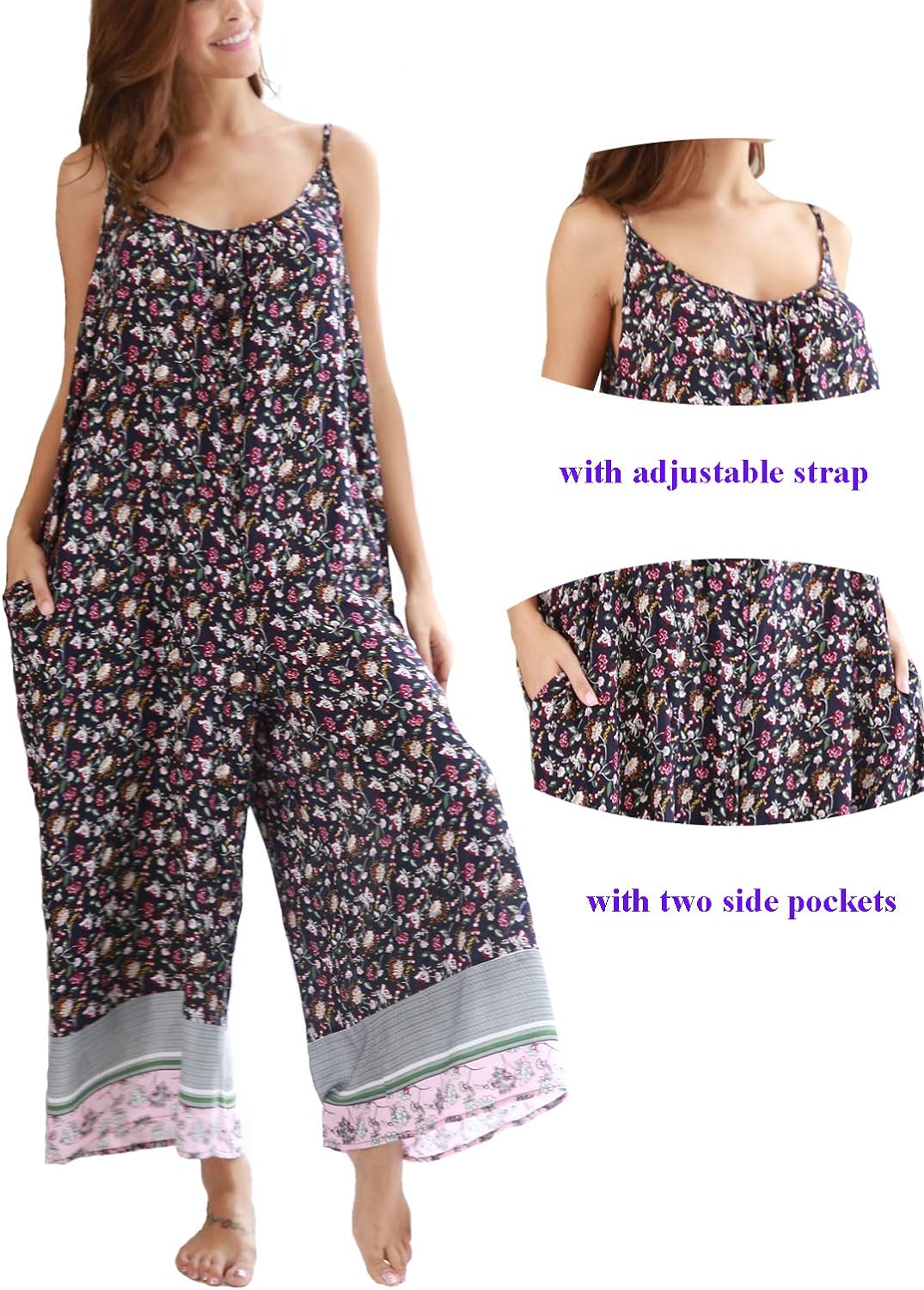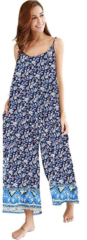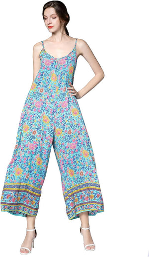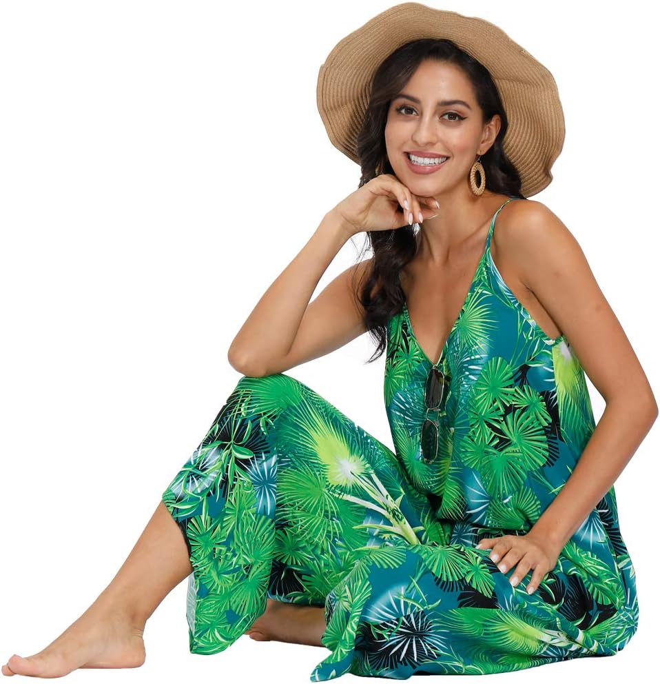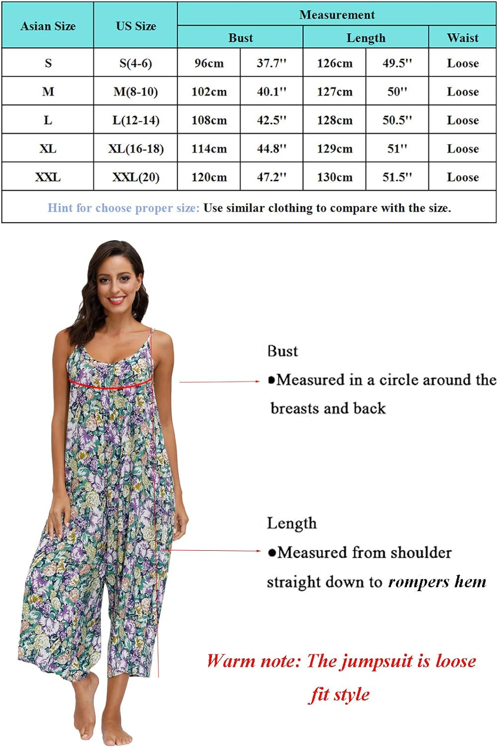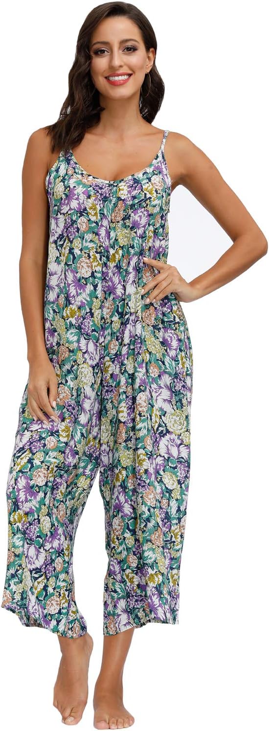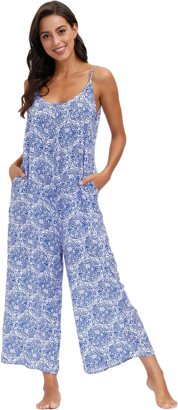 wexcen Jumpsuits for Women Floral Wide Leg Spaghetti Strap Sleeveless Casual Loose Ethnic Long Rompers with Pockets