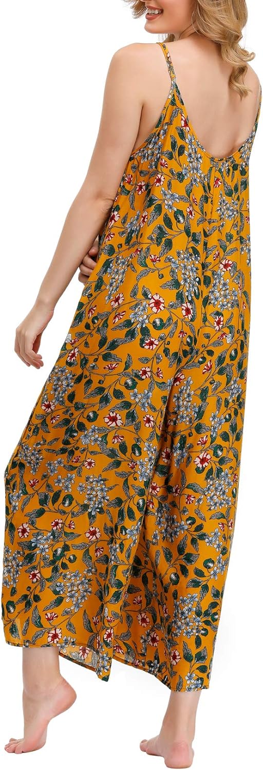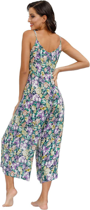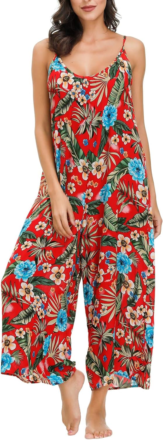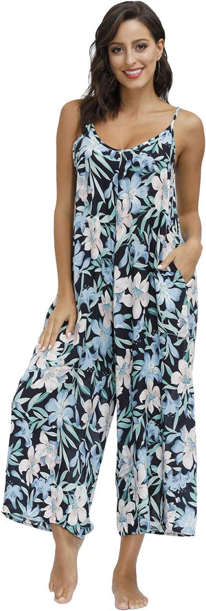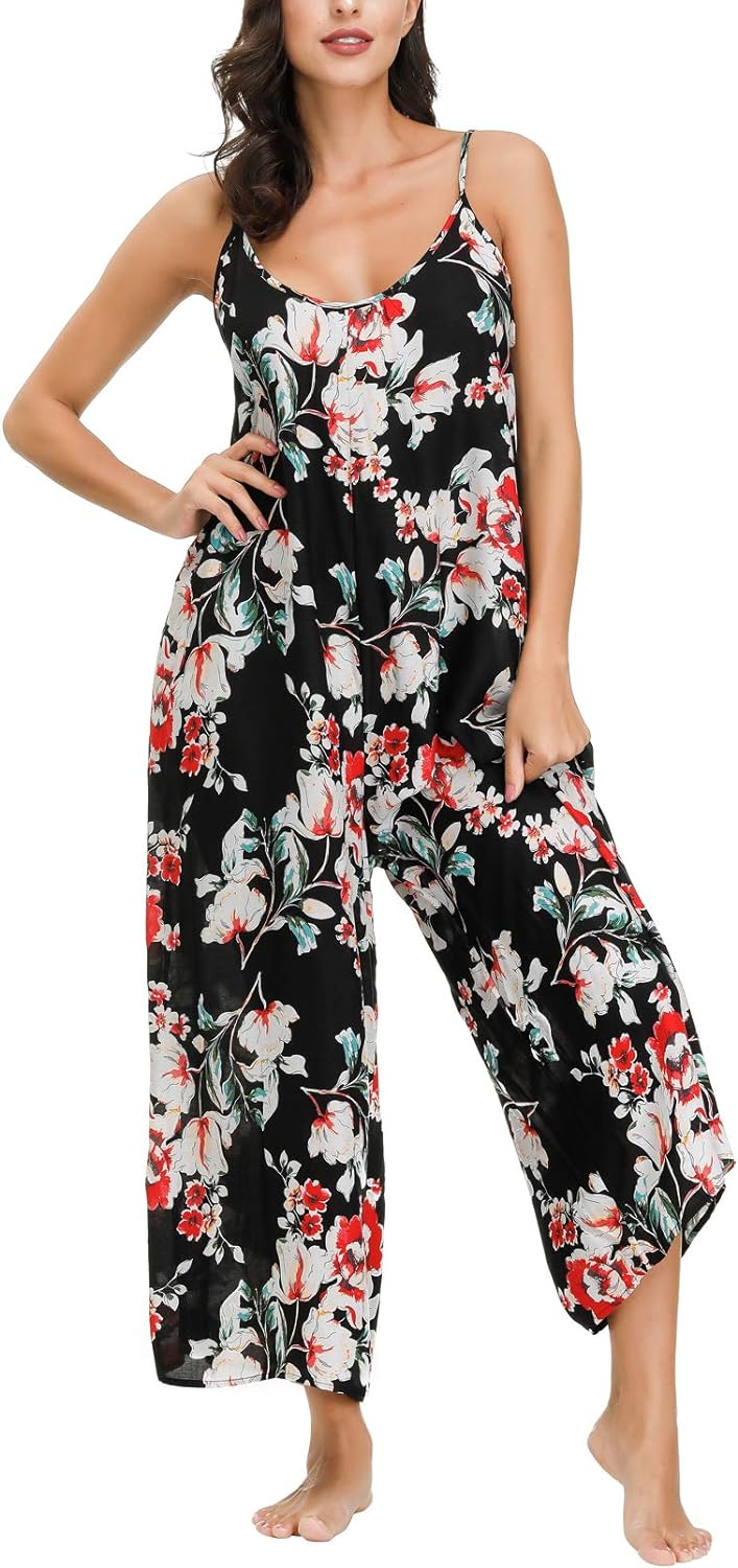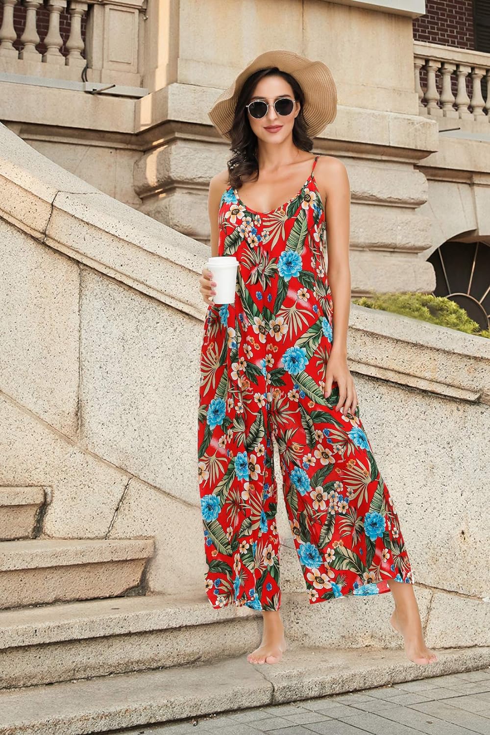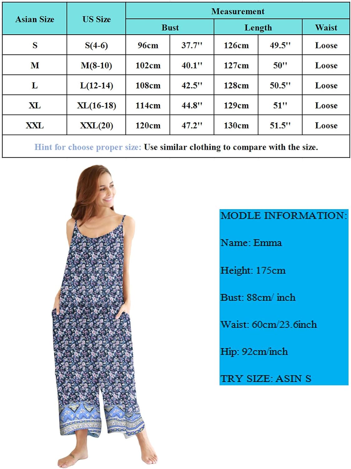 wexcen Jumpsuits for Women Floral Wide Leg Spaghetti Strap Sleeveless Casual Loose Ethnic Long Rompers with Pockets