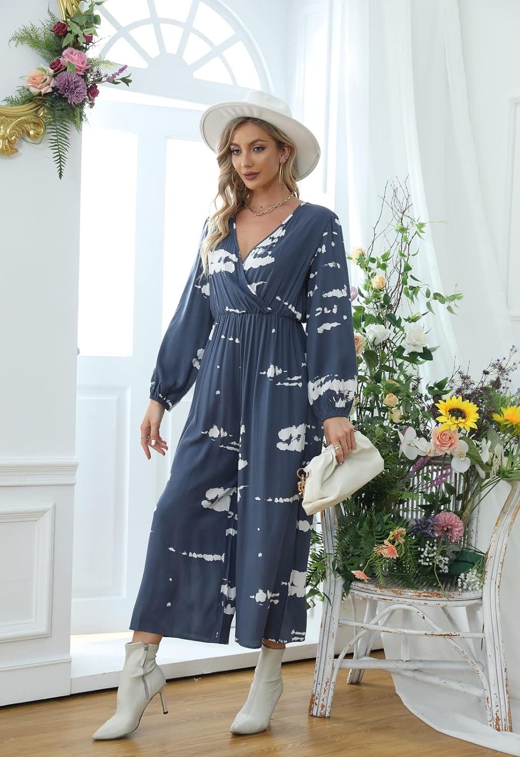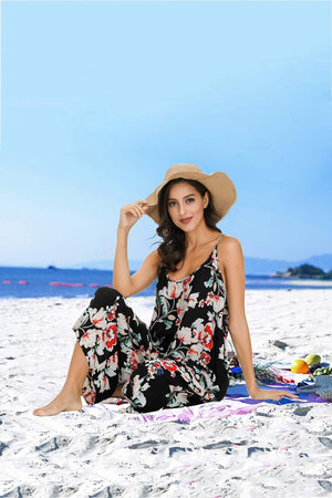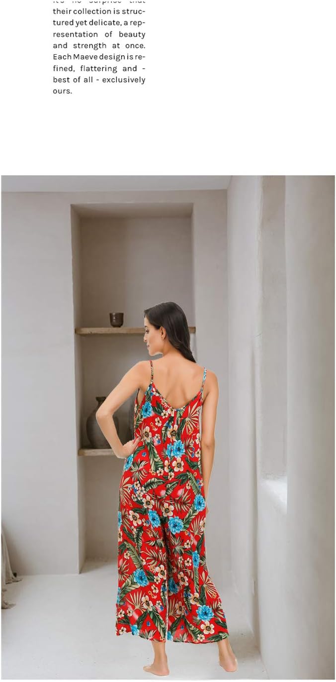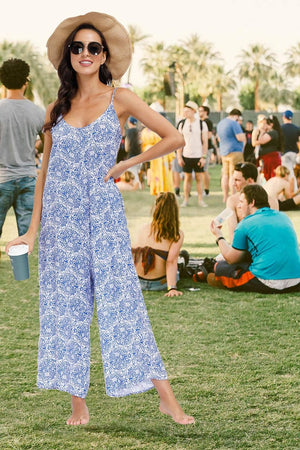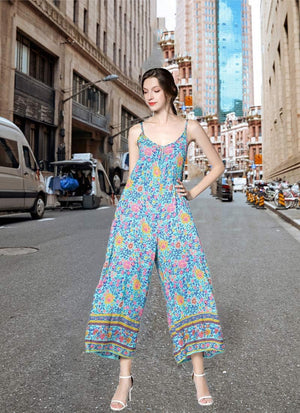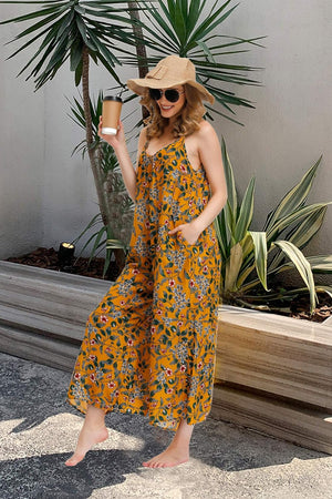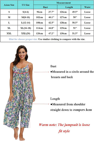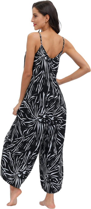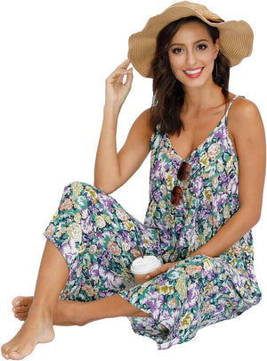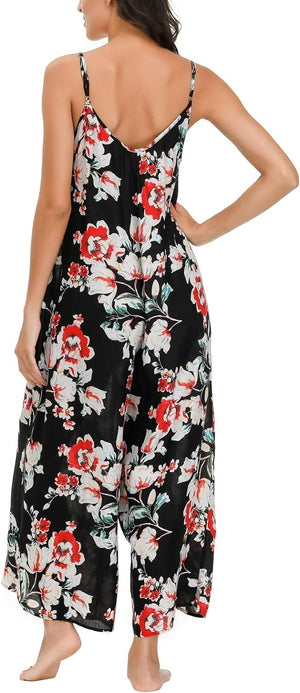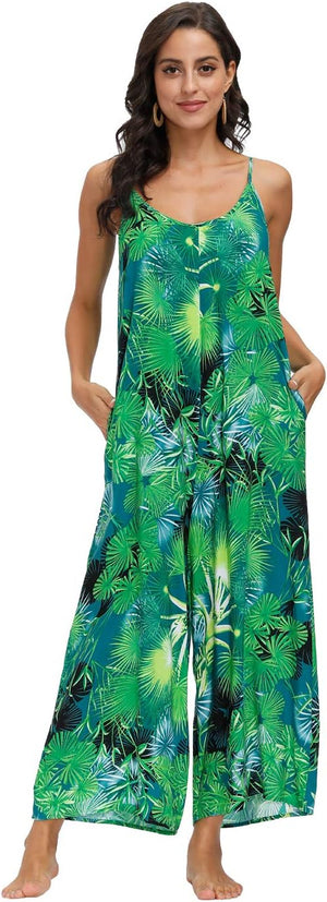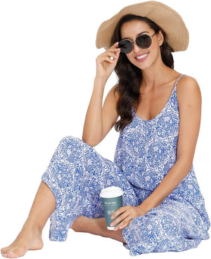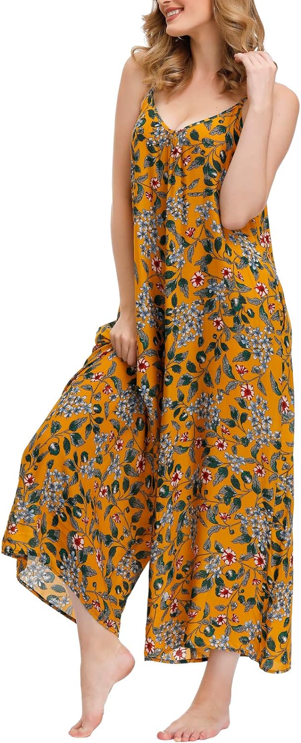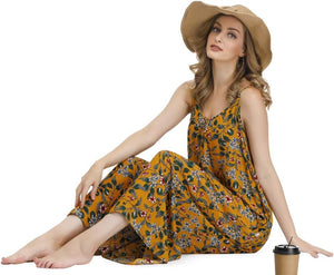 wexcen Jumpsuits for Women Floral Wide Leg Spaghetti Strap Sleeveless Casual Loose Ethnic Long Rompers with Pockets