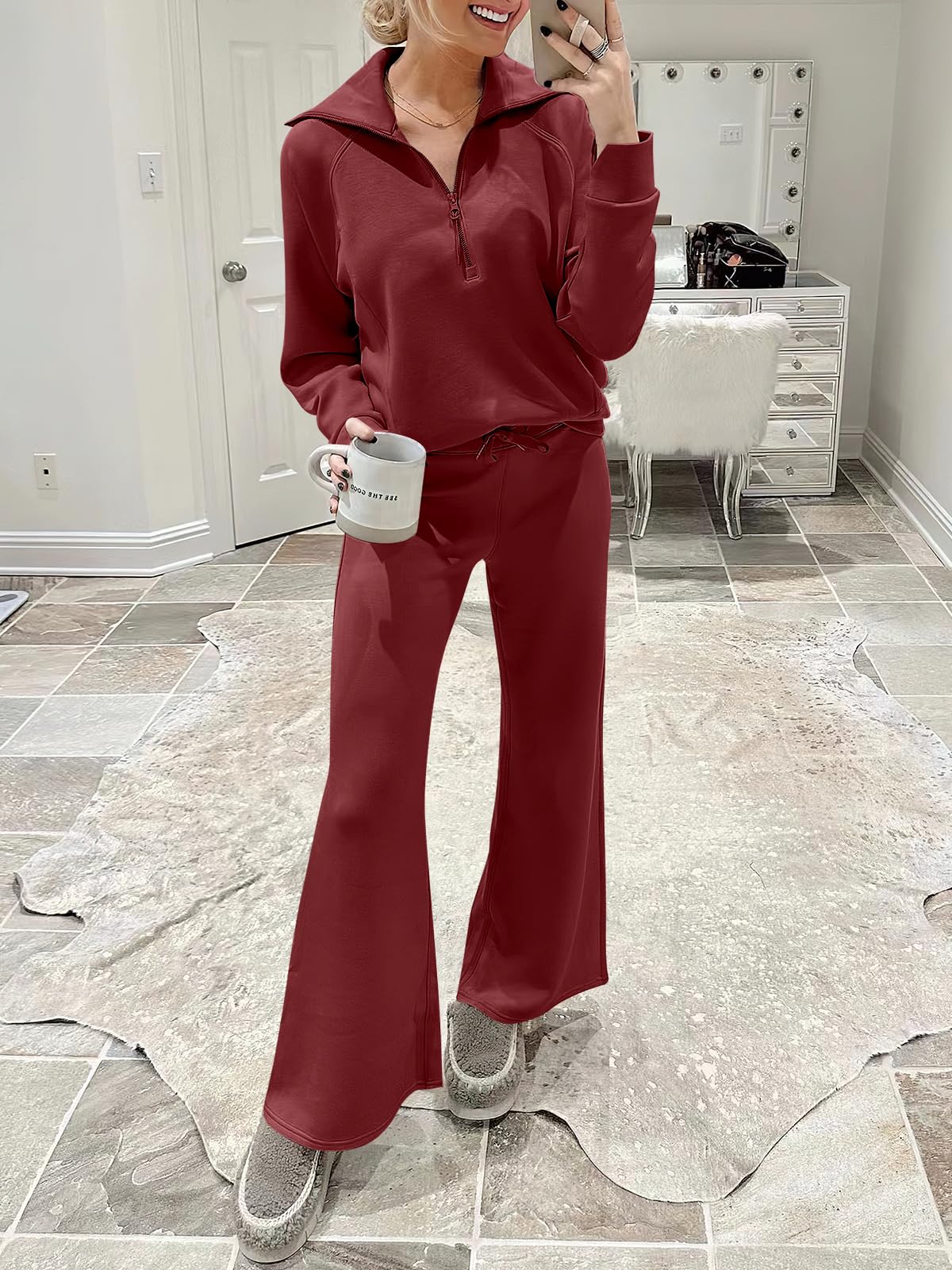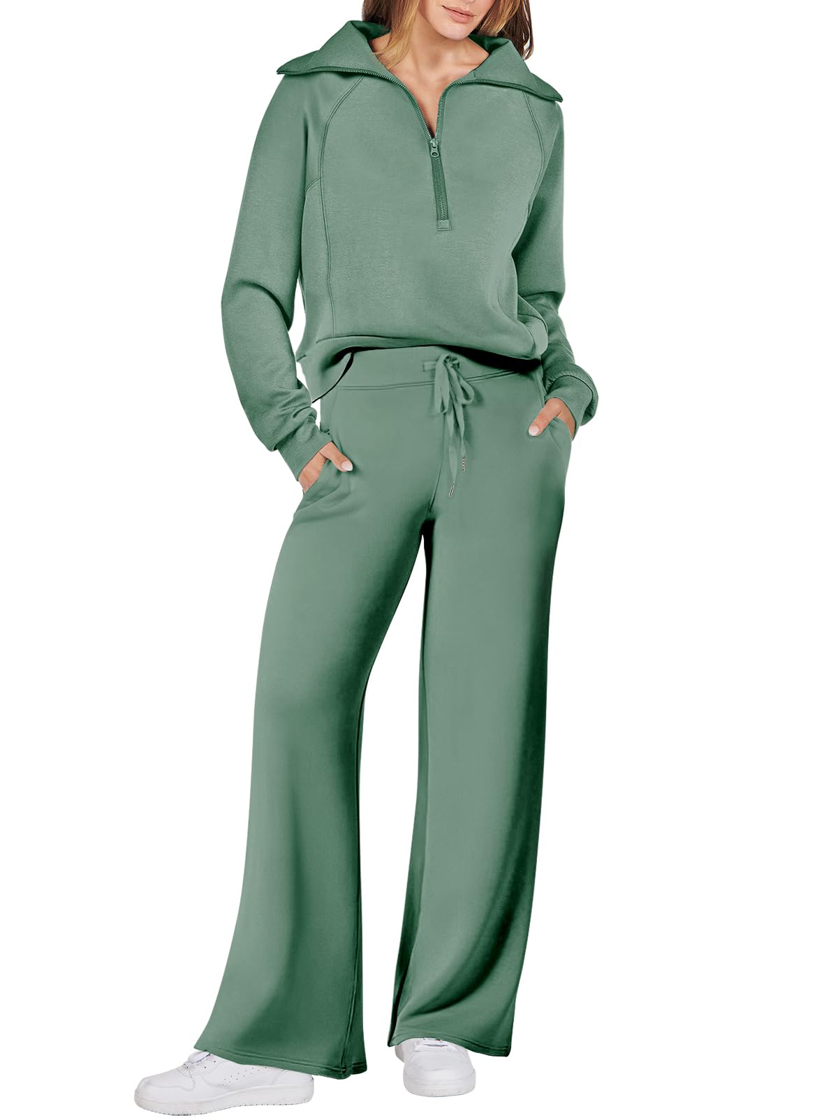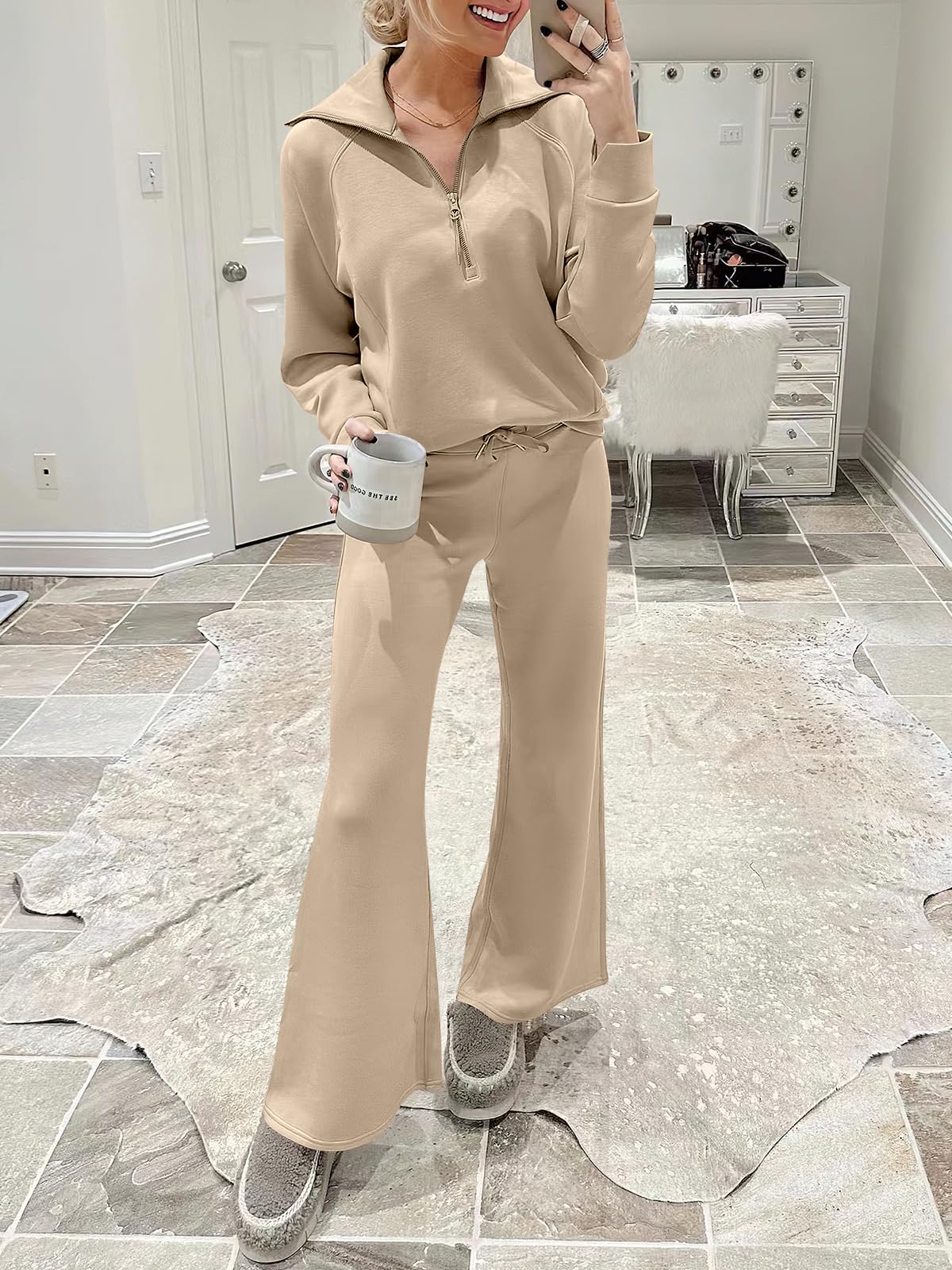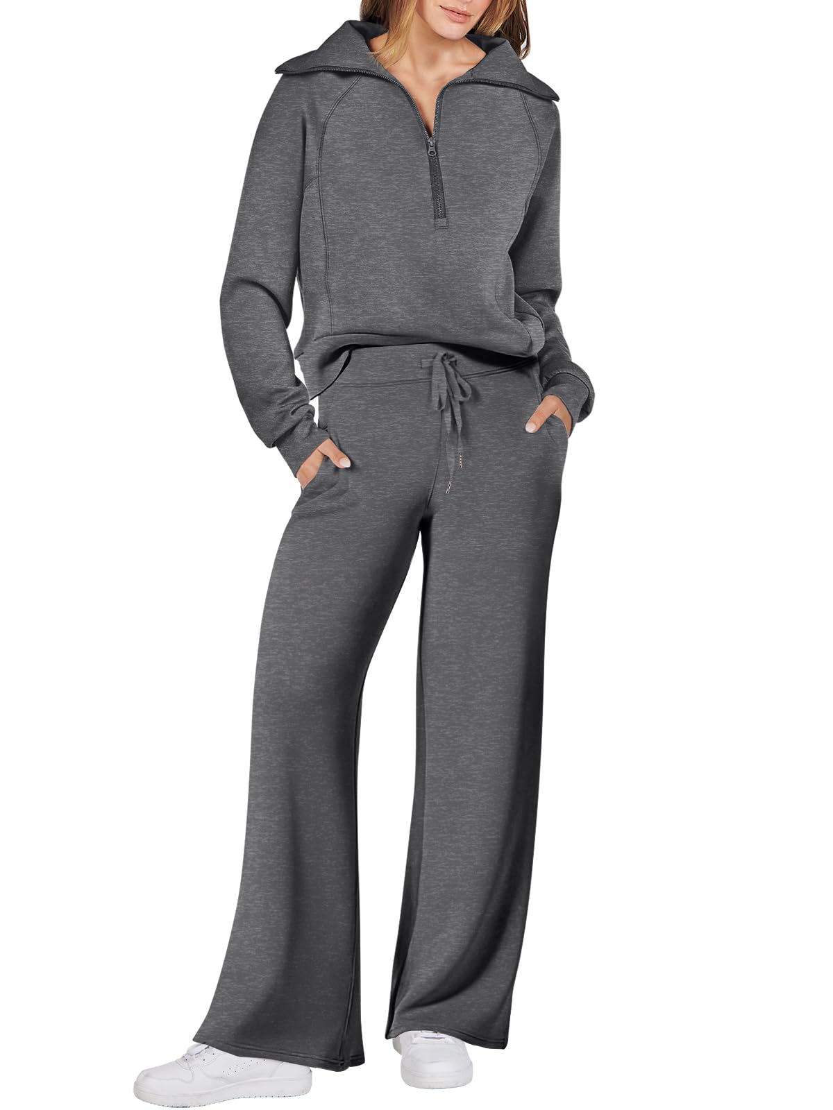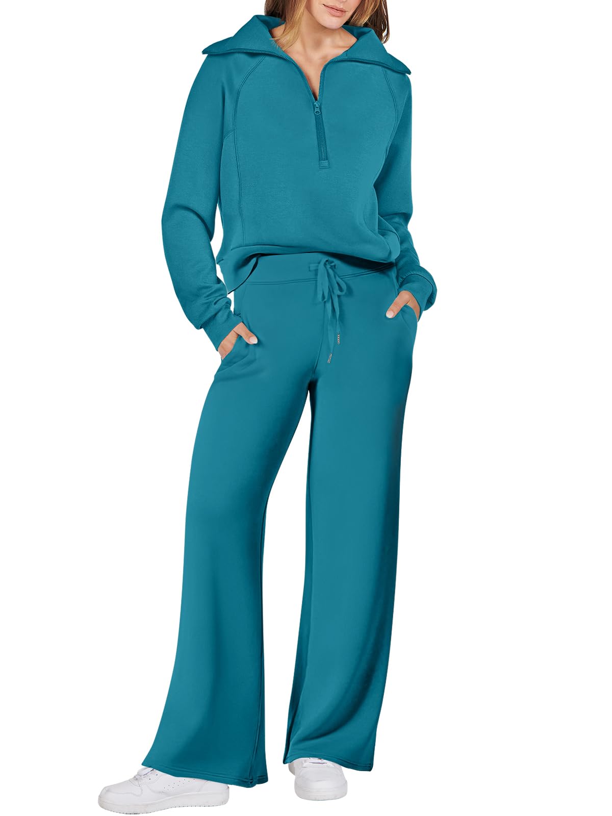 Features - This Sweatsuit Set featured Half zip long sleeve oversized sweatshirt & high waist drawstring wide leg sweatpant for a 2 piece tracksuit set.