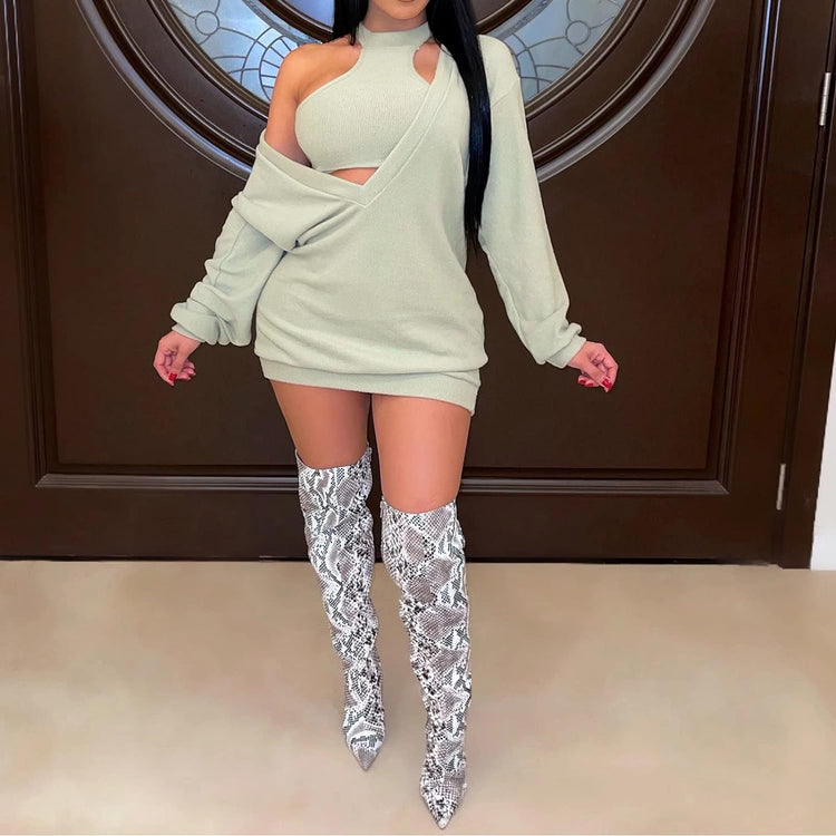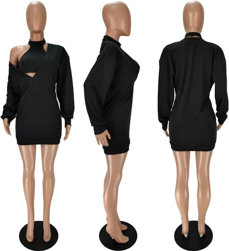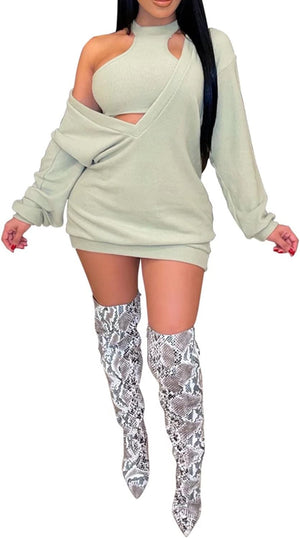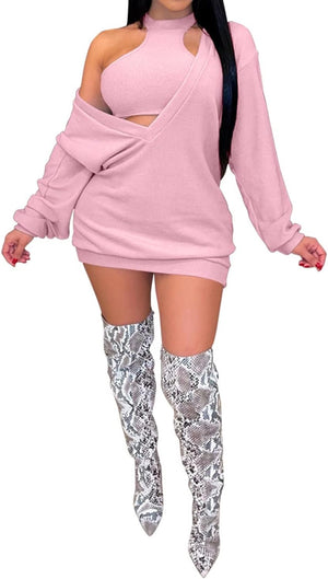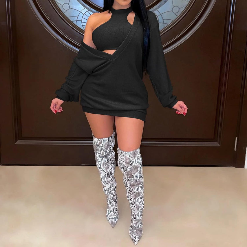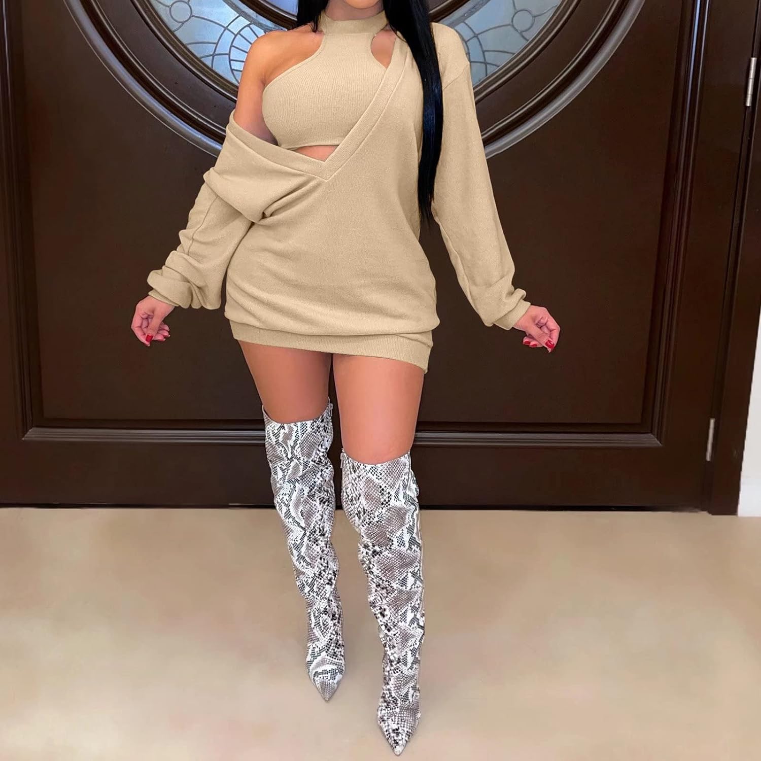 Sexy 2 Piece Dress Outfits Long Sleeve One Shoulder Sweater Bodycon Dress & Sleeveless Tank Tops Two Piece Sets Tracksuits Clubwear