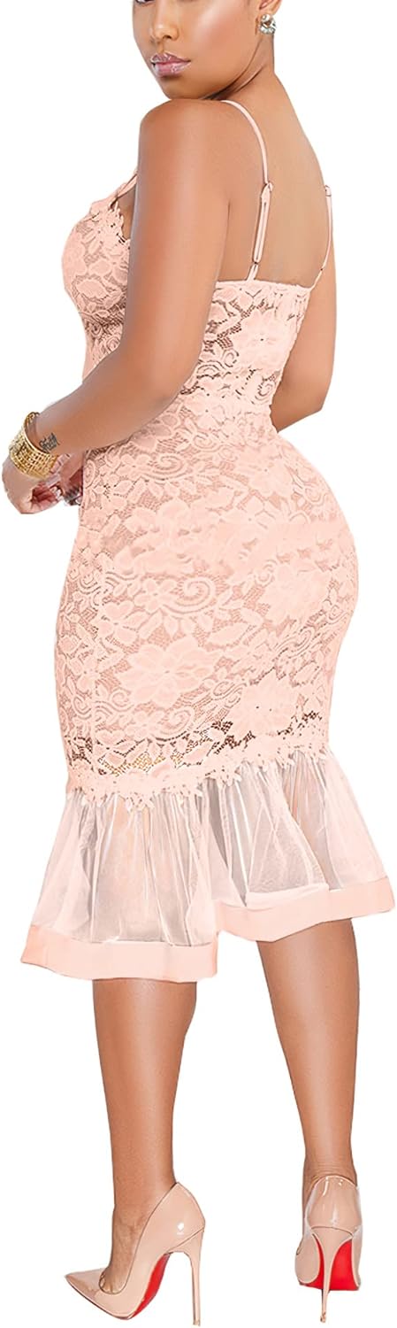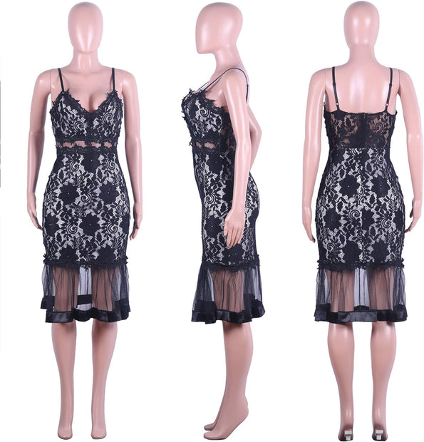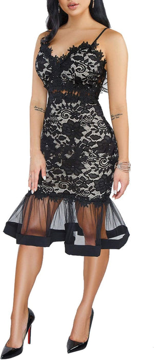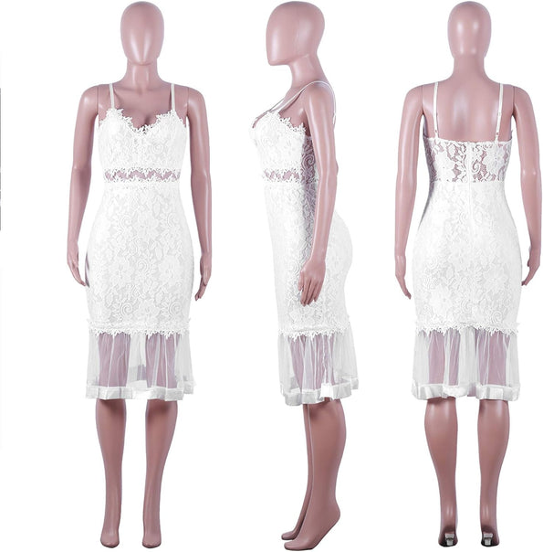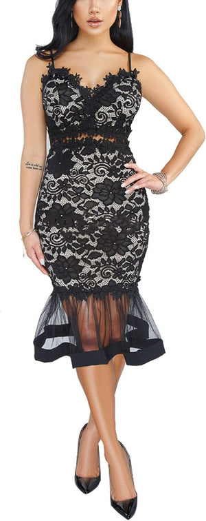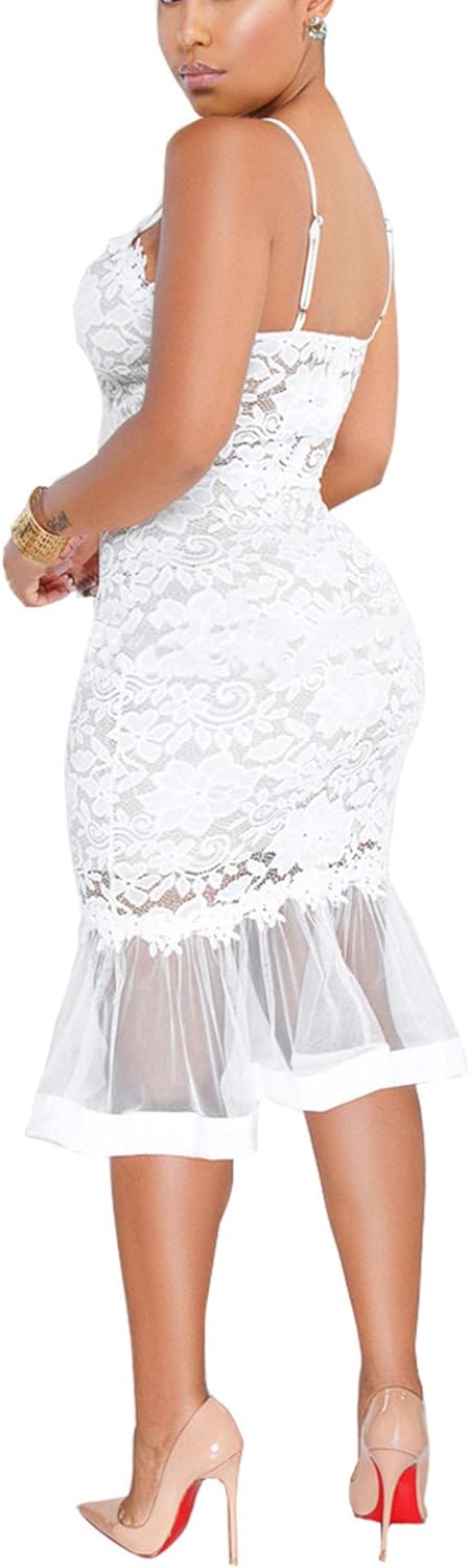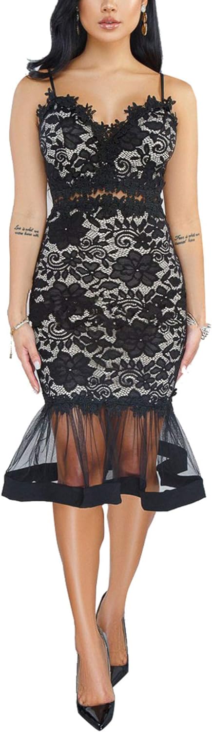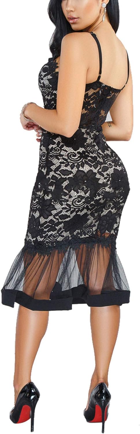 Womens Sexy Lace Dress V Neck Spaghetti Strap Hollow Out Bodycon Midi Skirt