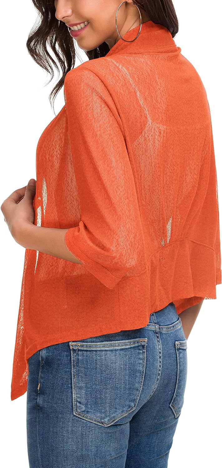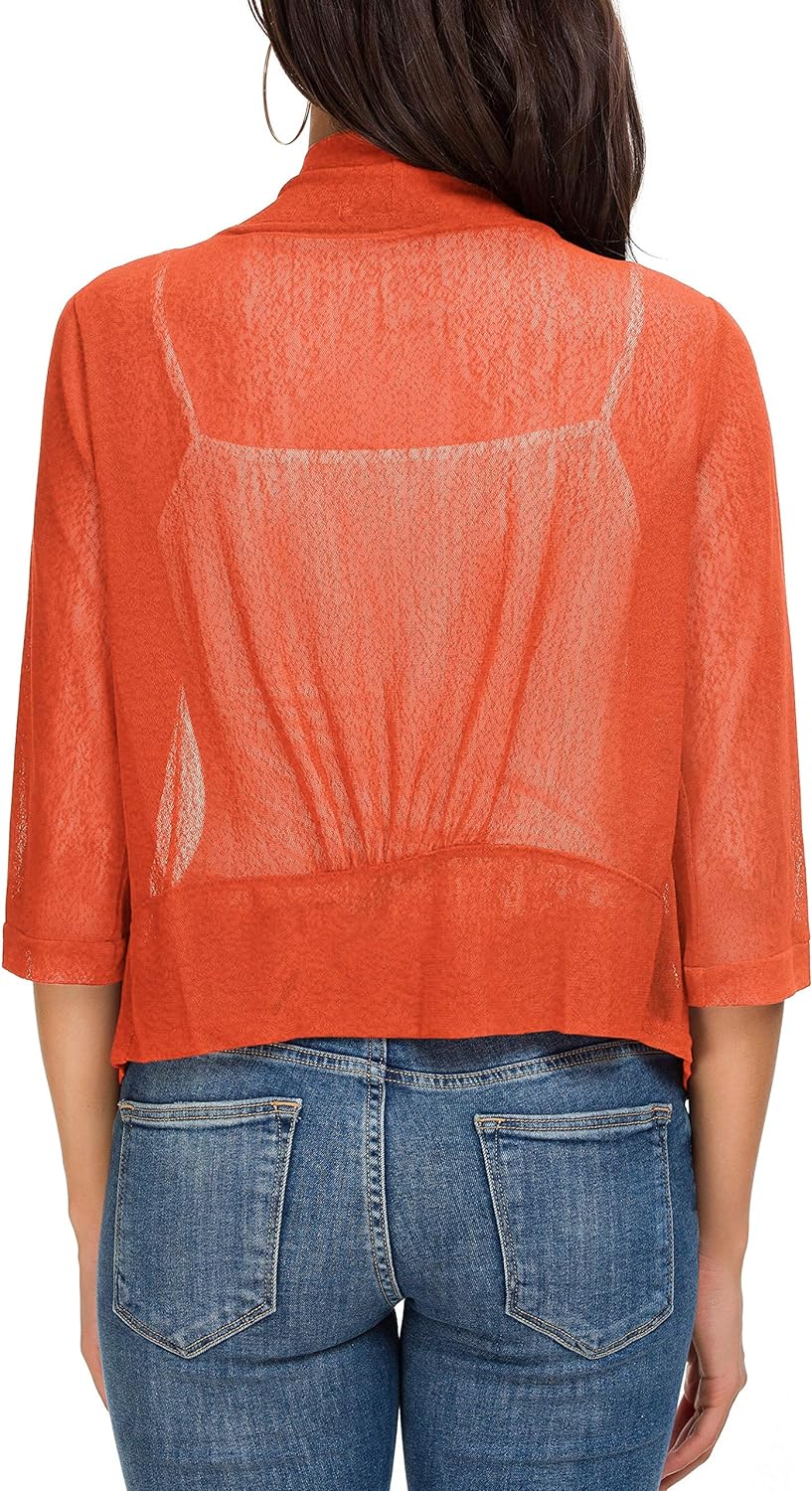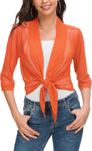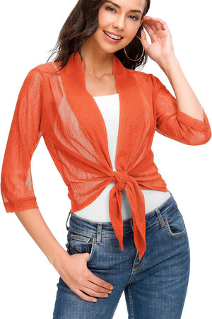 Women's Tie Front 3/4 Sleeve Shrug Sheer Wrap Cropped Bolero Top Thin Cardigan