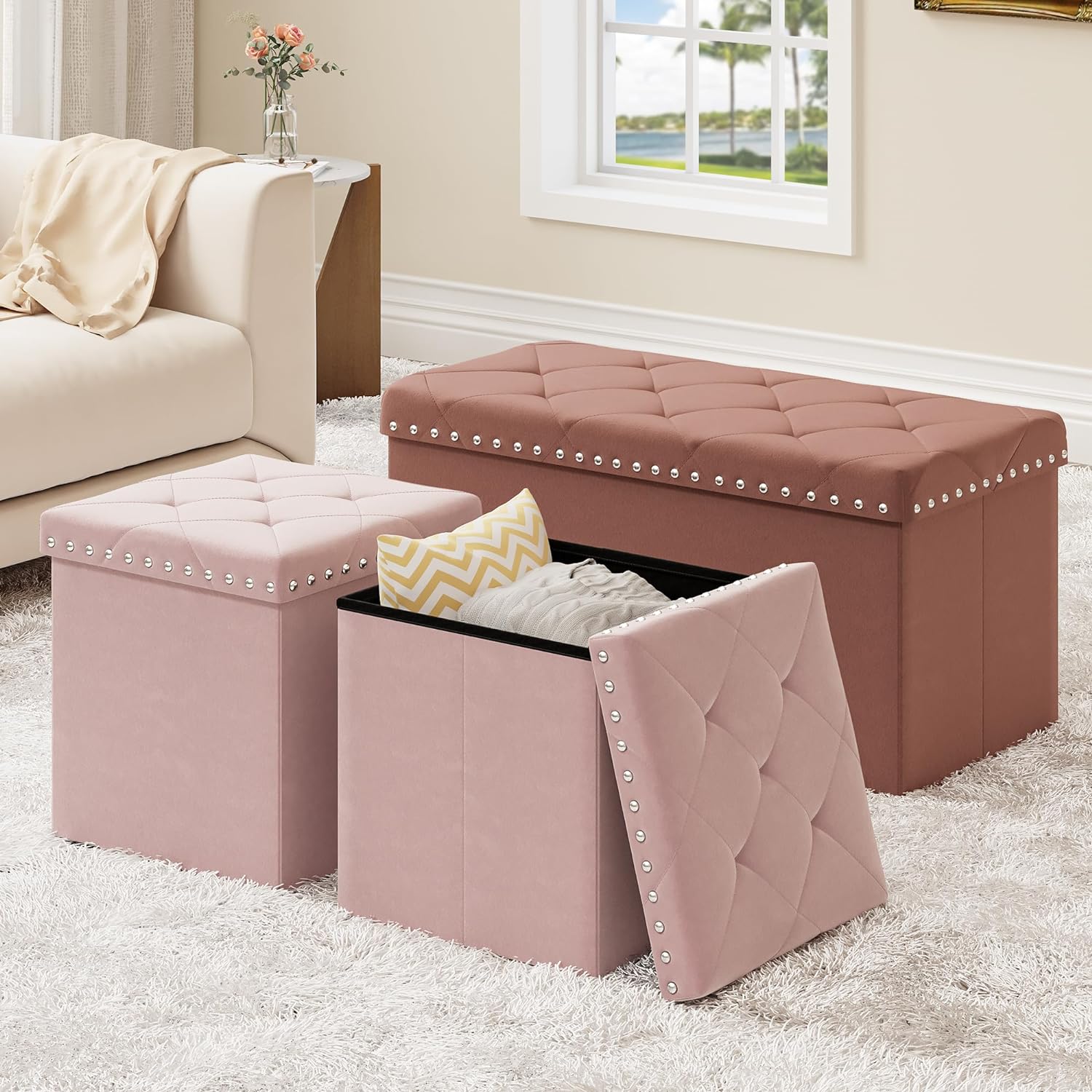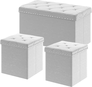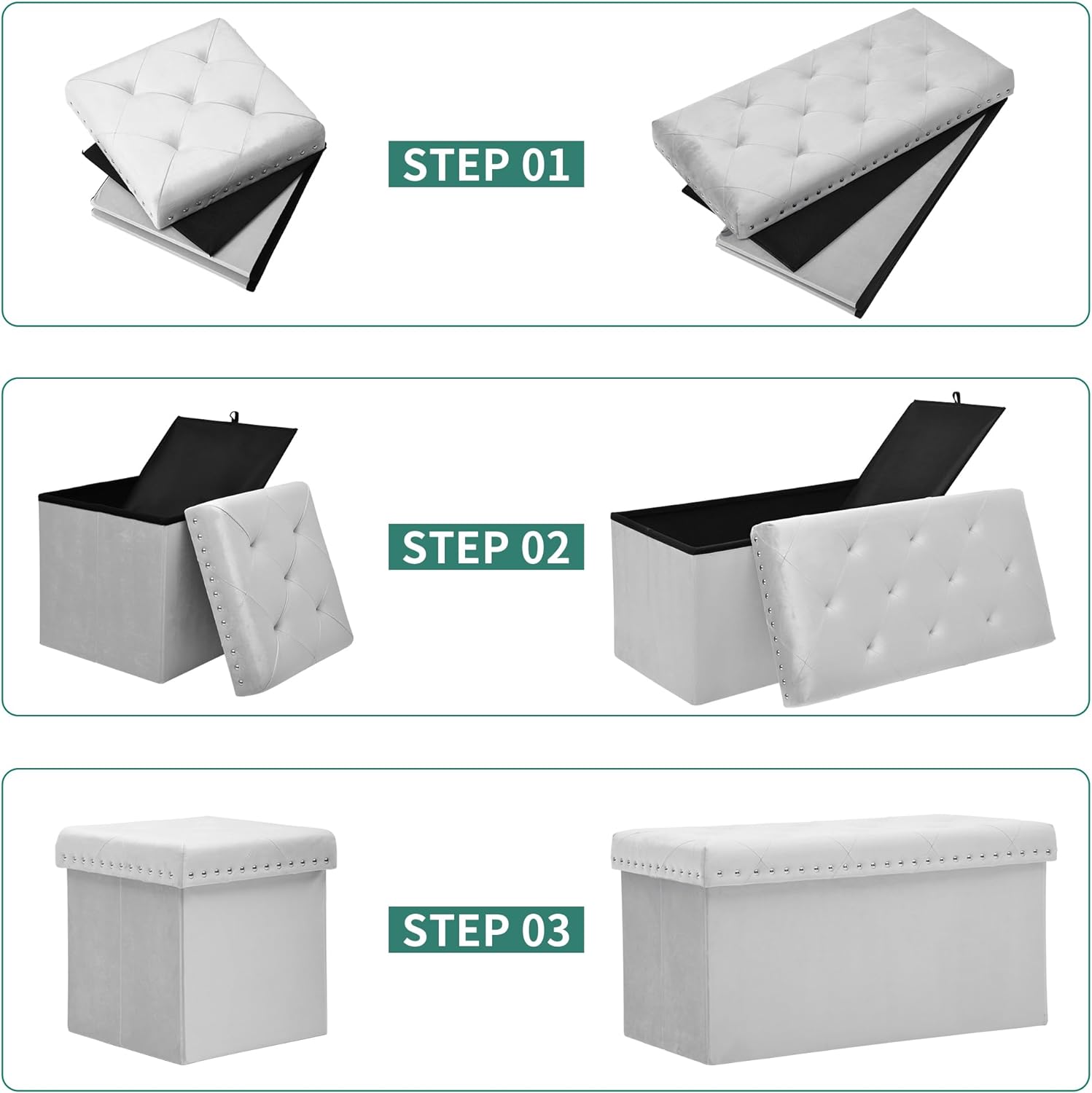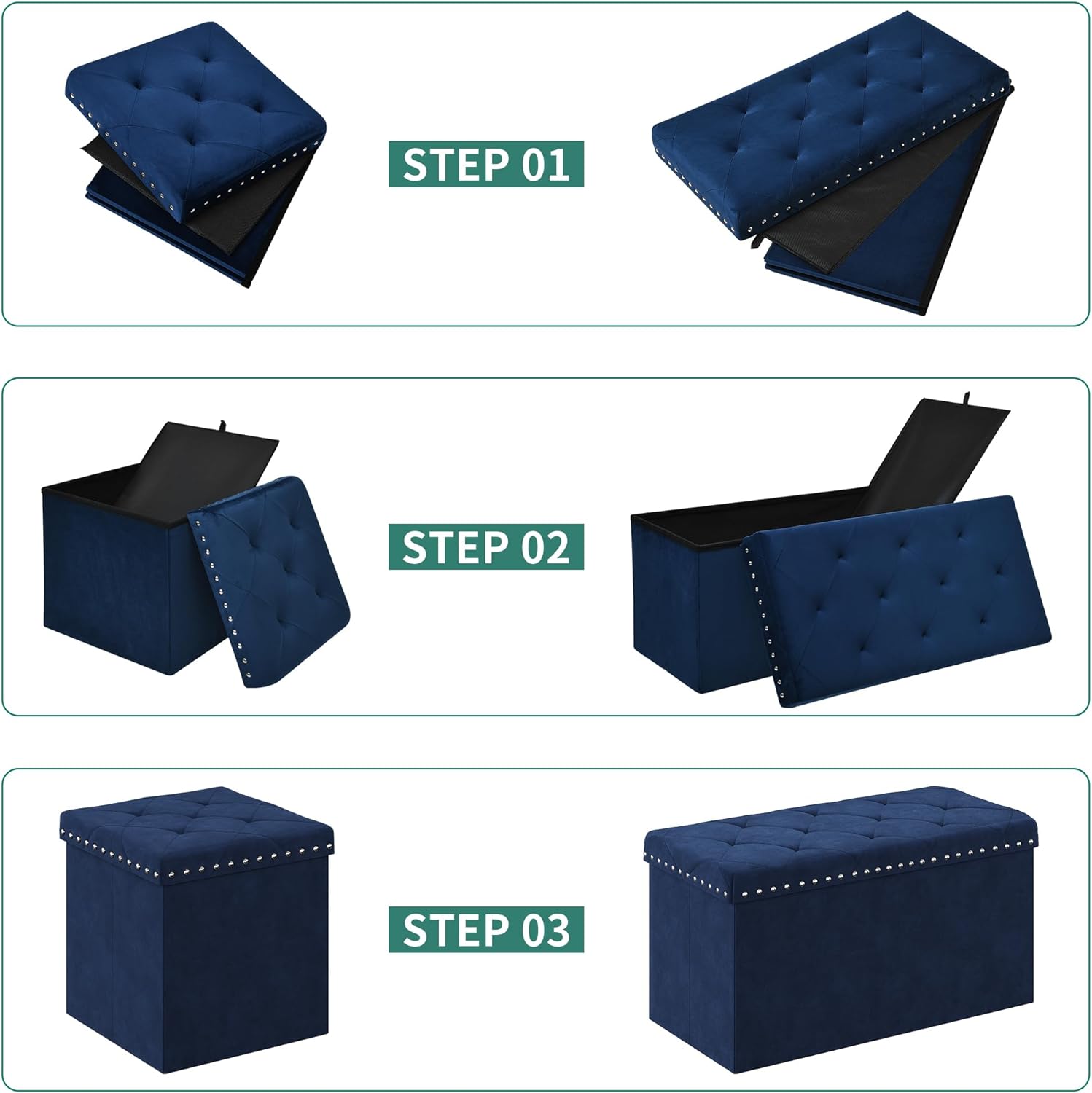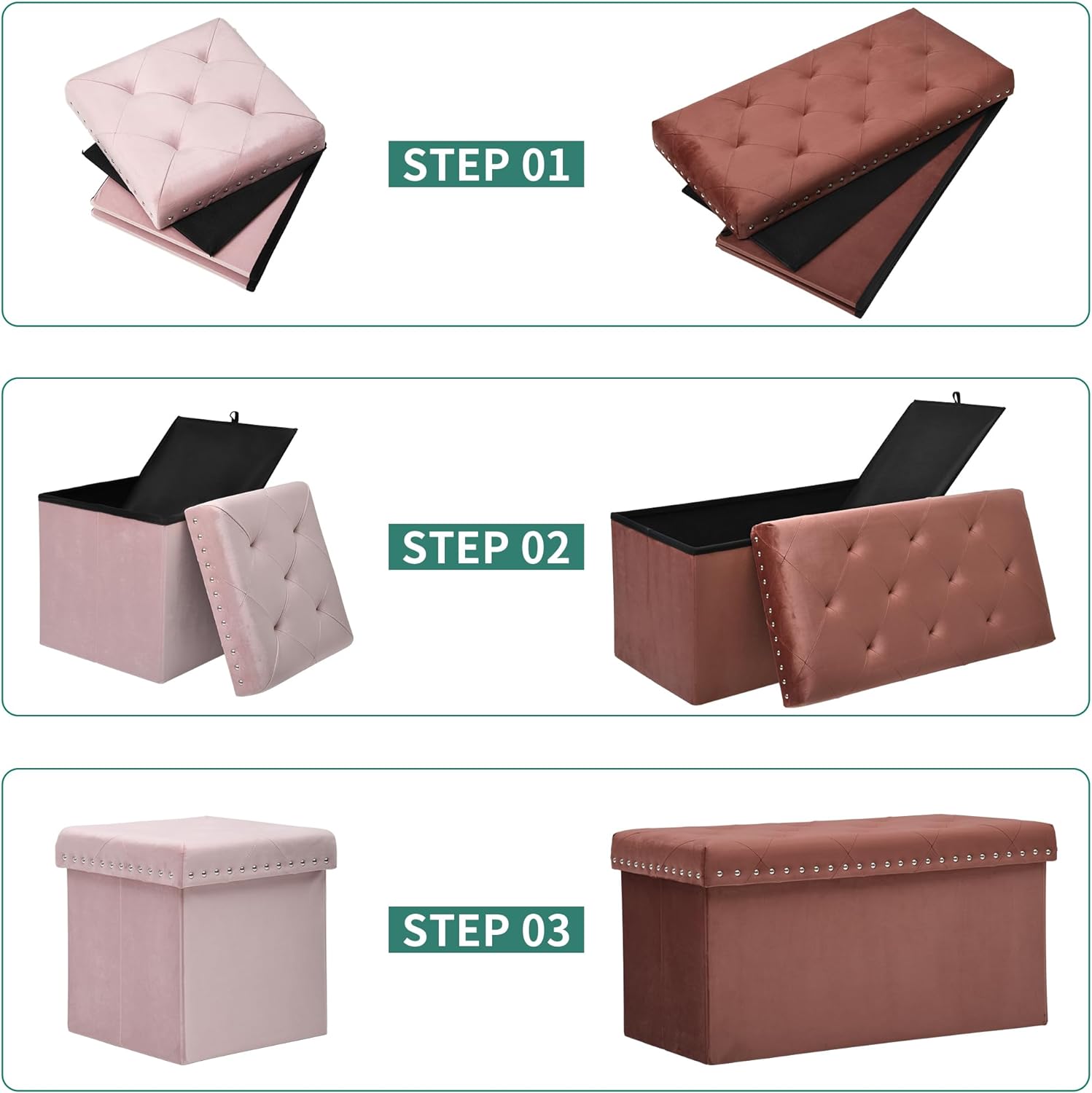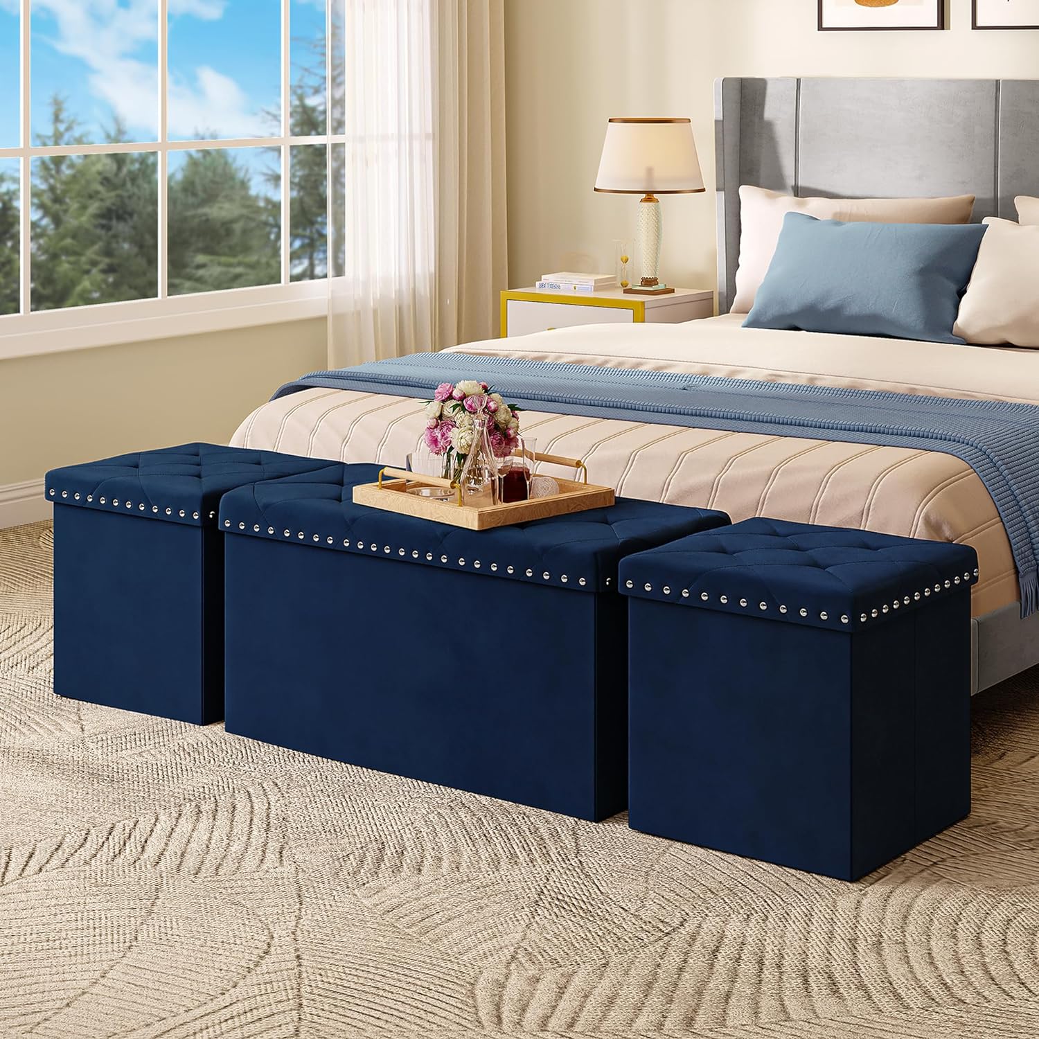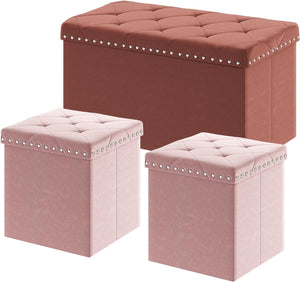 - 3PC VELVET STORAGE BENCH WITH OTTOMAN SETS: Each order comes with a velvet upholstered rectangular storage bench and 2 smaller storage ottomans with stylish rivet designs. This set of 3 storage bench with ottomans provides you with spacious storage and extra seat in your living room, bedroom, dining room or window side.