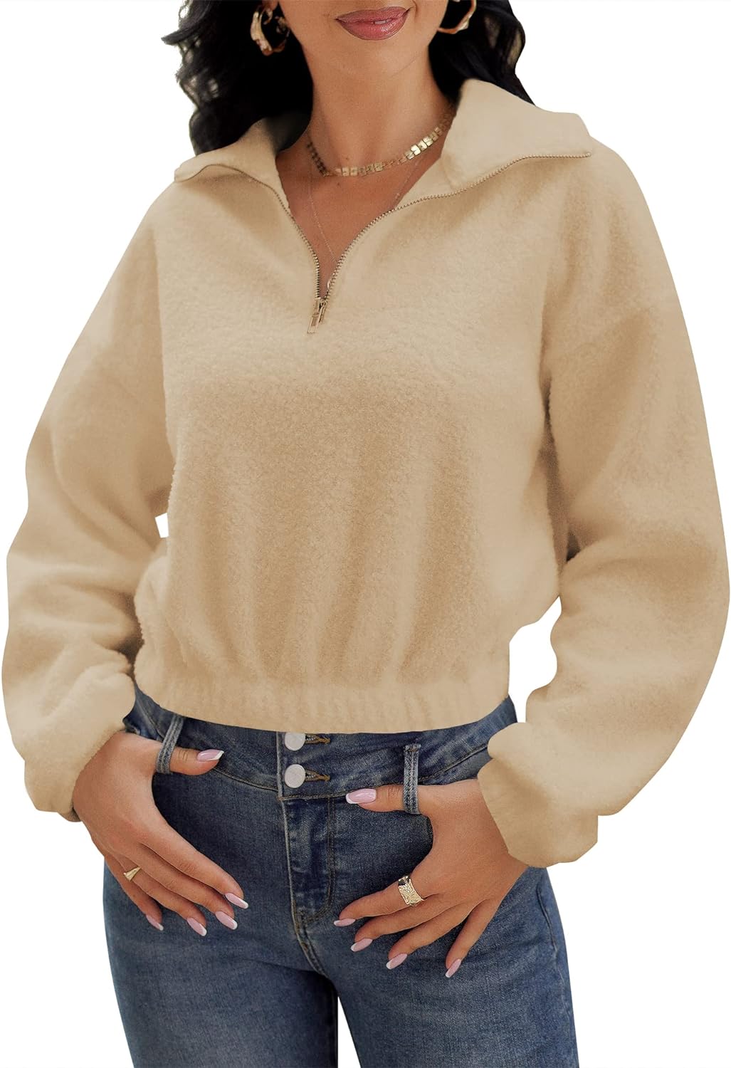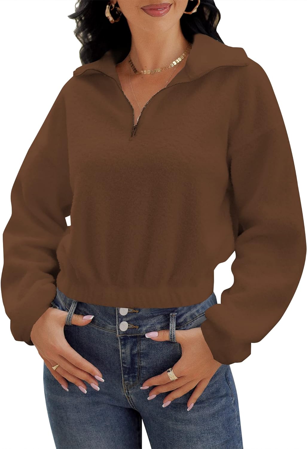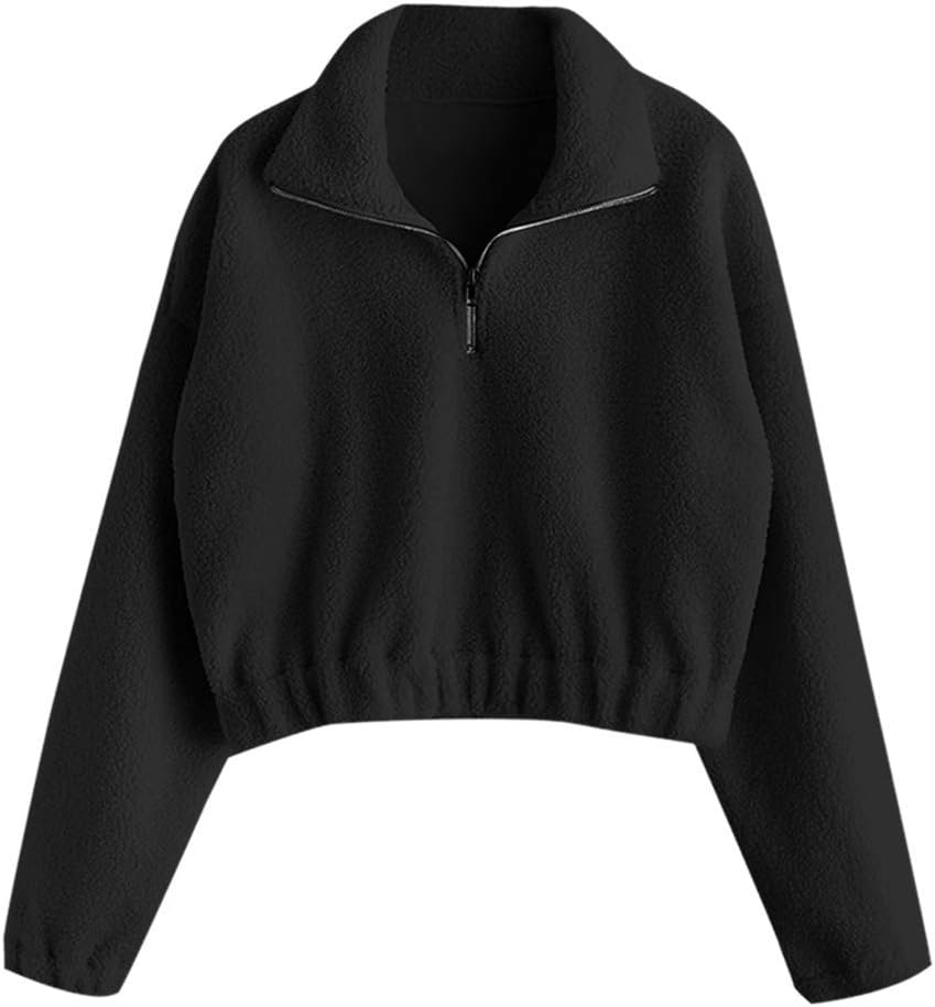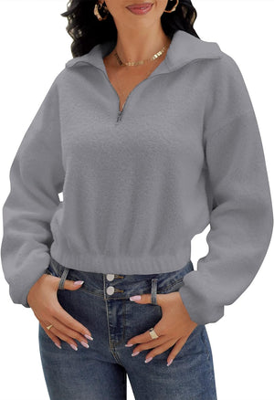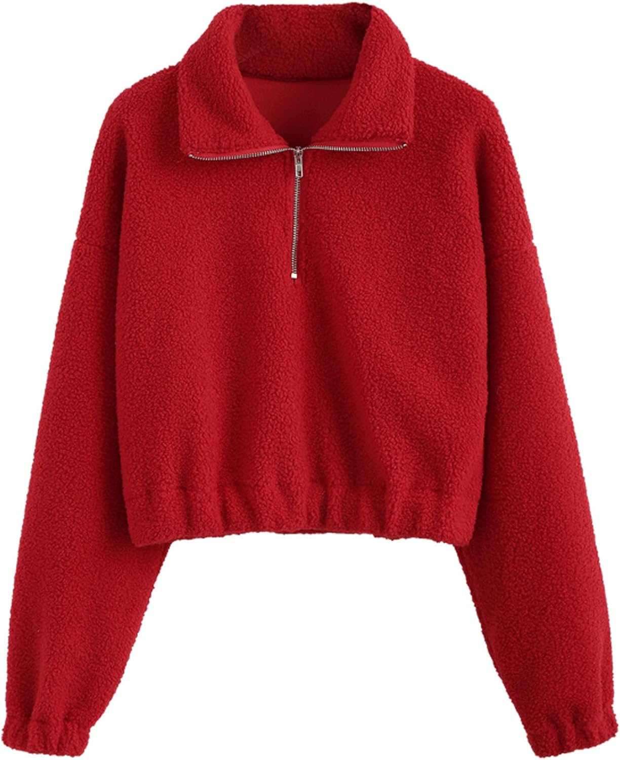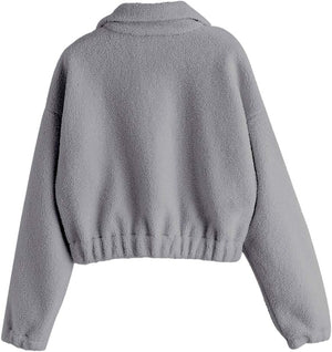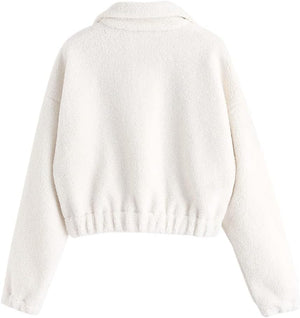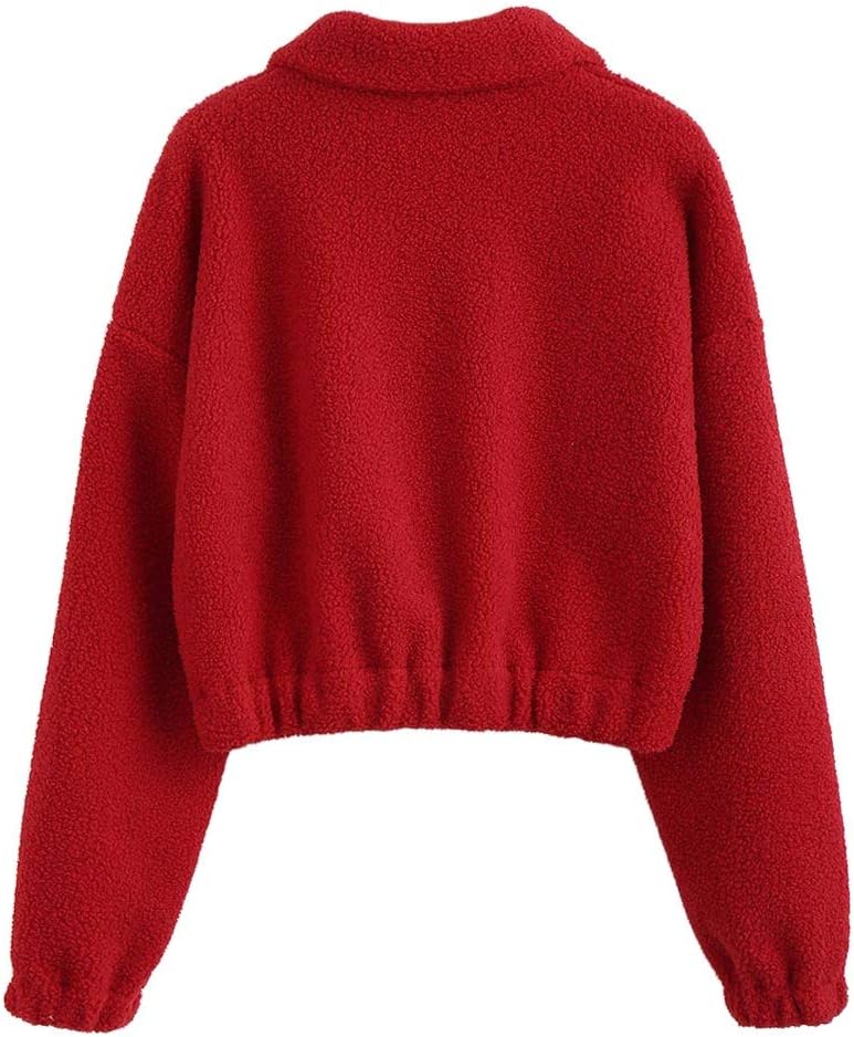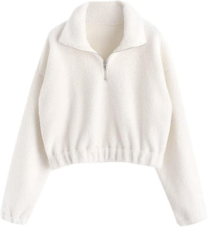 ZAFUL Women's Fashion Long Sleeve Lapel Half Zip Plain Faux Fur Sweatshirt Solid Color Crop Pullover Tops