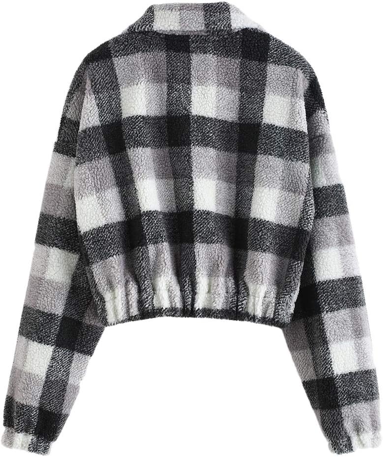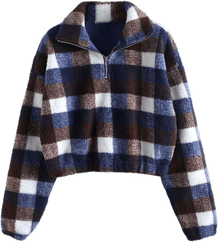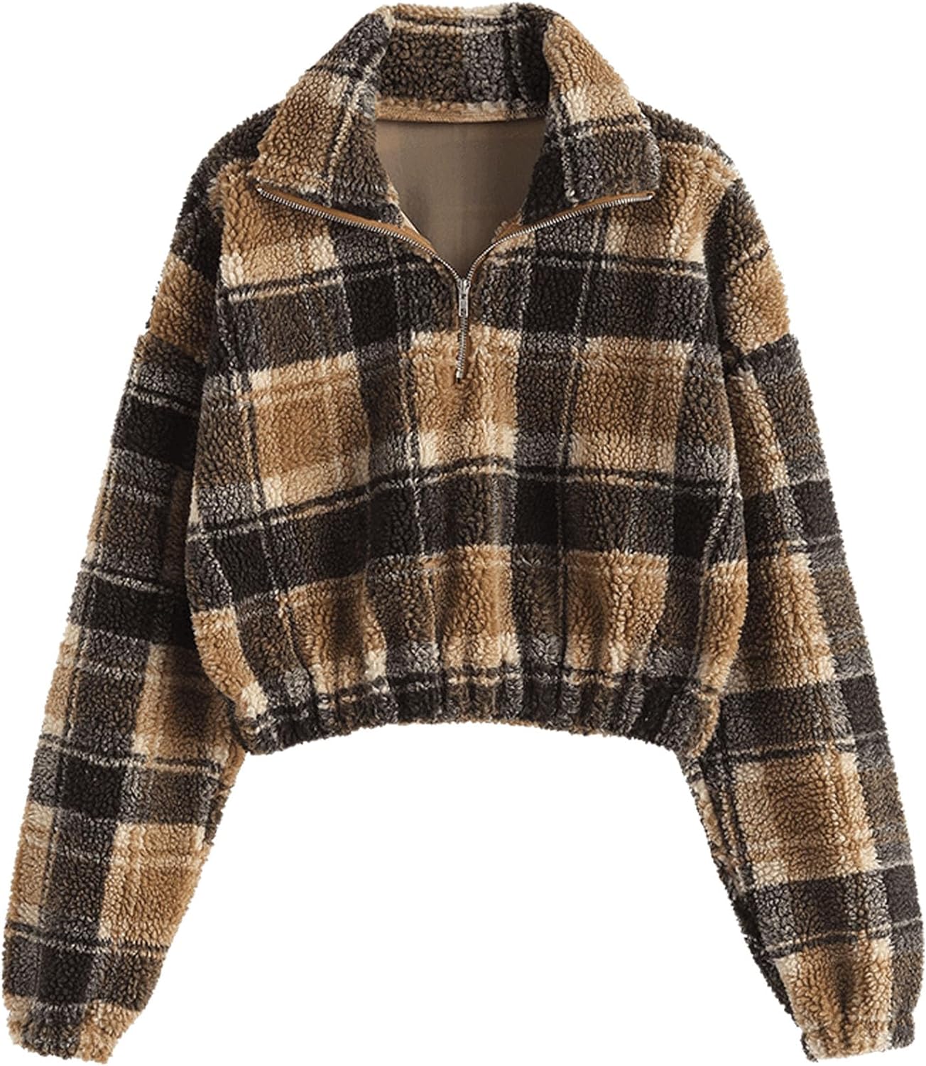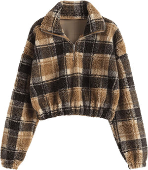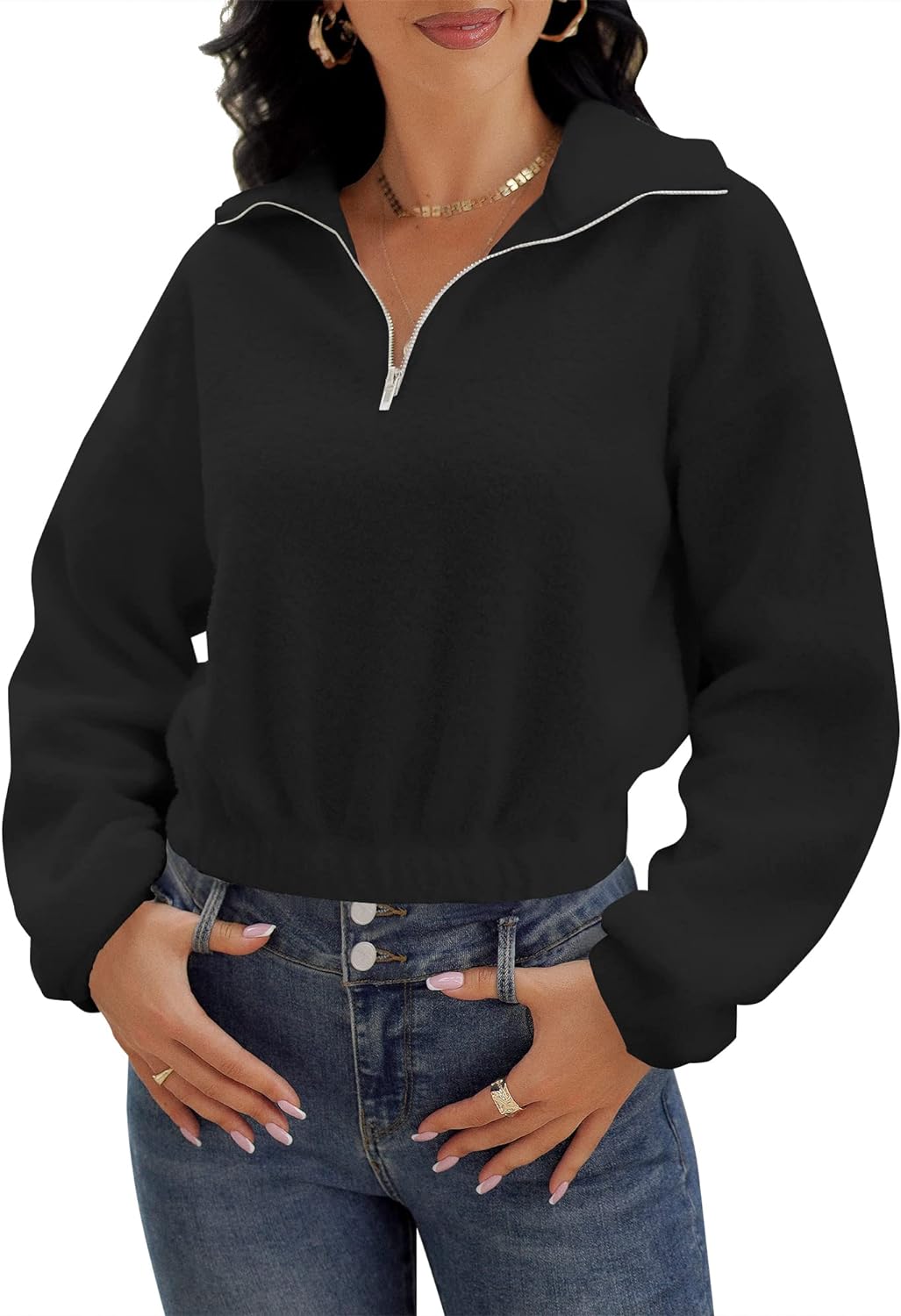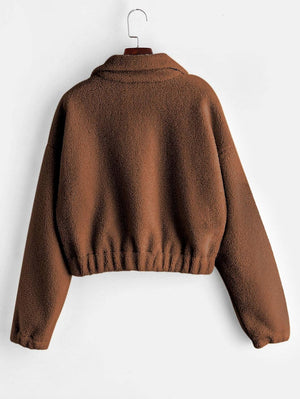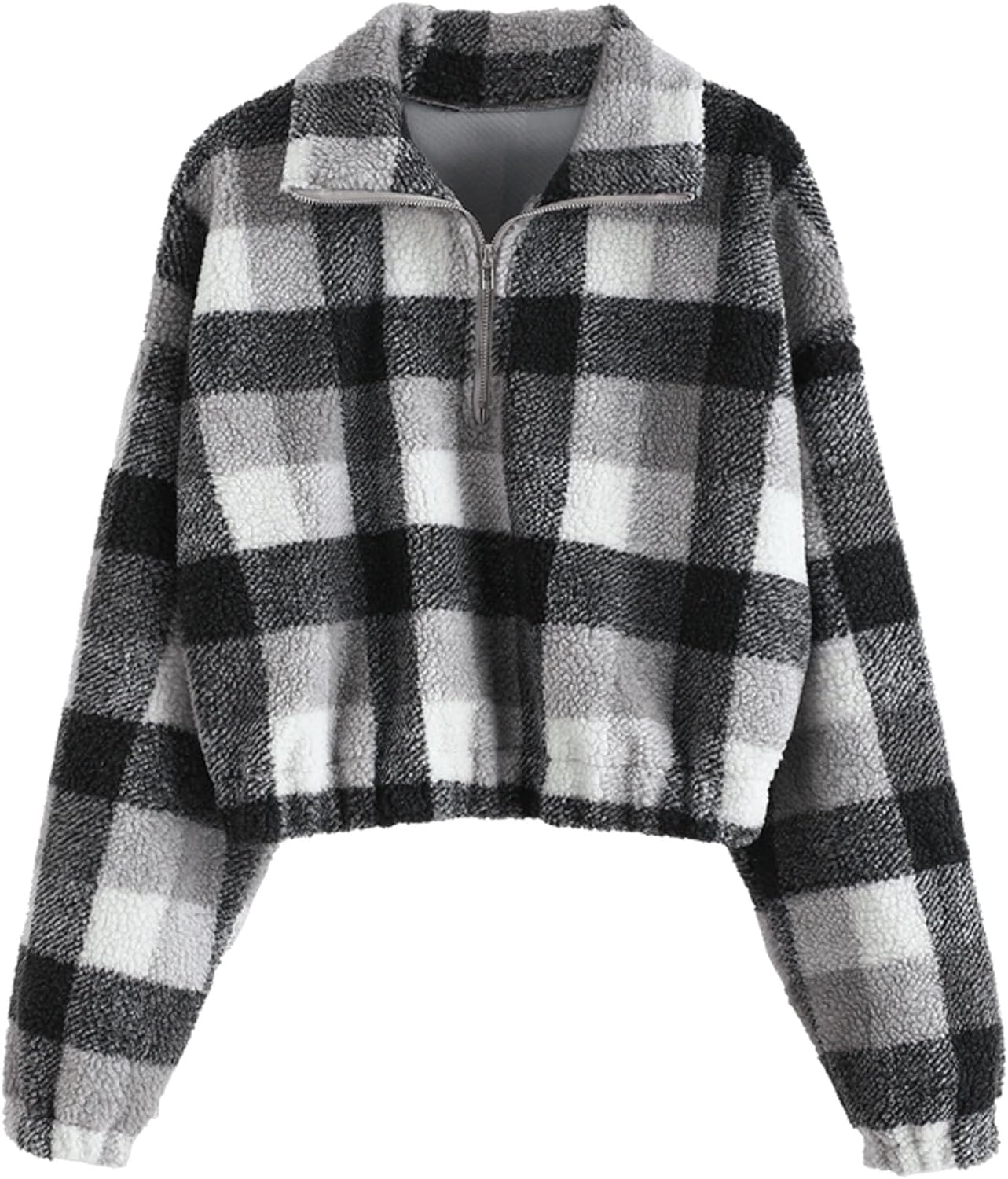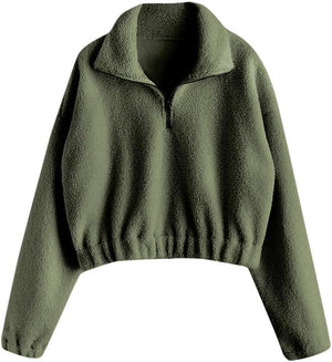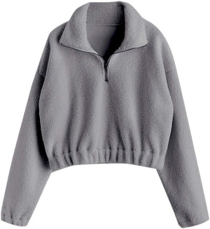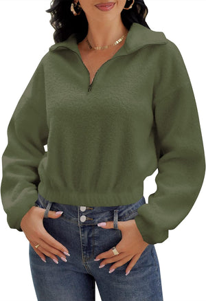 ZAFUL Women's Fashion Long Sleeve Lapel Half Zip Plain Faux Fur Sweatshirt Solid Color Crop Pullover Tops