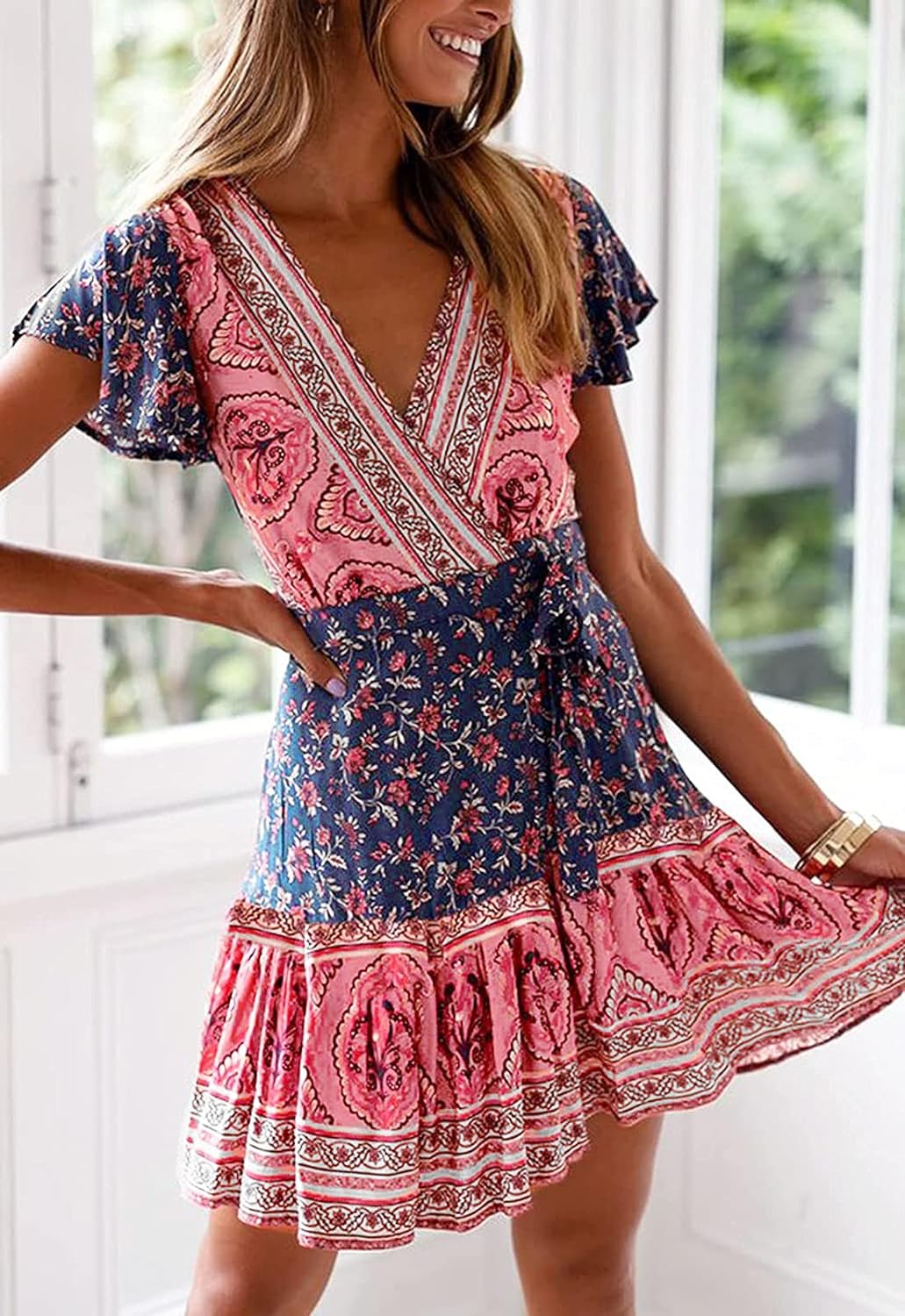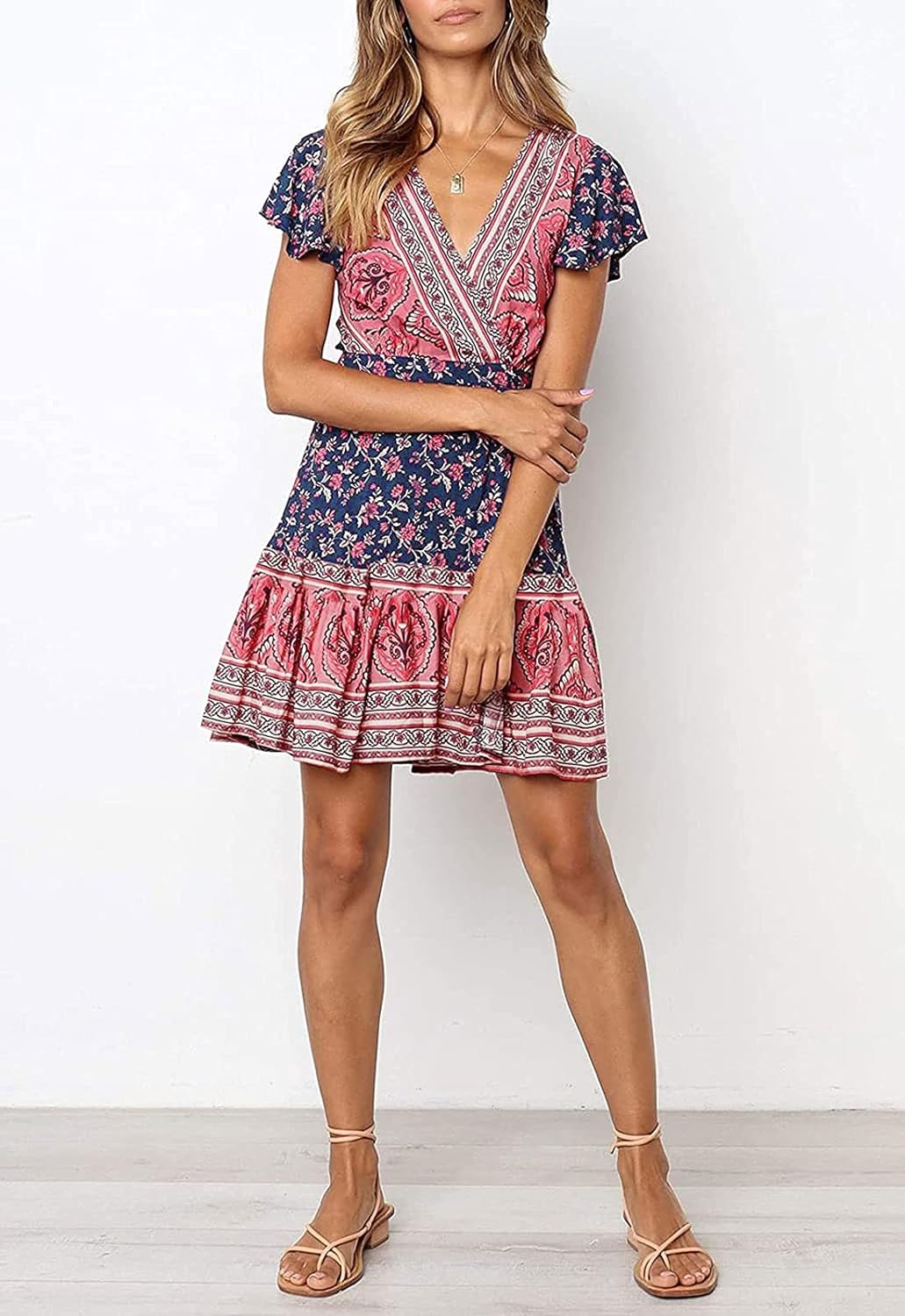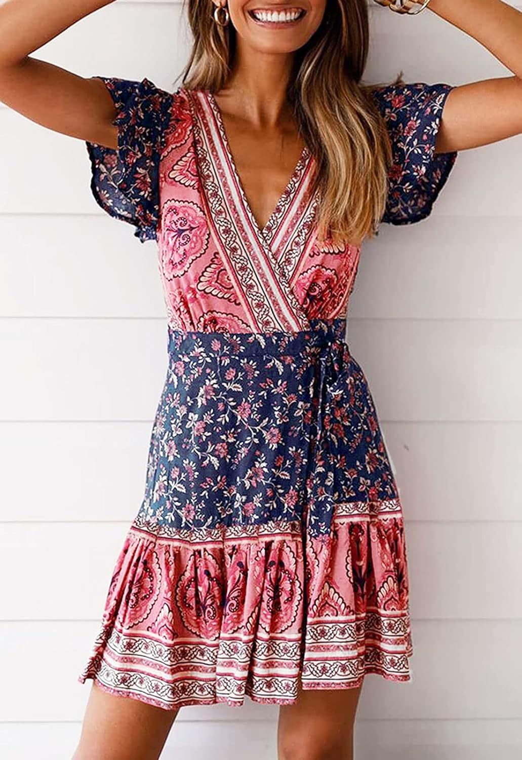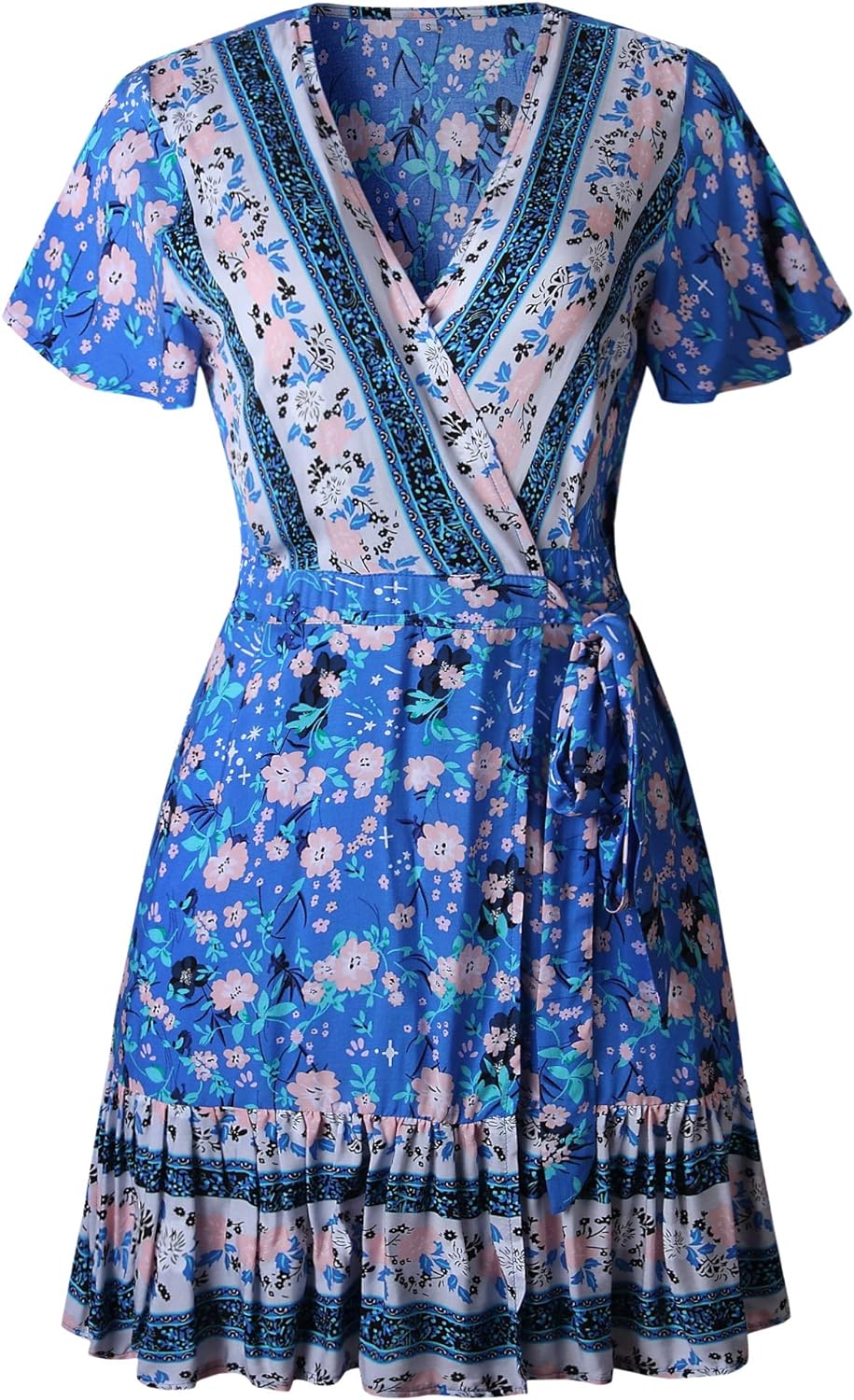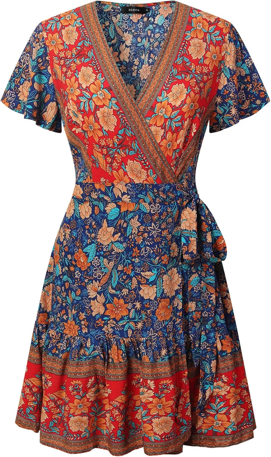 ZESICA Women’s Summer Wrap V Neck Bohemian Floral Print Ruffle Swing A Line Beach Mini Dress
