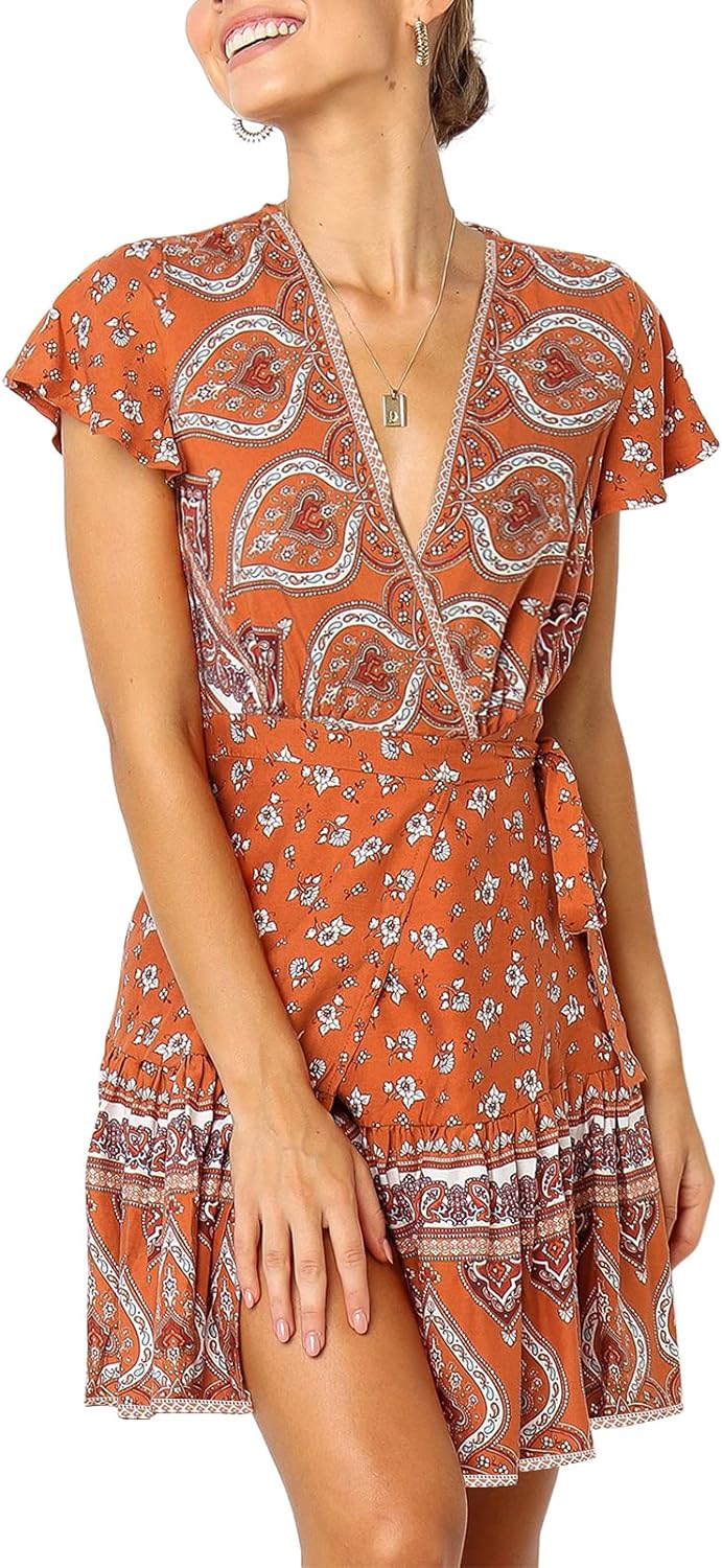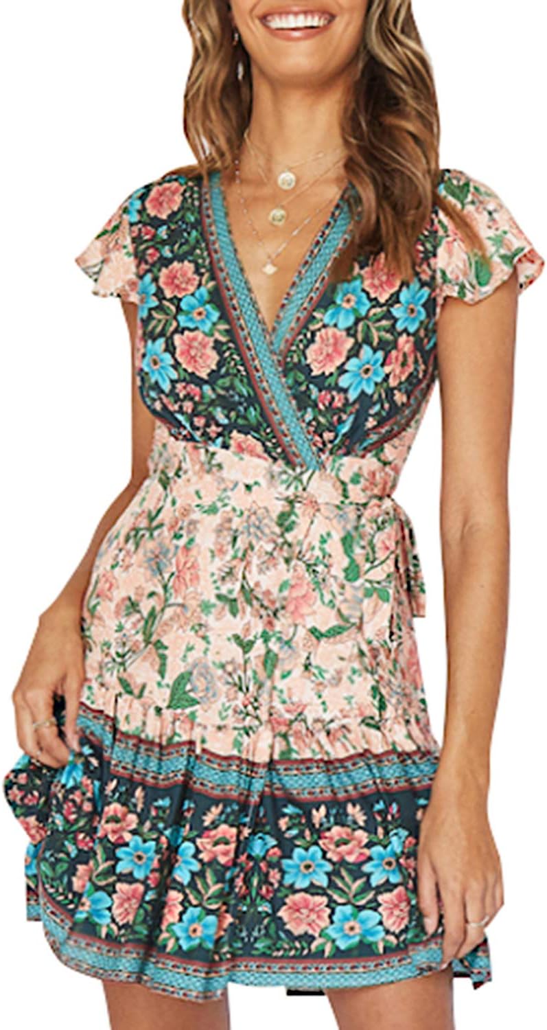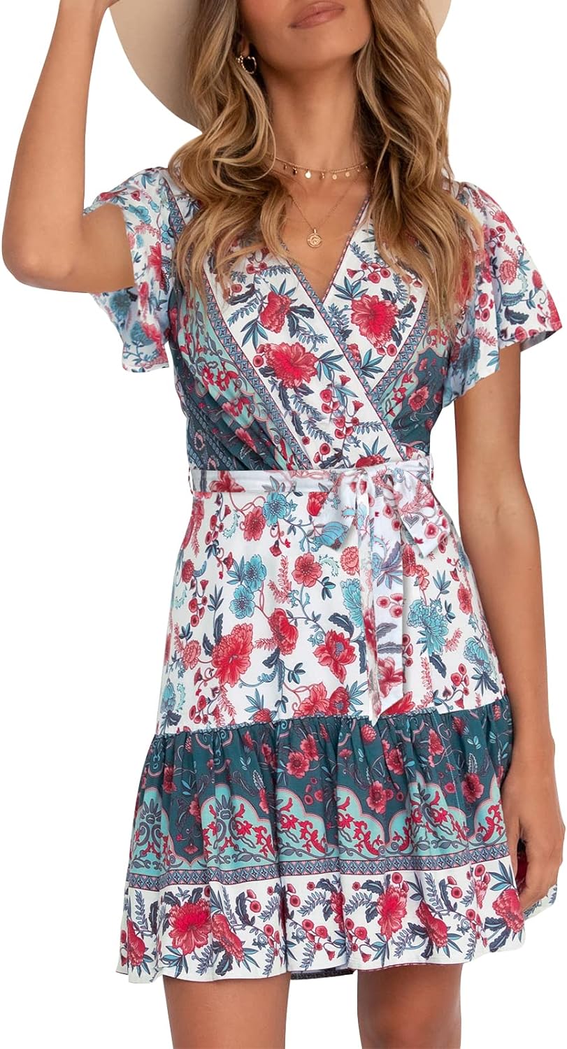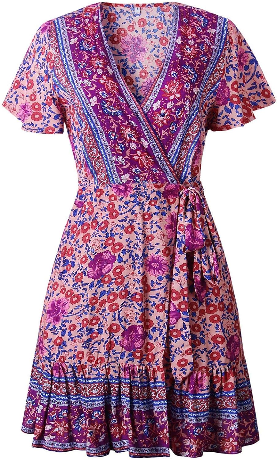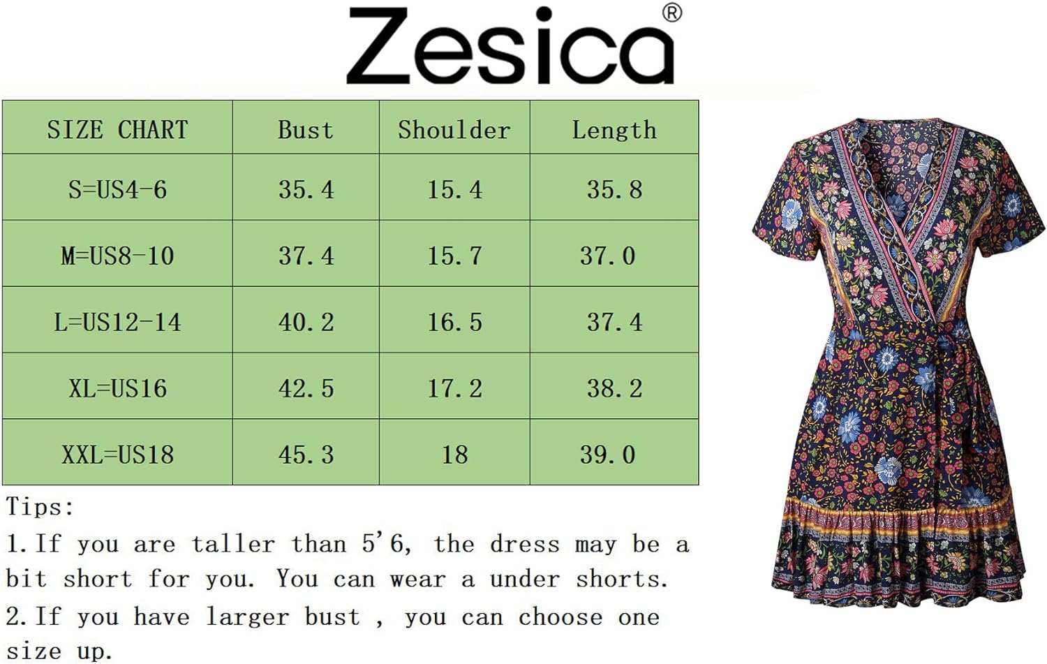 ZESICA Women’s Summer Wrap V Neck Bohemian Floral Print Ruffle Swing A Line Beach Mini Dress