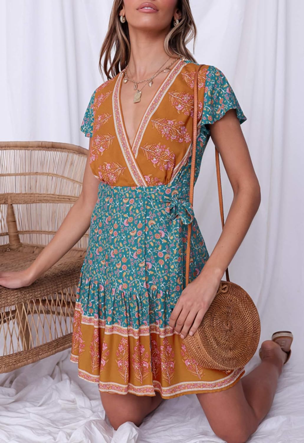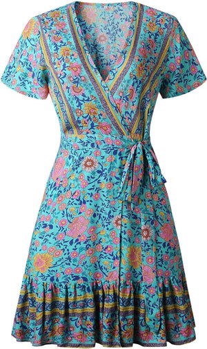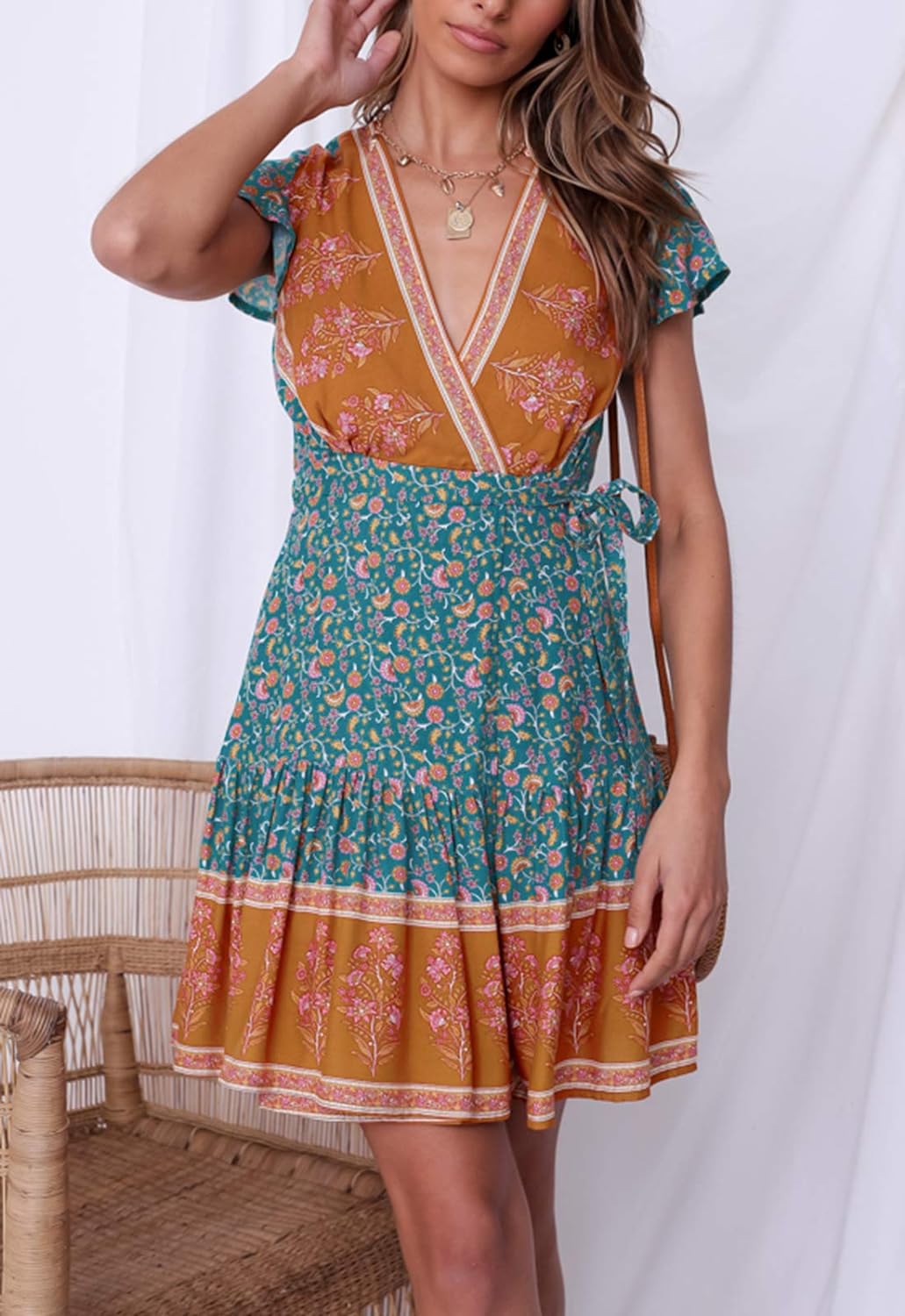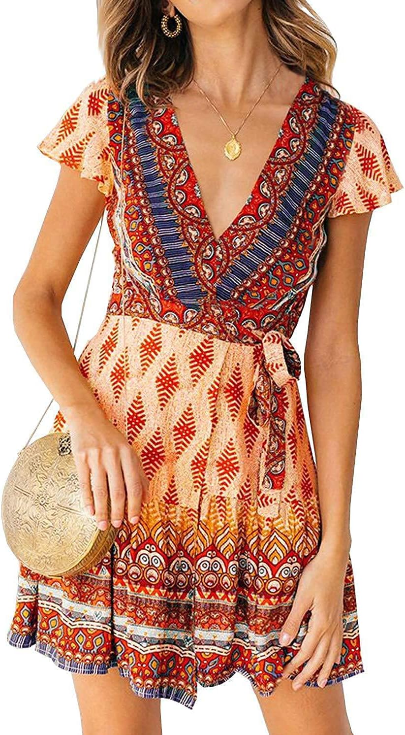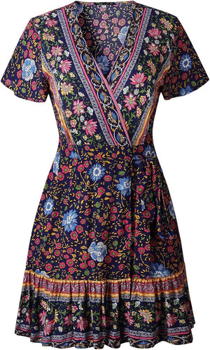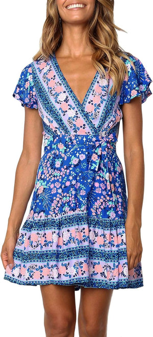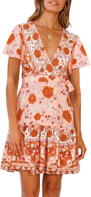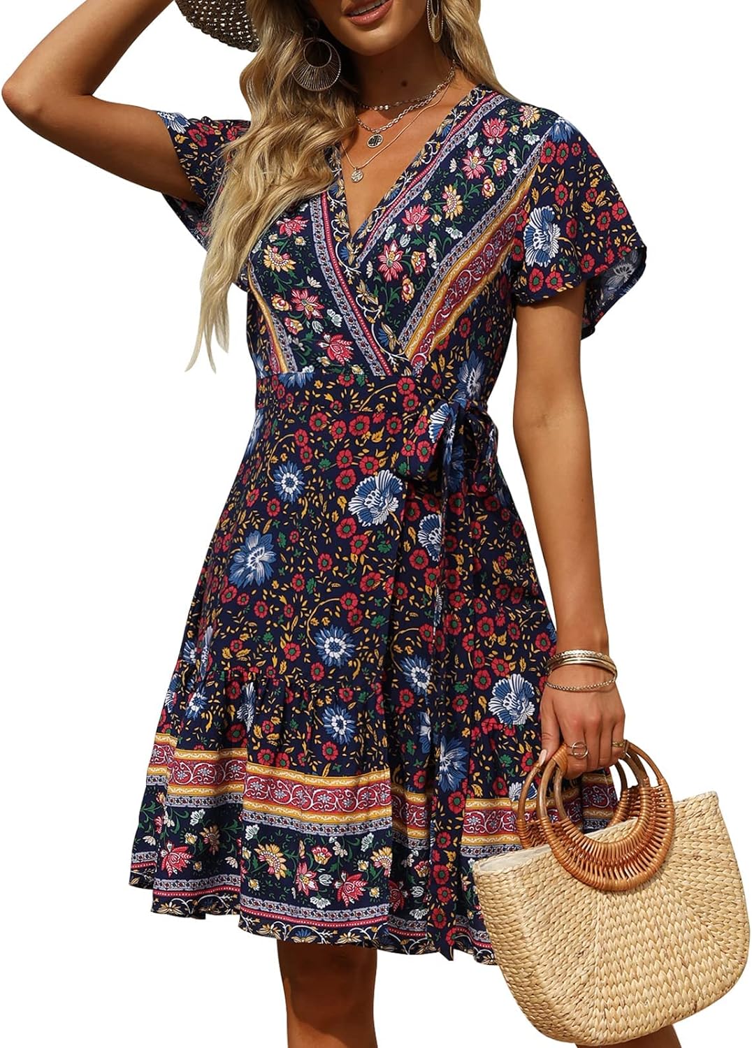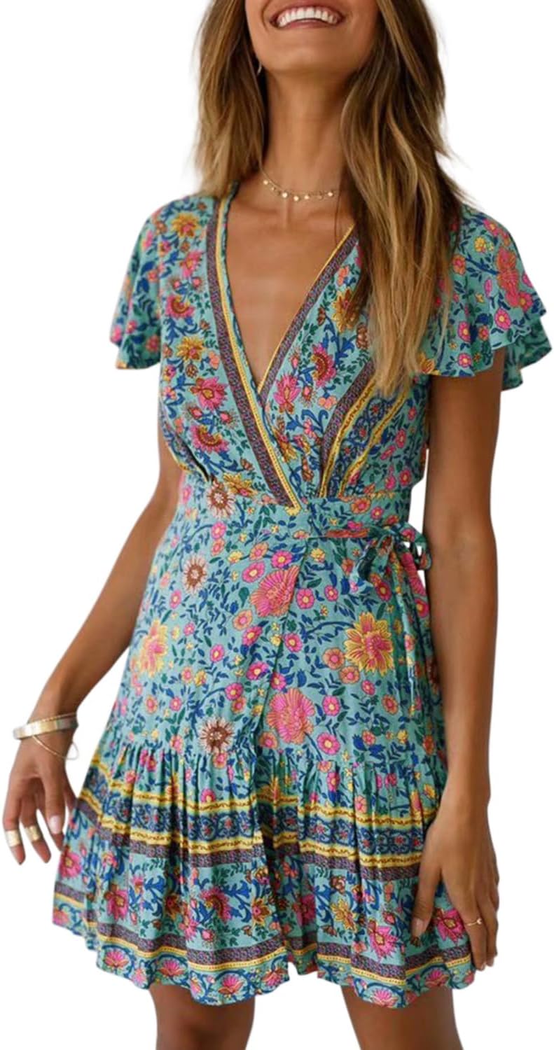ZESICA Women’s Summer Wrap V Neck Bohemian Floral Print Ruffle Swing A Line Beach Mini Dress