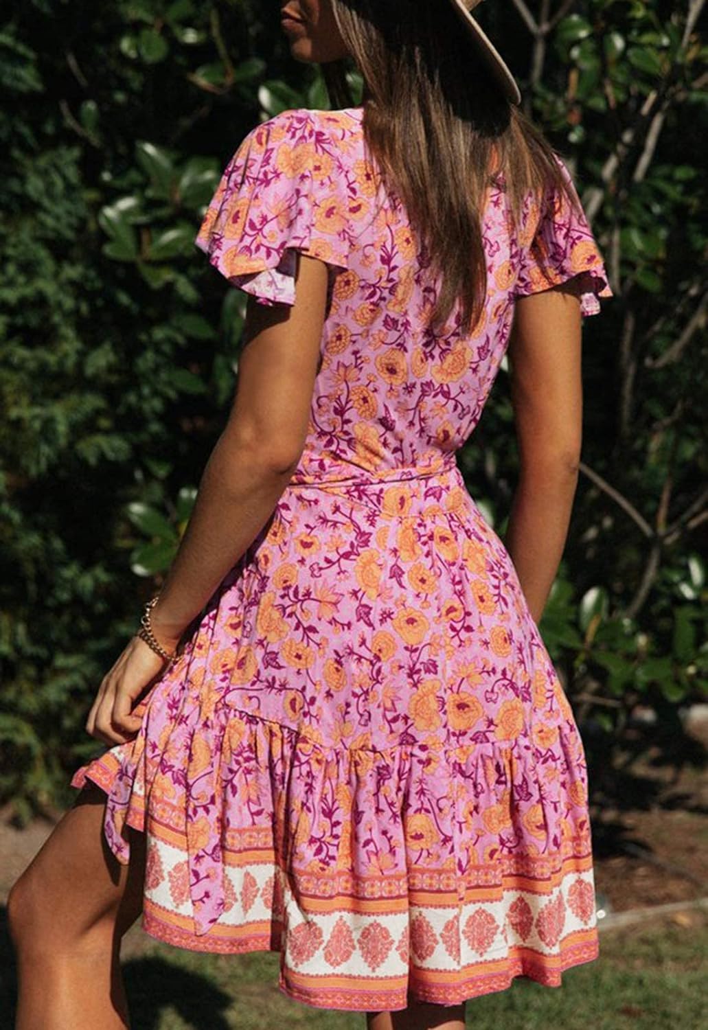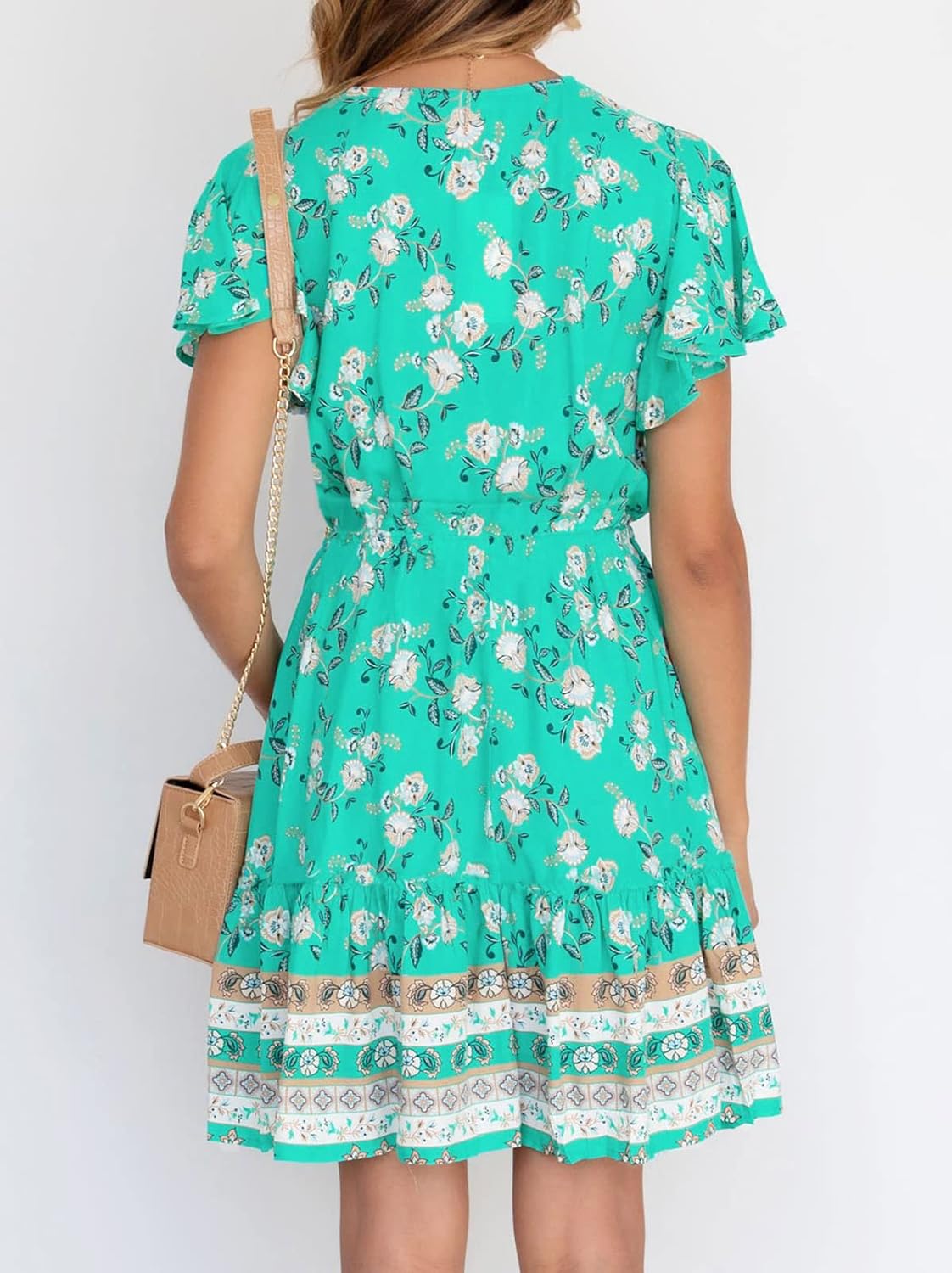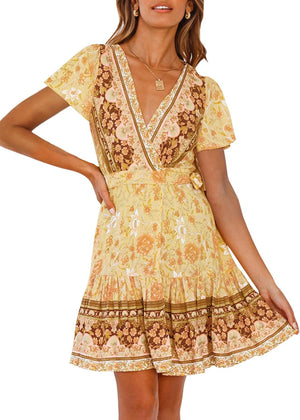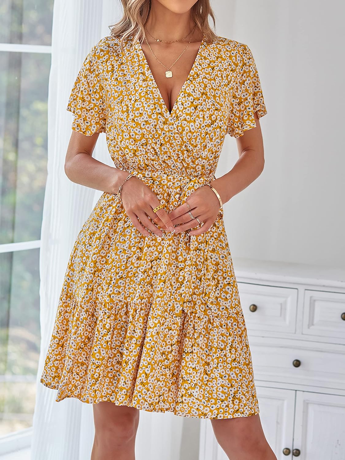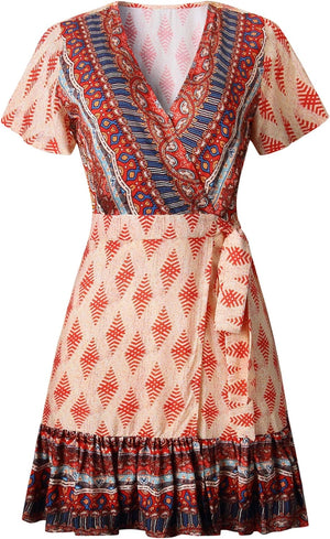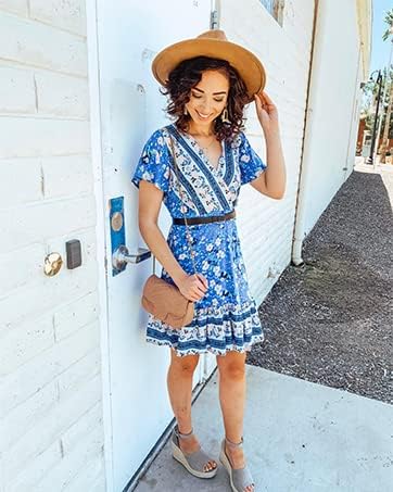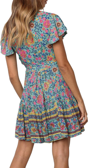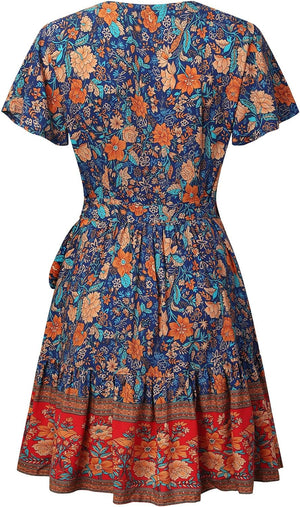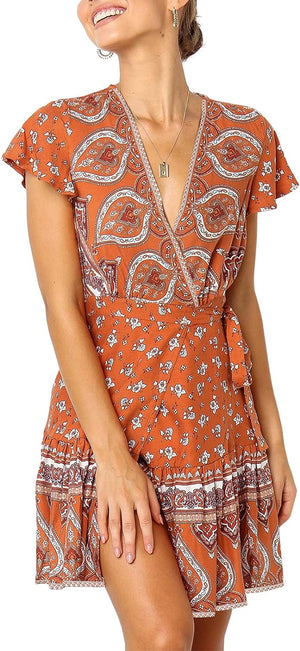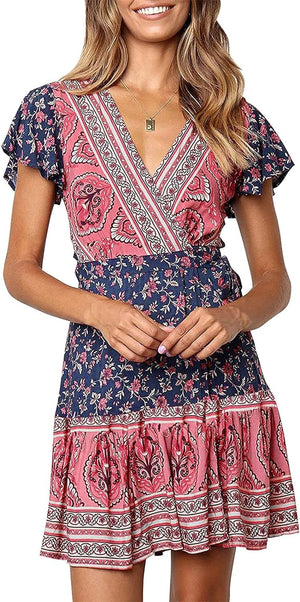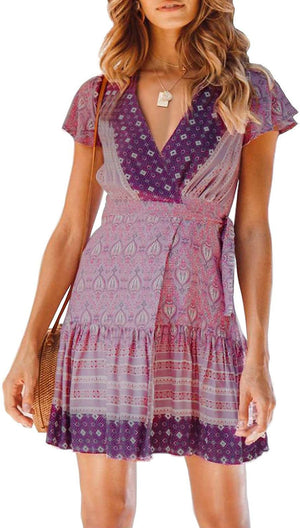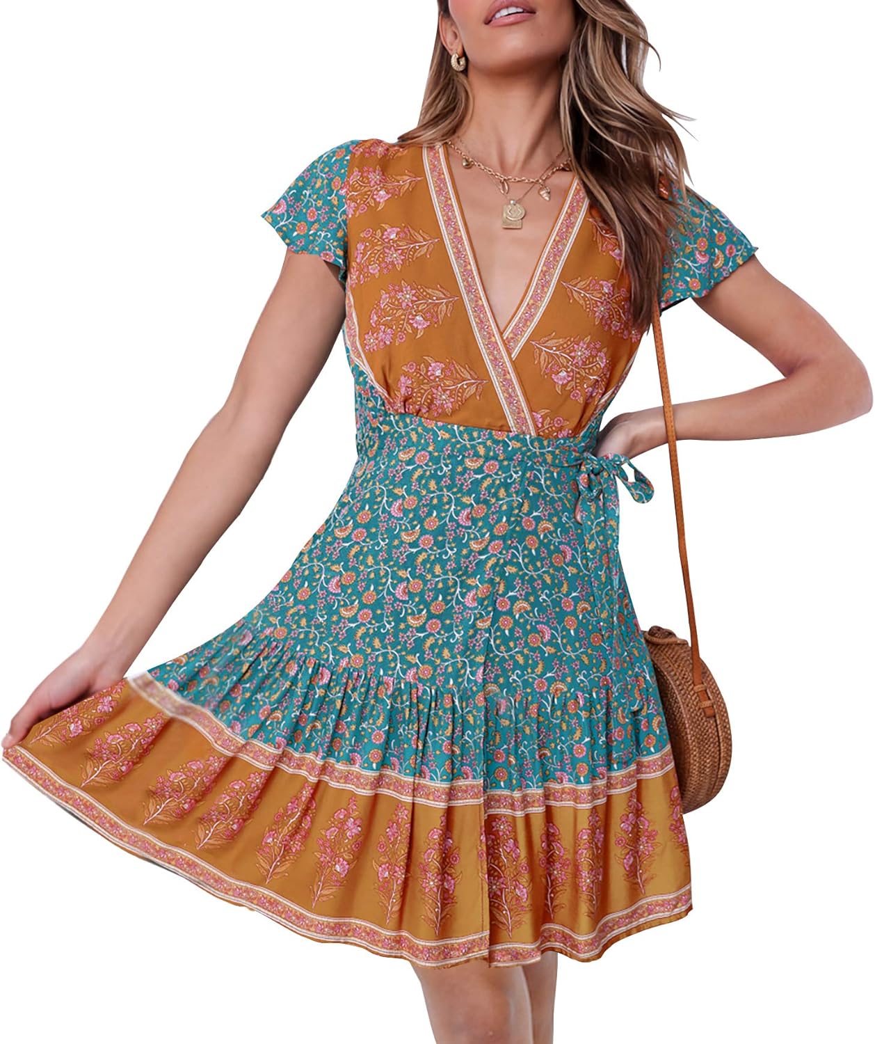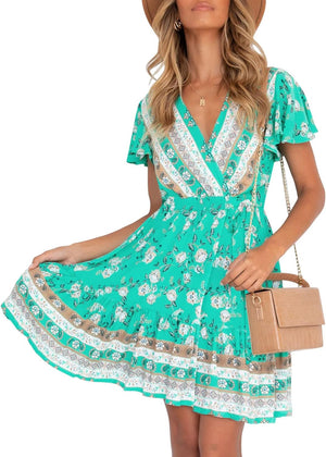 ZESICA Women’s Summer Wrap V Neck Bohemian Floral Print Ruffle Swing A Line Beach Mini Dress