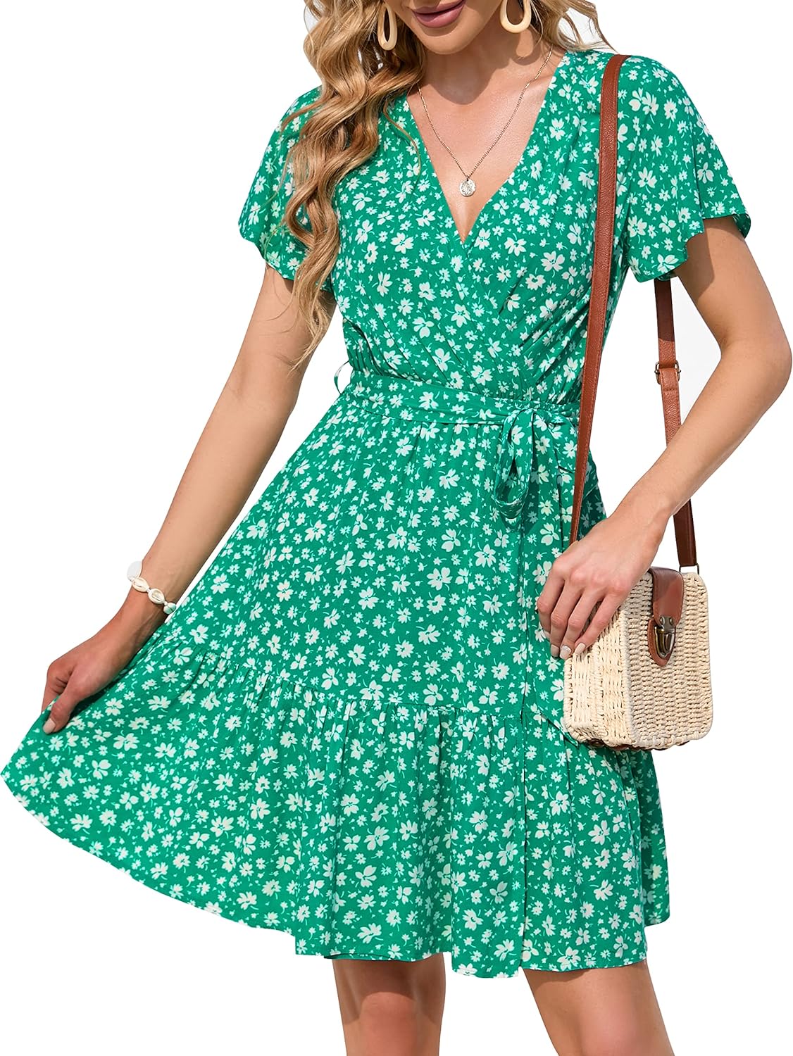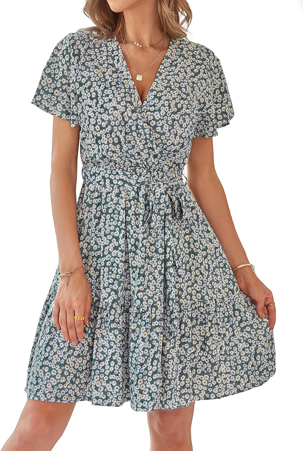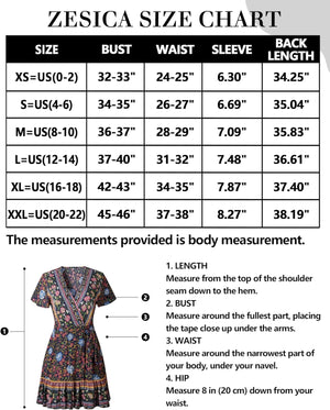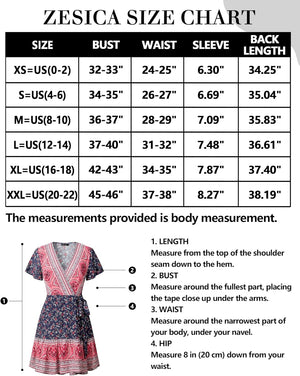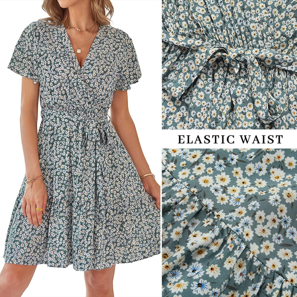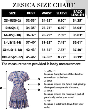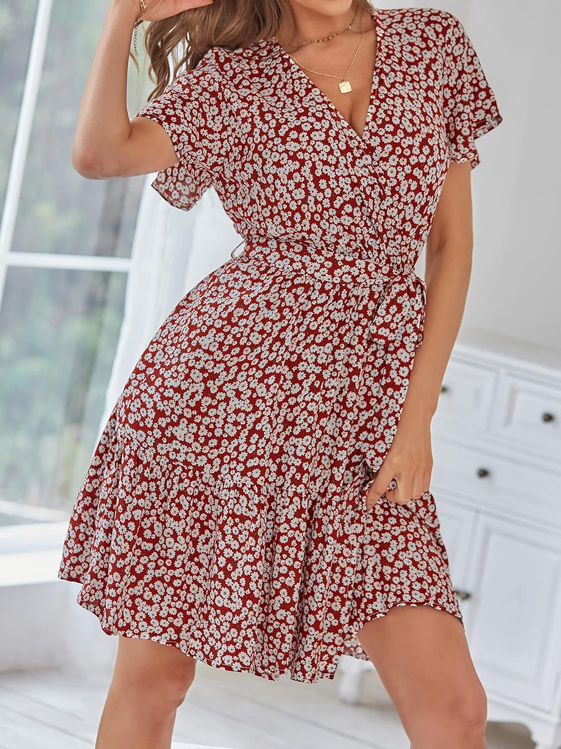 ZESICA Women’s Summer Wrap V Neck Bohemian Floral Print Ruffle Swing A Line Beach Mini Dress